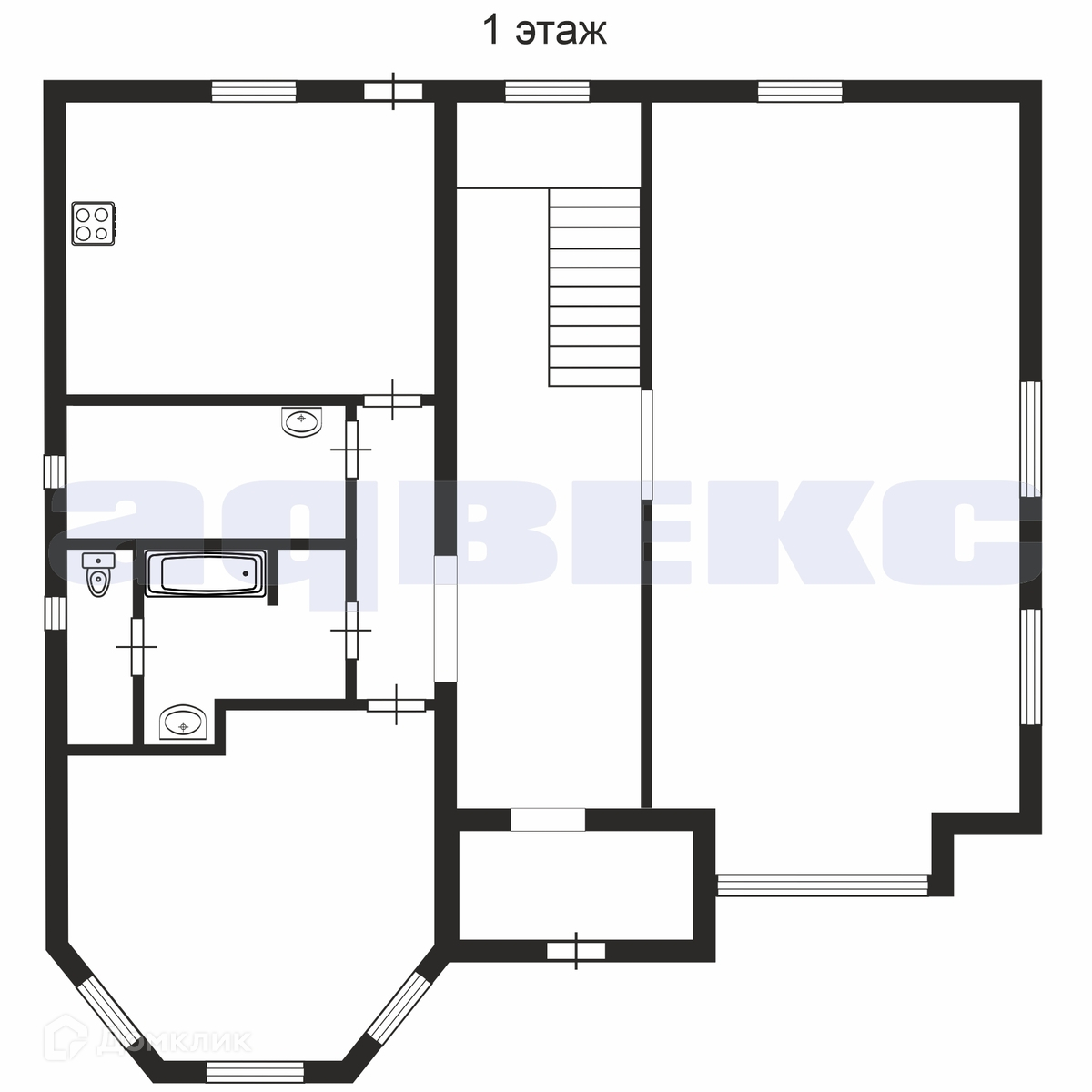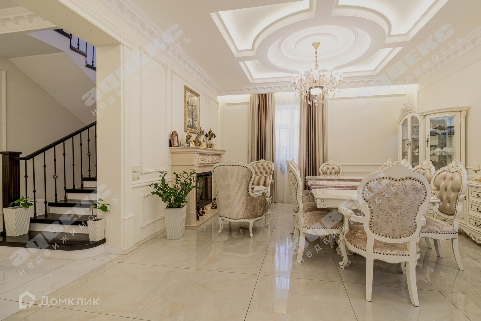 На первом этаже гостиная с камином и комната, кухня, техническая комната (котельная) и санузел. Монолитная лестница, обшитая деревом(бук), ведет на второй этаж. Под лестницей холодная кладовка для хранения заготовок.