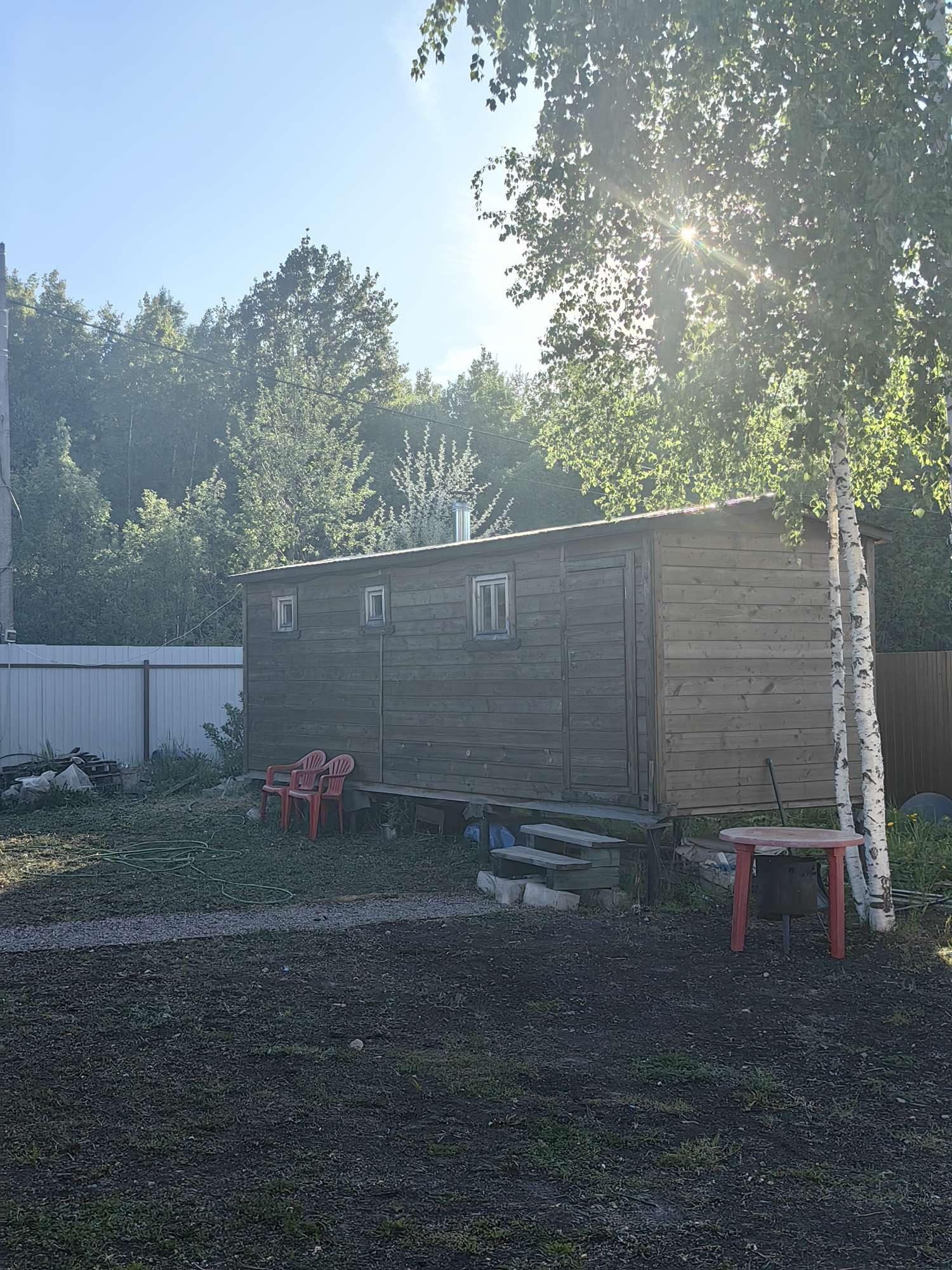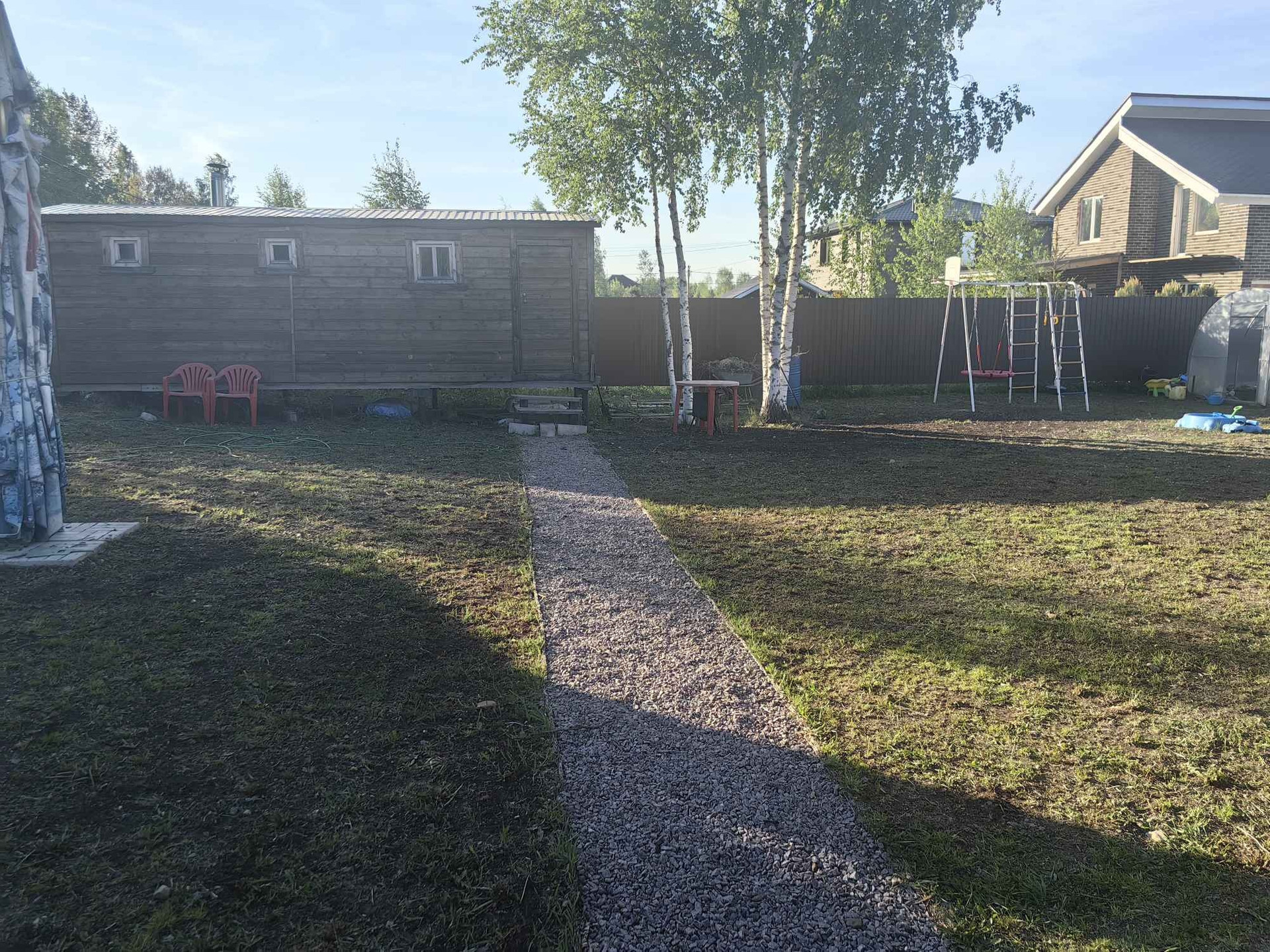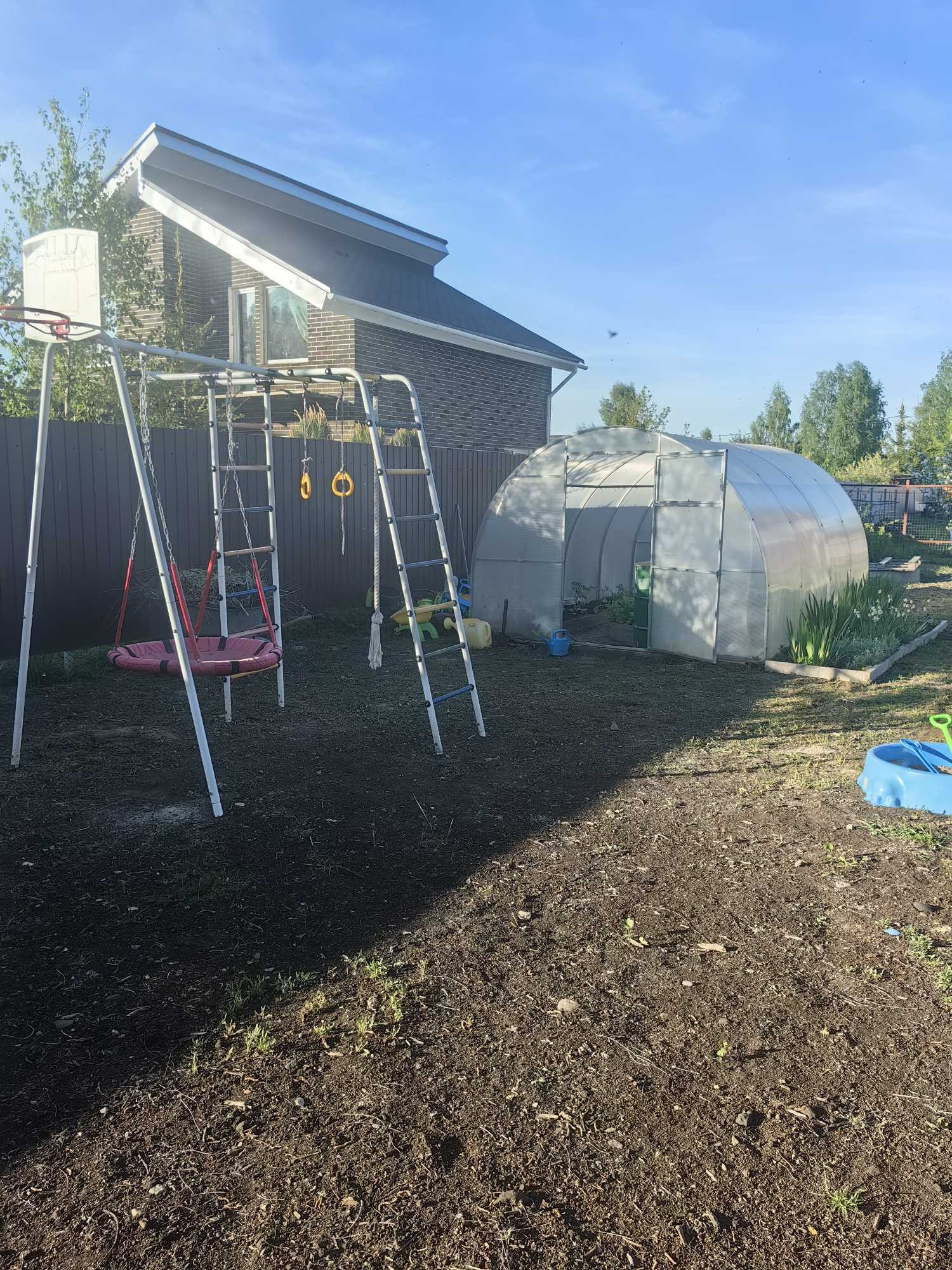 На участке забор по периметру с откатными воротами, баня, хозблок, теплица из поликарбоната, детская площадка. На участке сделан дренаж. Участок разработан. Посажены плодоносящие яблони, груши и сливы.