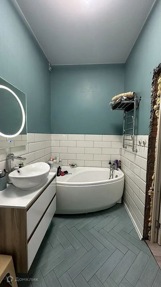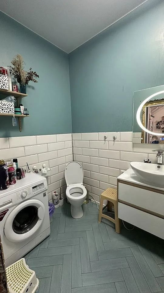 Совмещенный санузел: ванна, туалет, красивая тумба и стиральная машина - всё остается.