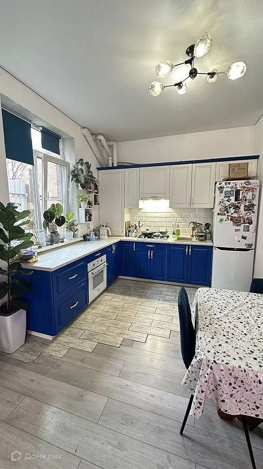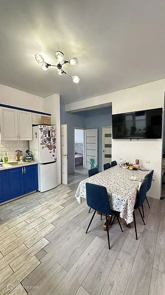 Кухня красивого цвета блюмарин, большая рабочая поверхность кухни. Остается вся техника Мidеа, холодильник. Колонна с выходом под тв.
