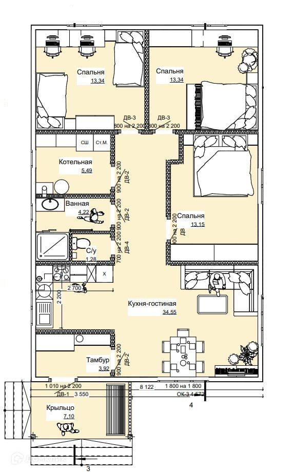 Арт. 72064898 В вашем распоряжении три полноценные спальни. Просторная светлая гостиная-кухня 35 м². Кроме того, эргономика планировки отличается просторной входной группой с холлом.