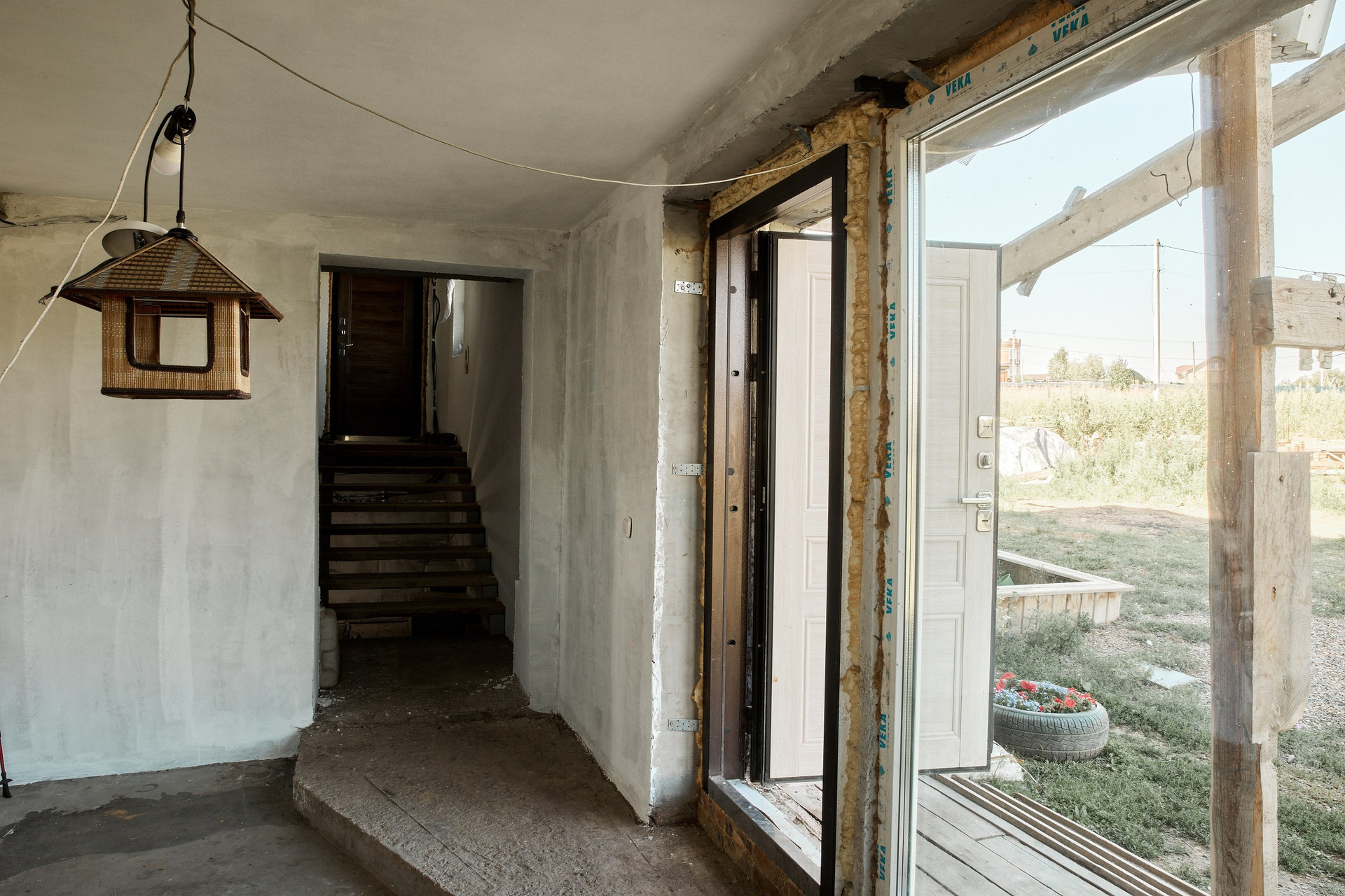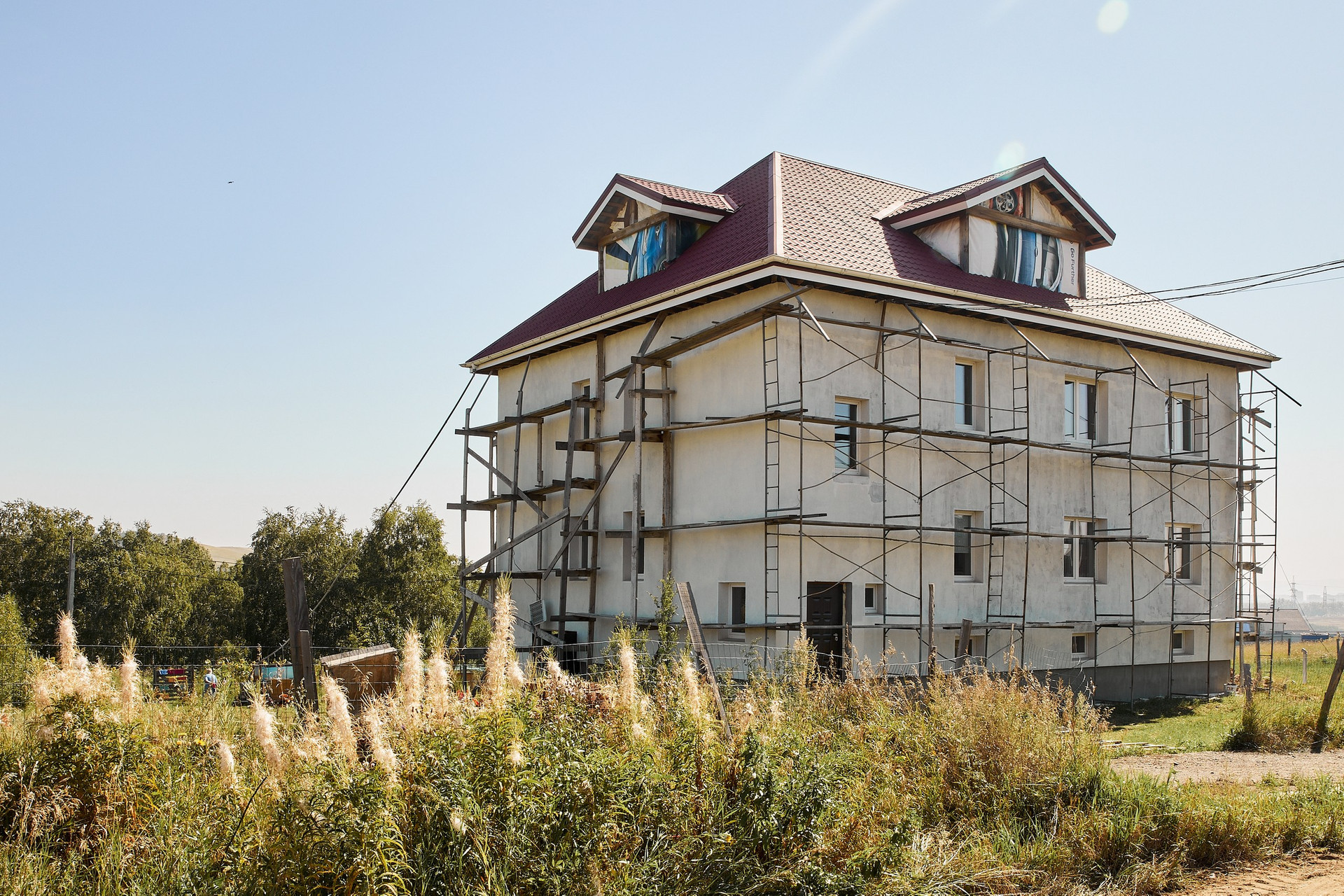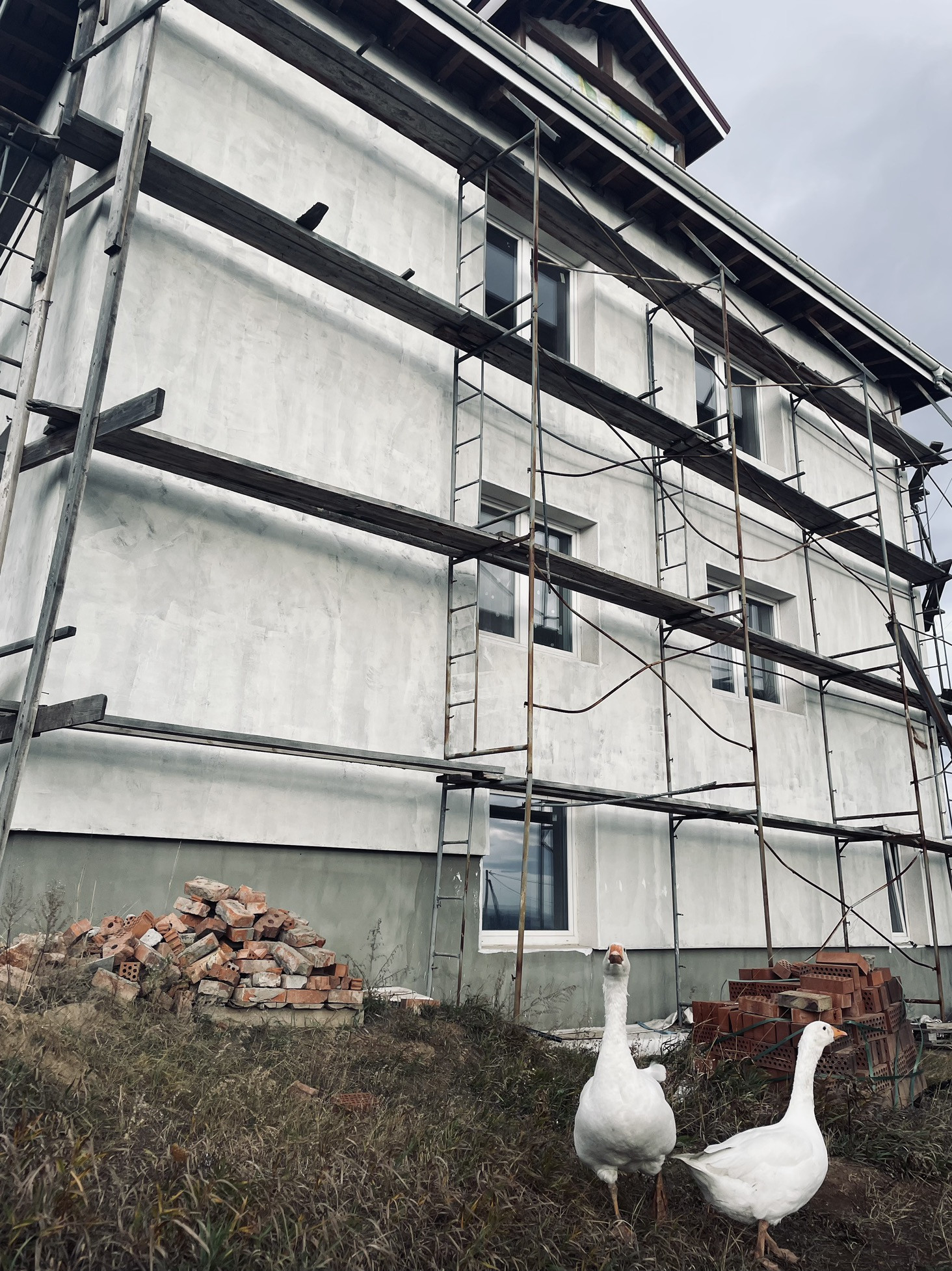 Фасад дома подготовлен под покраску или фасадную штукатурку (материал остается, есть возможность выбрать колер).