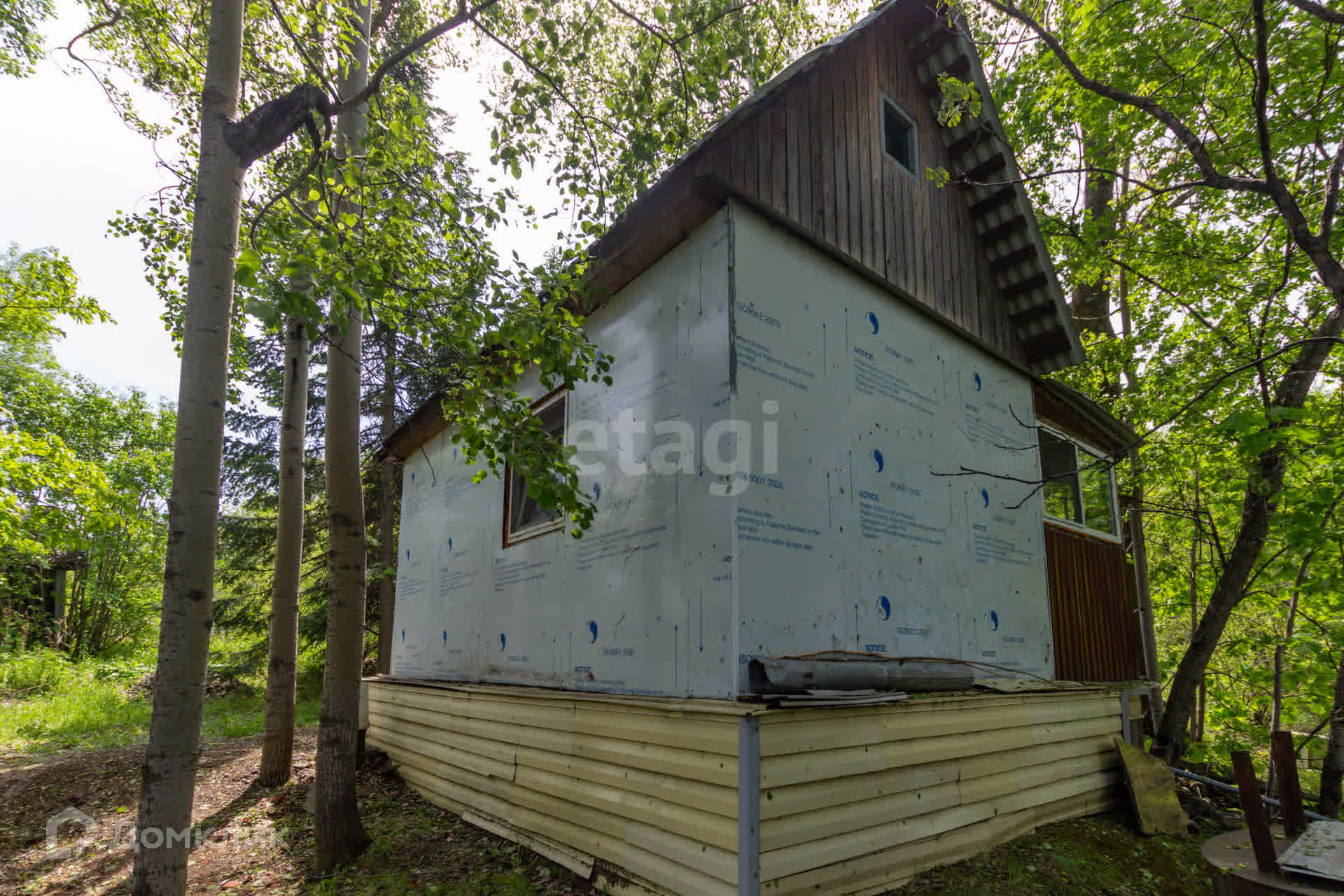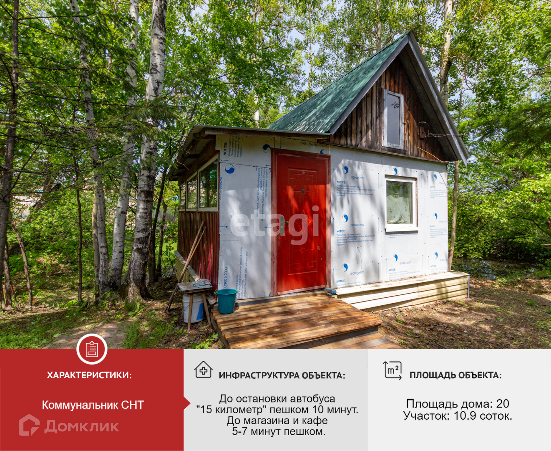 Дом 20 кв.м. из бруса, утепленный минватой на железобетонном свайном фундаменте. Электричество 15 кВт заведено в дом. В сообществе в прошлом году заменили трансформаторную подстанцию, при необходимости есть возможность увеличить мощность.