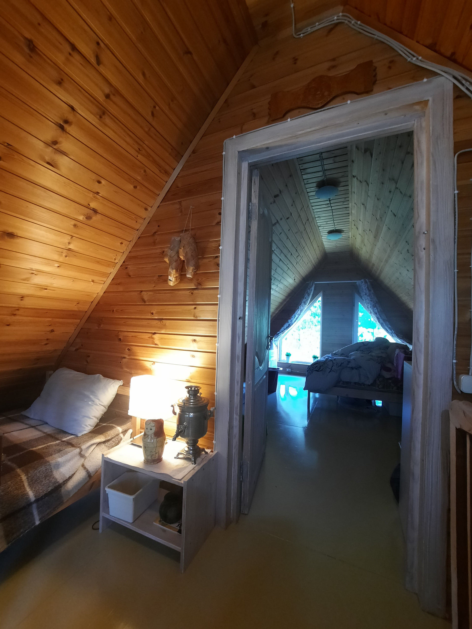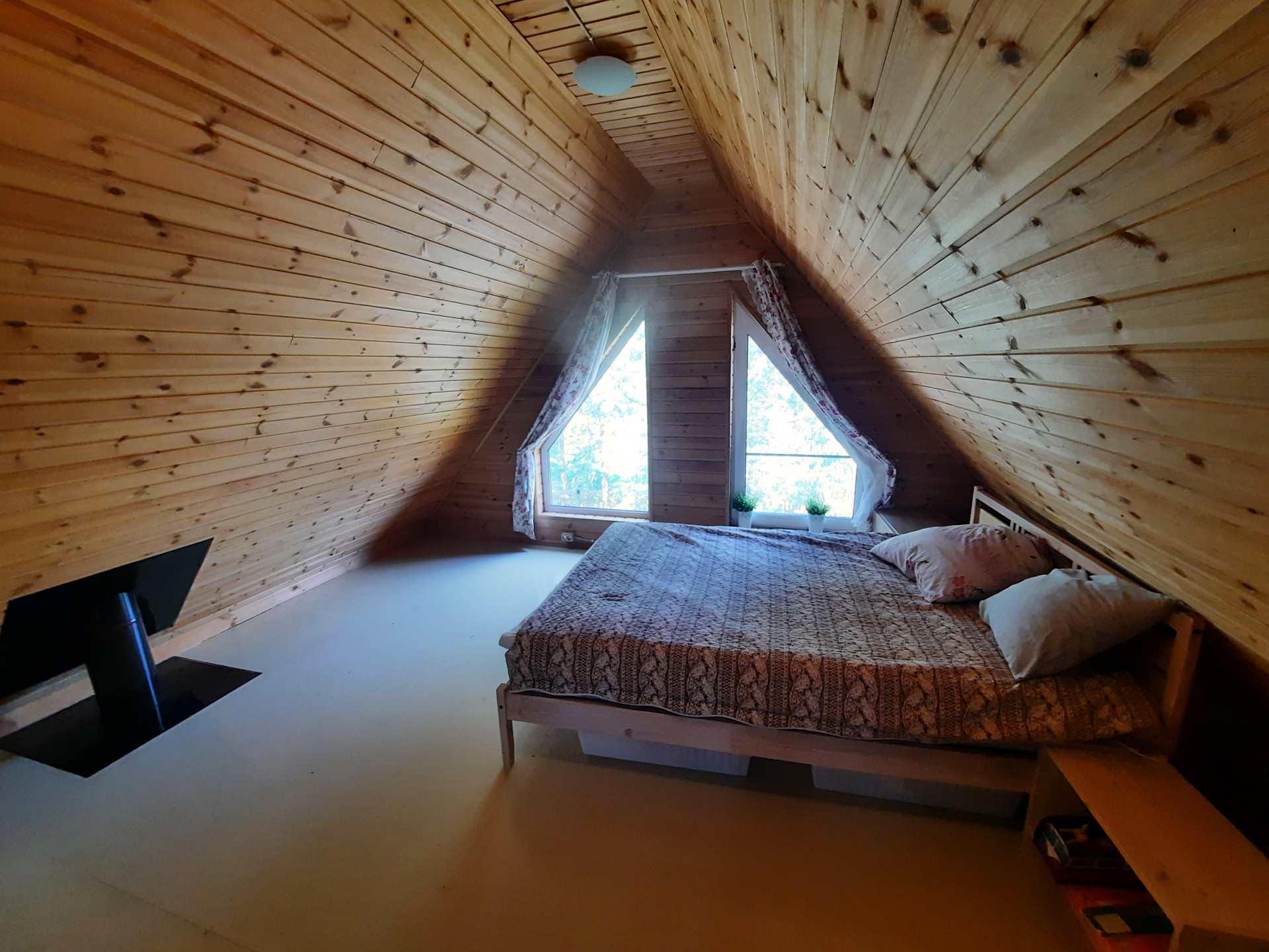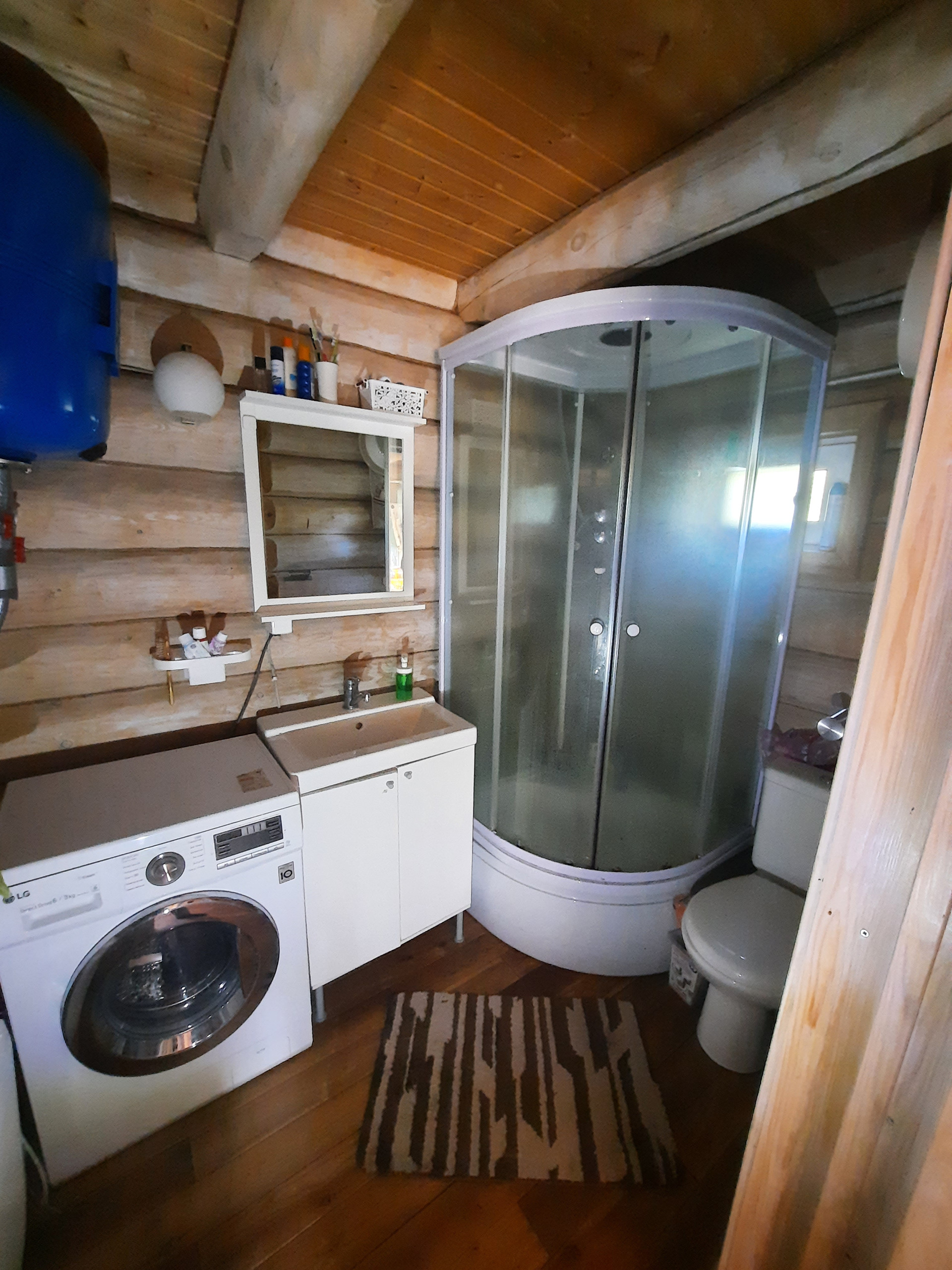 Дом: из бревна ручной рубки. Фундамент: свайно-винтовой, крыша – финская металлочерепеца. Отопление: тепловой насос, камин, конвекторы. Все удобства в доме, установлена система глубокой  очистки воды.  Дом построен в 2013 году. Внешние размеры дома: 6 на 6 метра, первый этаж: веранда, кухня-гостиная, ванная. Второй этаж: небольшой коридор и спальня.