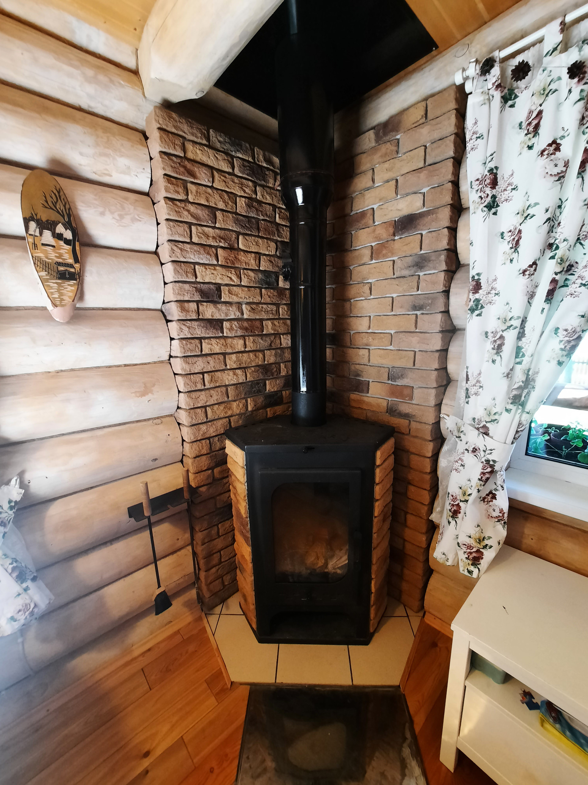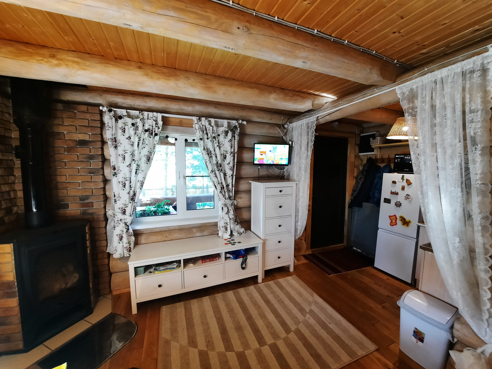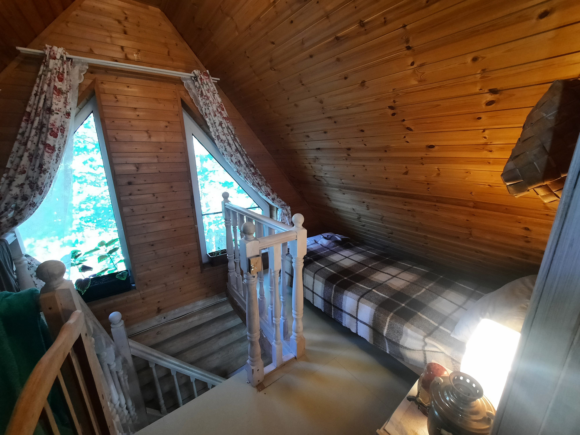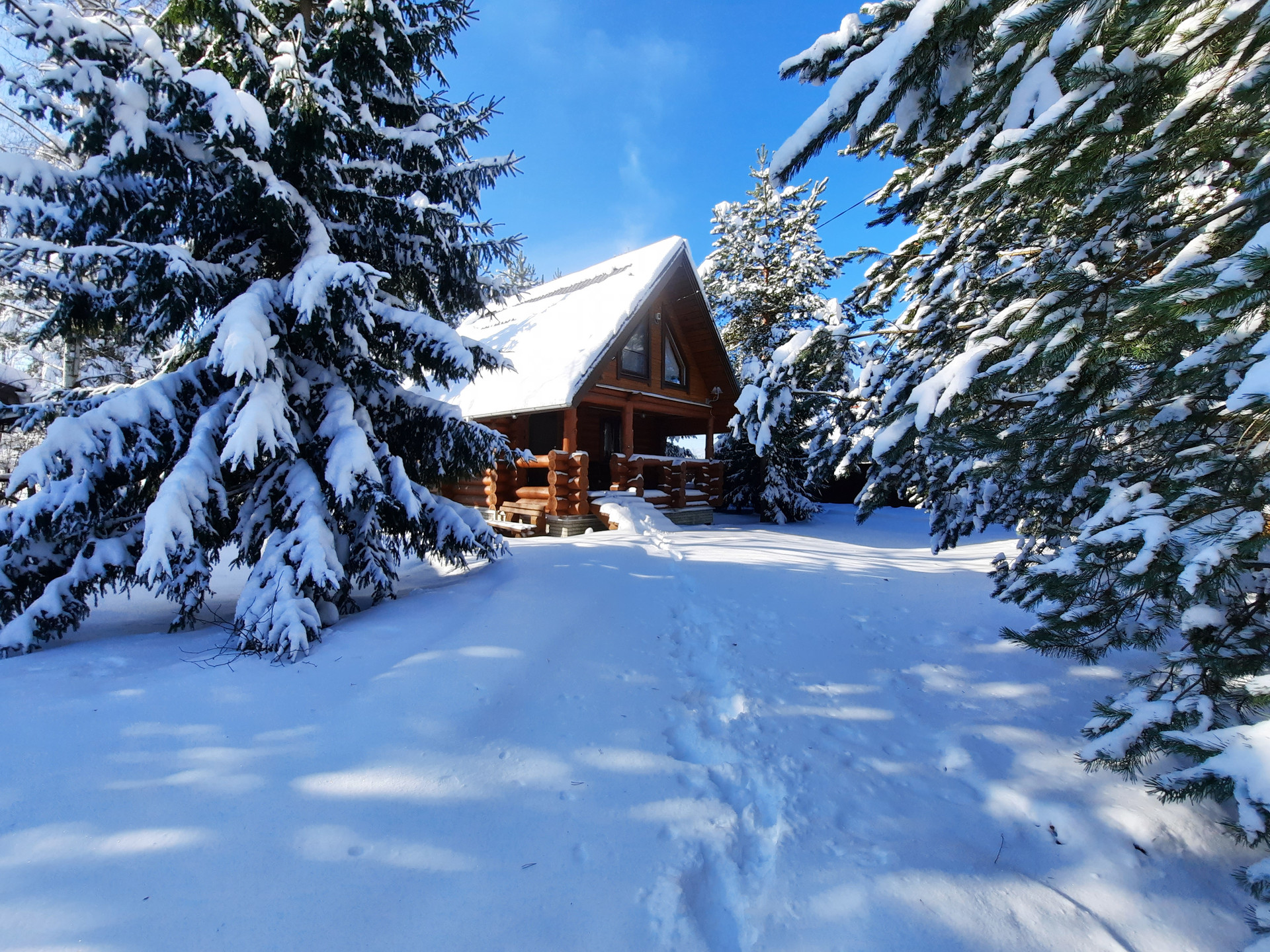 Дом: из бревна ручной рубки. Фундамент: свайно-винтовой, крыша – финская металлочерепеца. Отопление: тепловой насос, камин, конвекторы. Все удобства в доме, установлена система глубокой  очистки воды.  Дом построен в 2013 году. Внешние размеры дома: 6 на 6 метра, первый этаж: веранда, кухня-гостиная, ванная. Второй этаж: небольшой коридор и спальня.