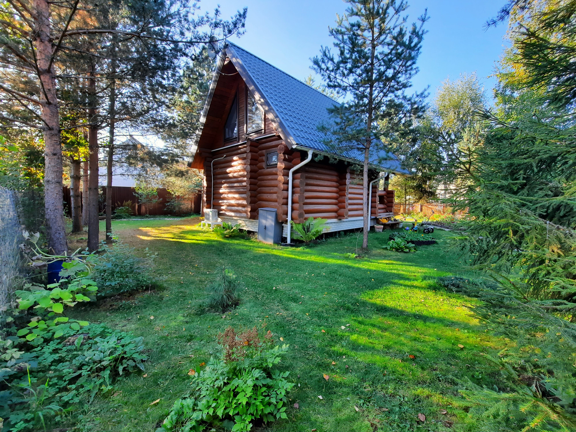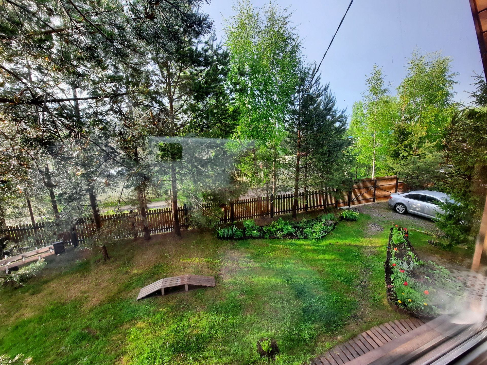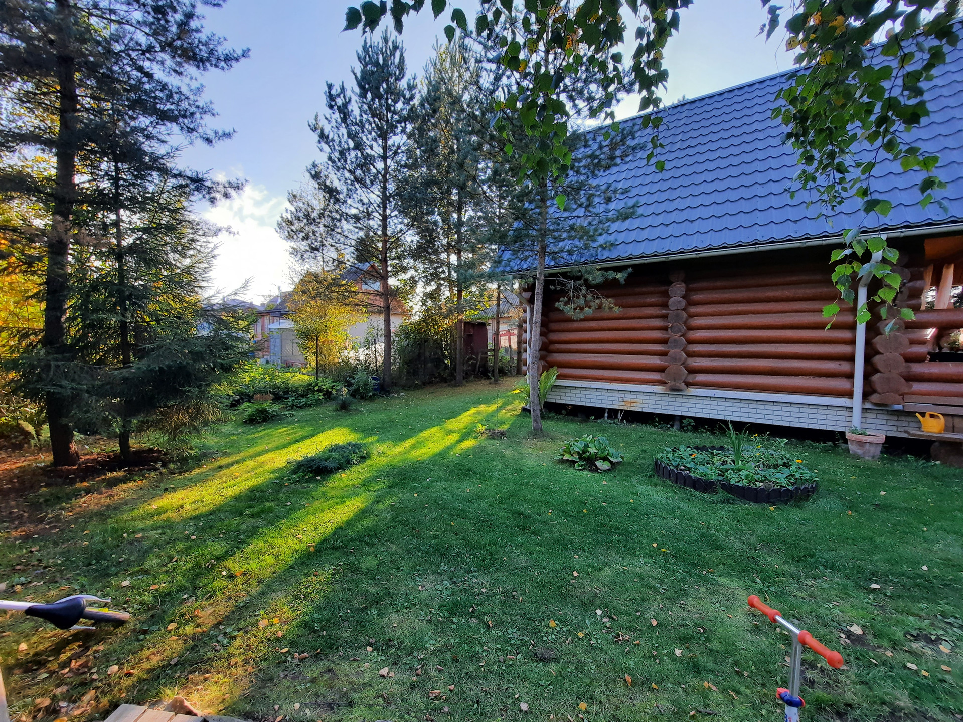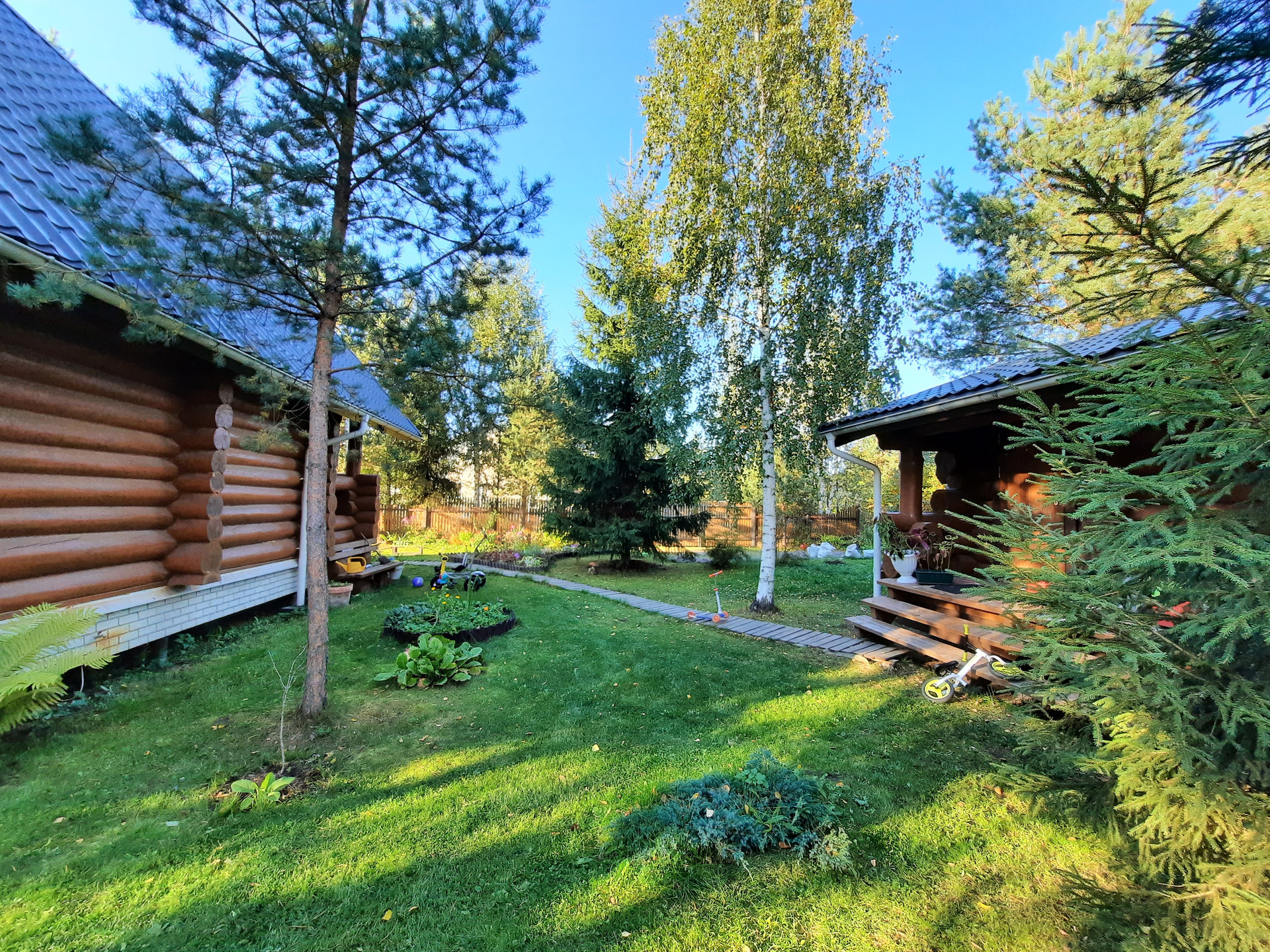 Участок: отличное сочетание настоящей лесной природы и цветущего сада. На участке более 30 взрослых деревьев,  высажены кустарники, клумбы, устроен газон с парковкой.