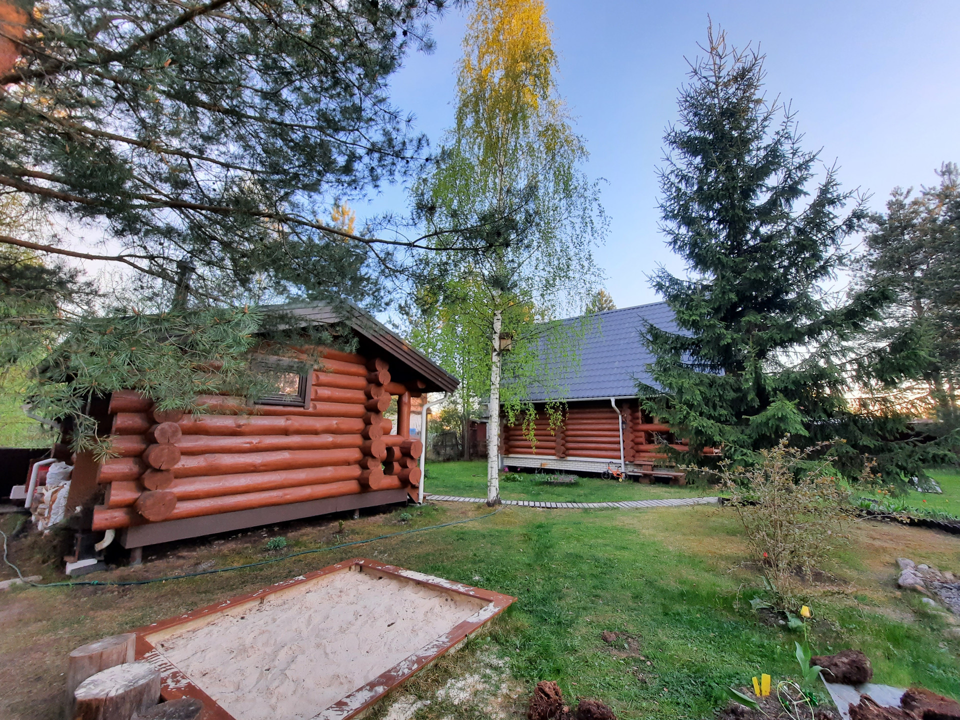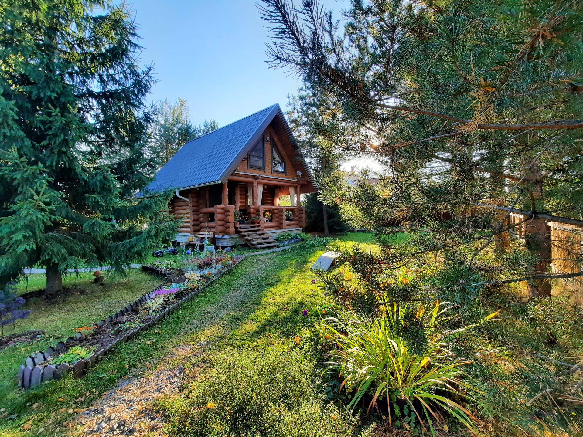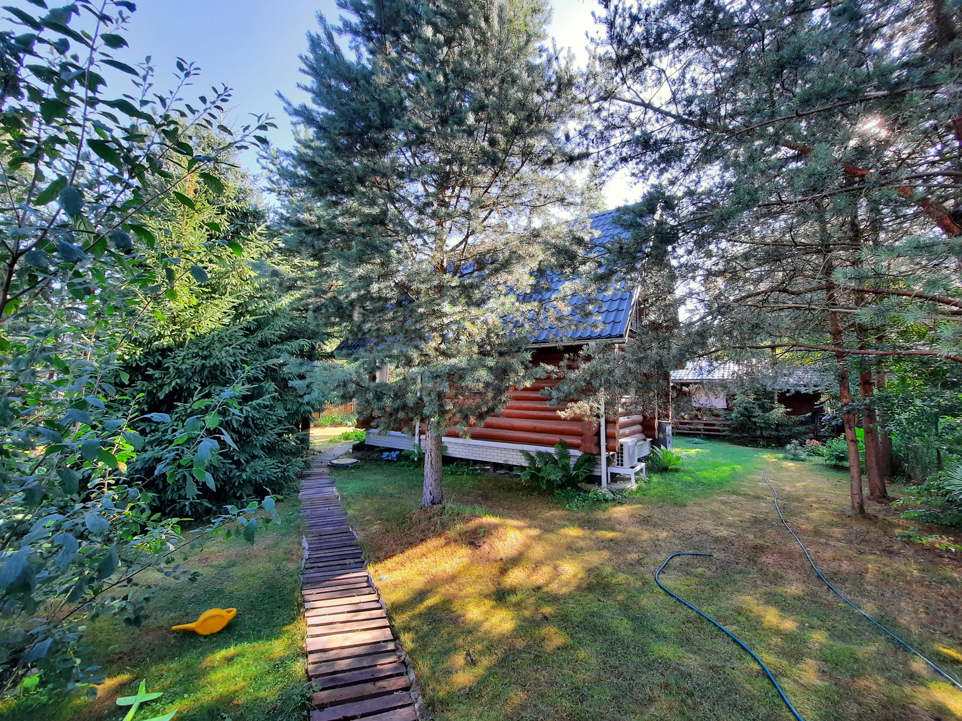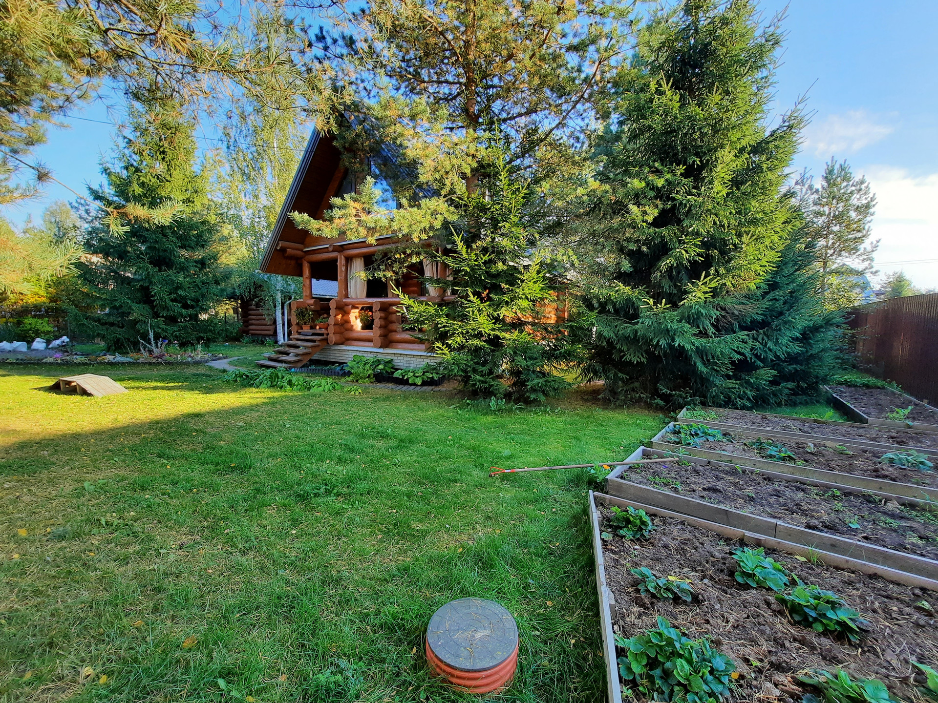 Участок: отличное сочетание настоящей лесной природы и цветущего сада. На участке более 30 взрослых деревьев,  высажены кустарники, клумбы, устроен газон с парковкой.