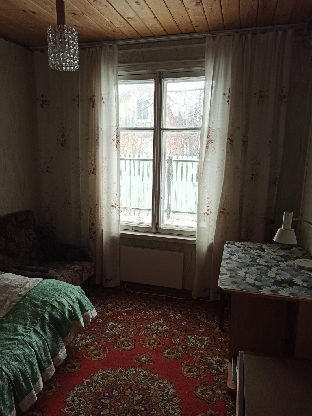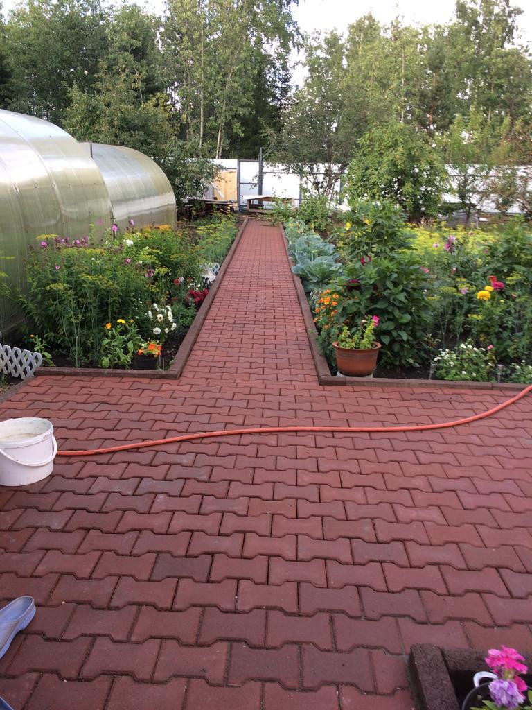 В окружении зелени ровный, ухоженный, красивый участок. Что на нём? Жаркая банька, гараж, две теплицы, хозпостройка для дров и инвентаря; плодовые деревья и кустарники, сосны и елки, клумбы с цветами, несколько грядок; весь двор и дорожки вымощены брусчаткой. Вход на участок с двух сторон (ворота и калитка). Проезд круглый год.