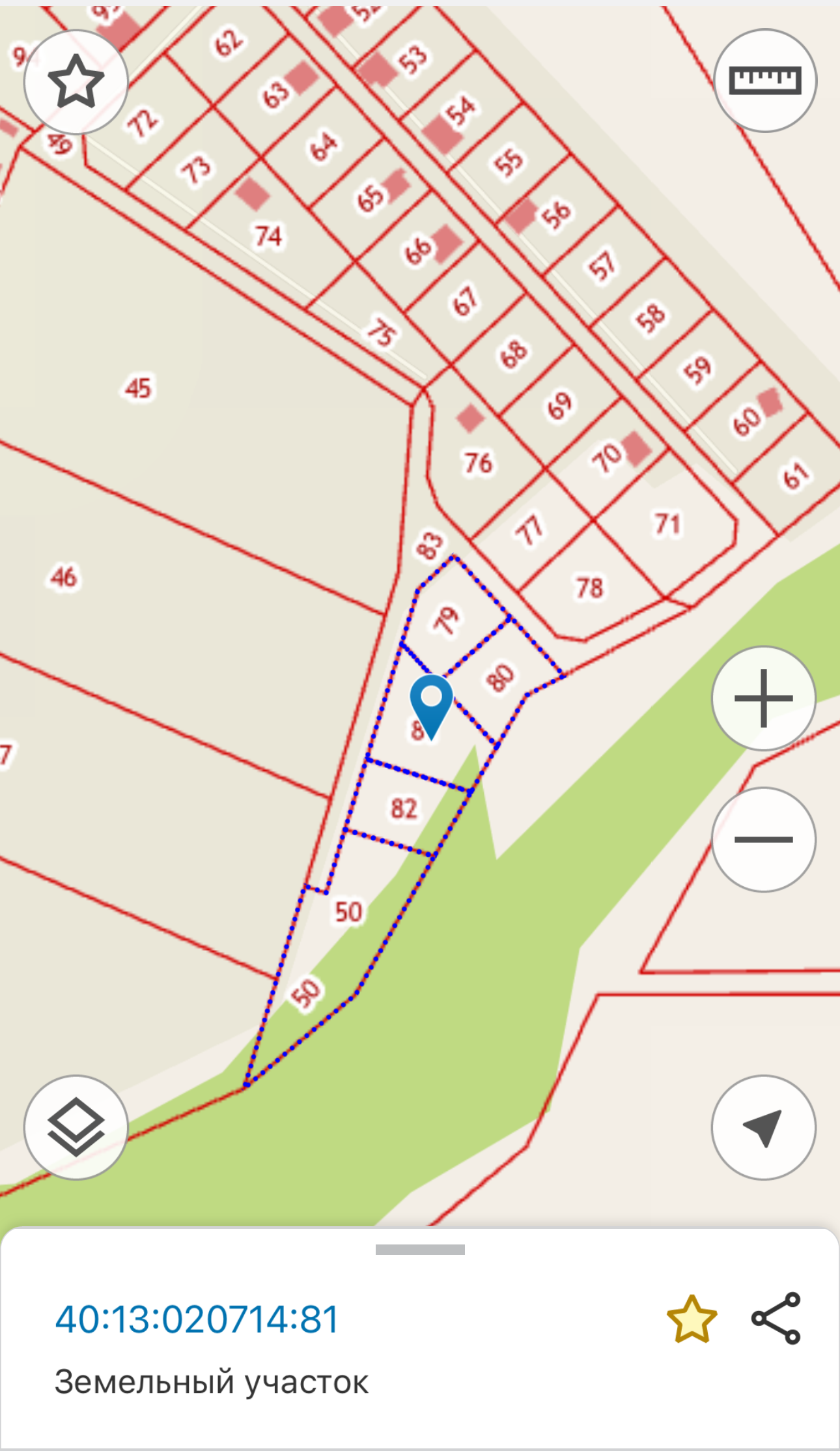 Участок ровный, сухой, граничит с лесополосой. Коммуникации по границе (свет/вода). Возможно увеличение площади. Продаем соседние участки (40:13:020714:81, 40:13:020714:80, 40:13:020714:82, 40:13:020714:50).