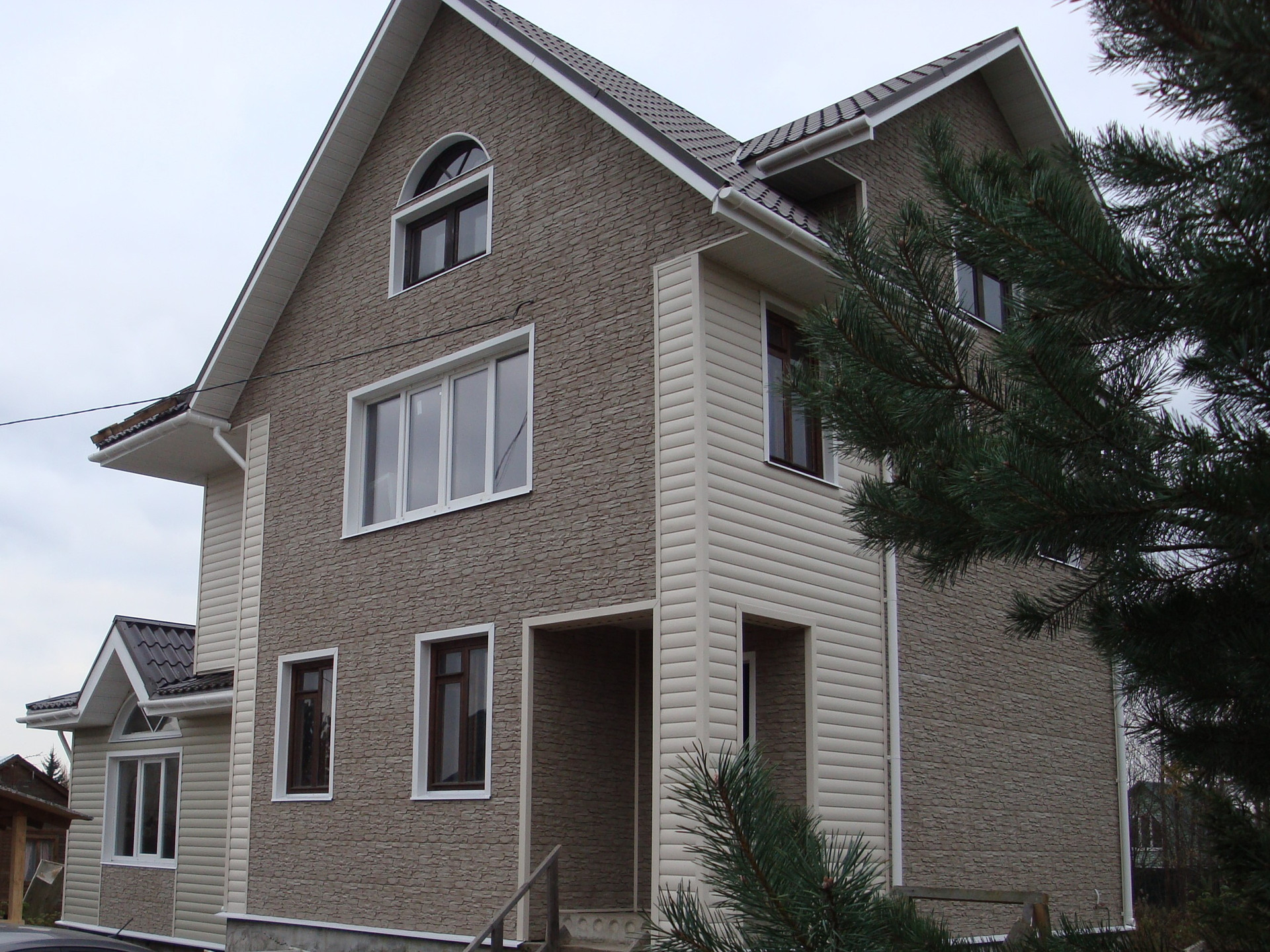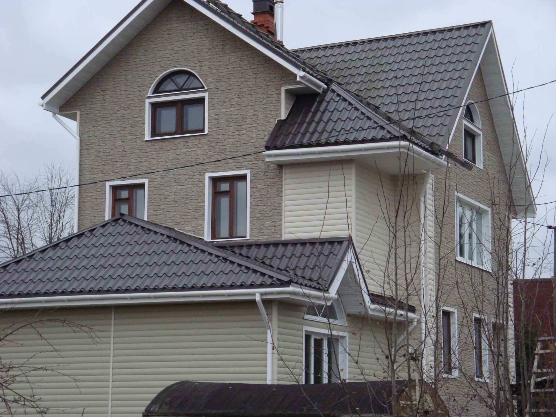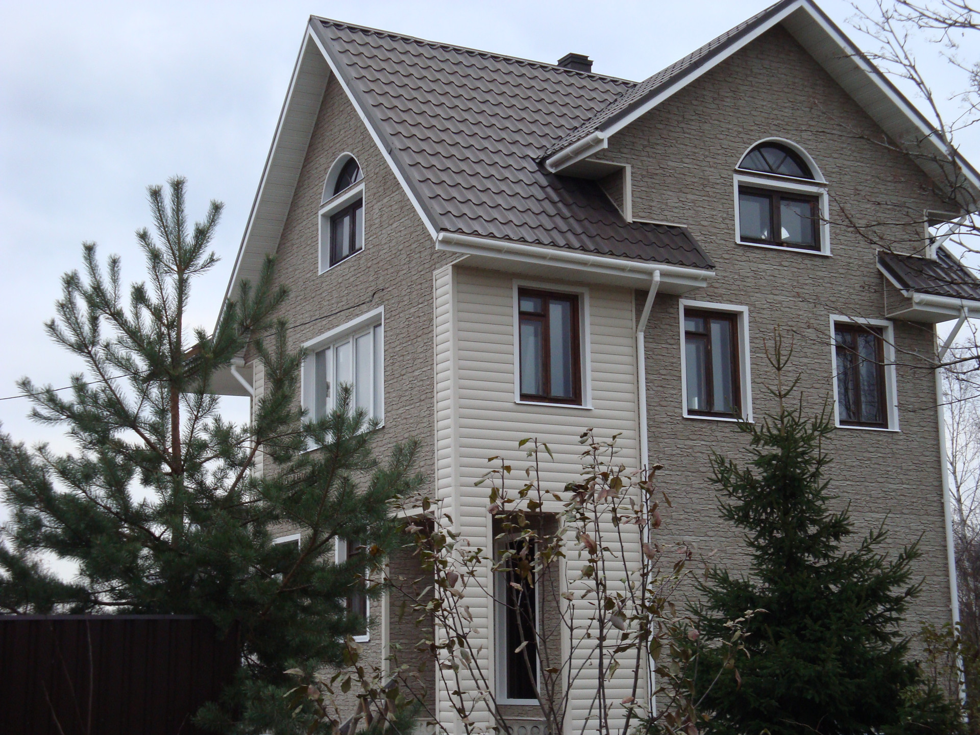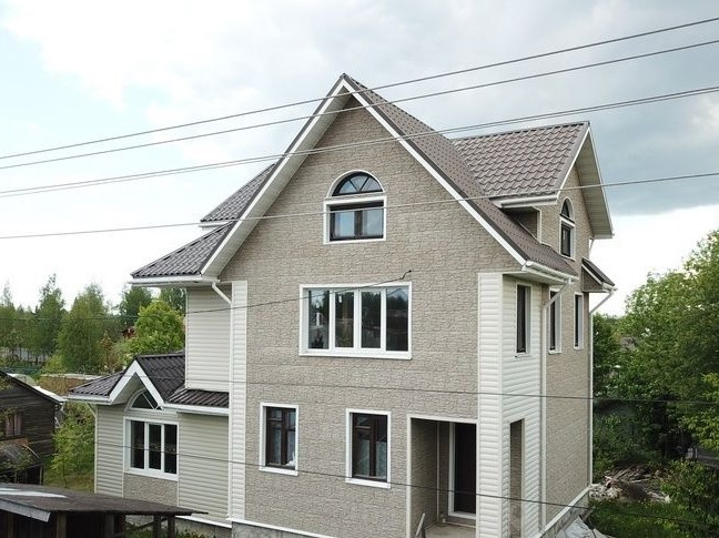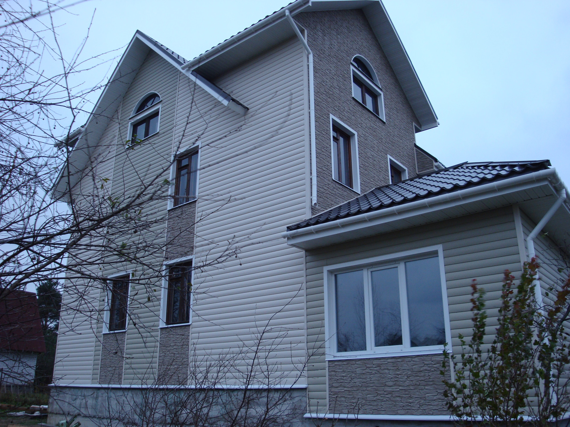 Дом из бруса 150×150 на песчано-щебенчатой подушке, ленточный фундамент + бетонные блоки. Кровля - финская металлочерепица. Дом зимний, для круглогодичного проживания, утеплен, обшит сайдингом.