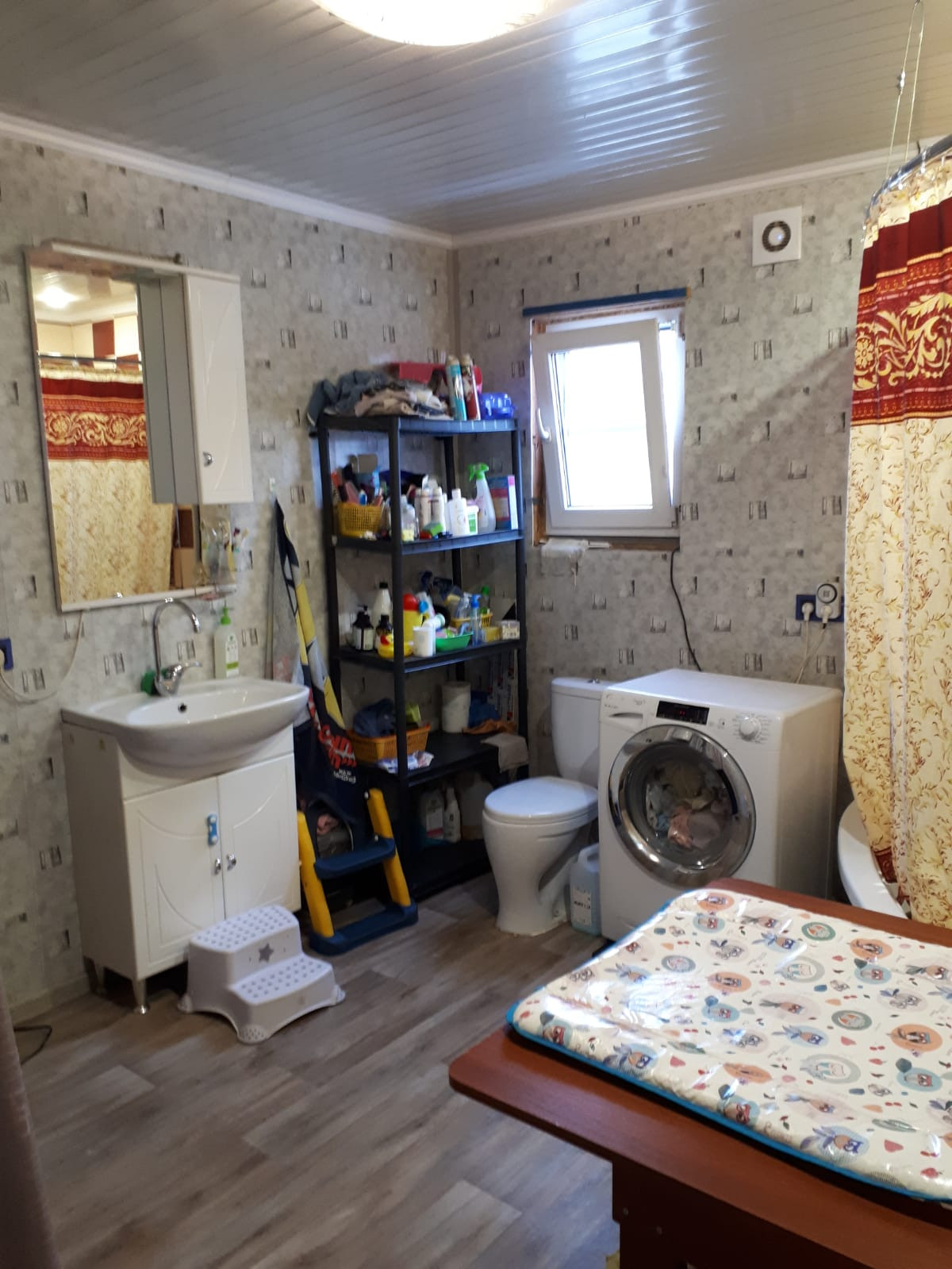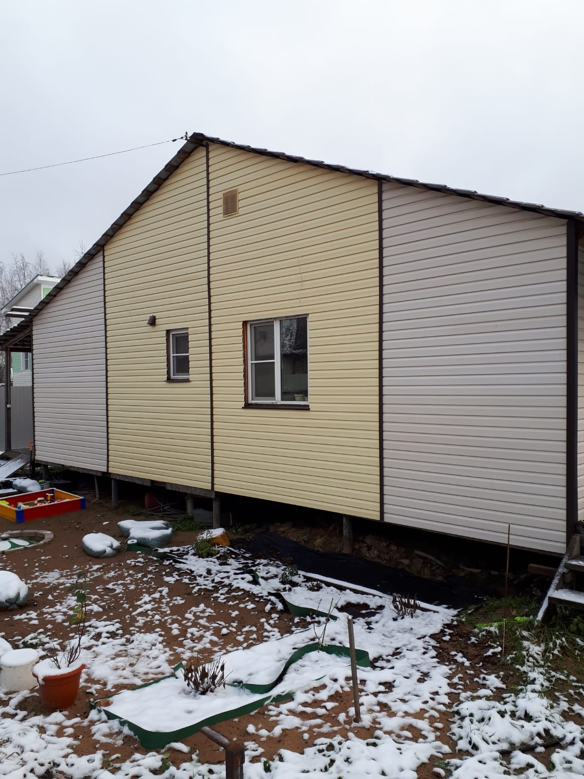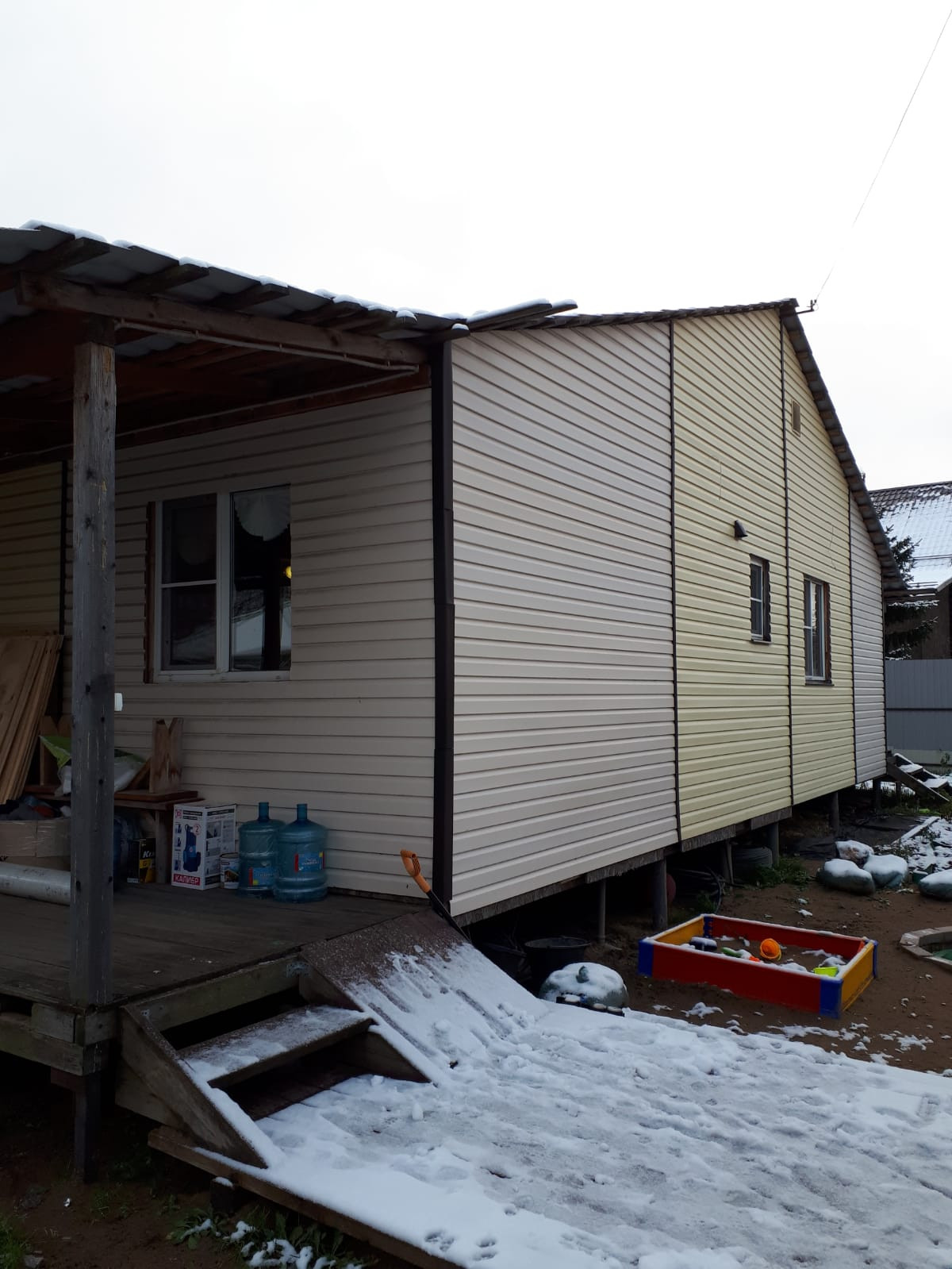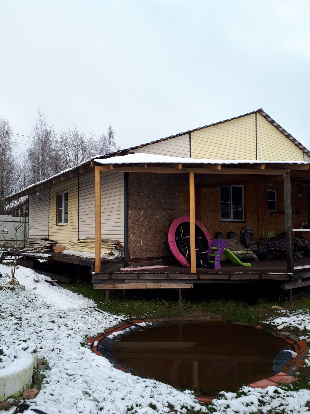 Дом каркасный на свайном фундаменте. утеплен роквулом, обшит сайдингом. Крыша металлочерепица. По периметру дома с трех сторон терасса шириной 3 м с крышей. В дом подведена вода из колодца, канализация ( установлен септик), отопление от эл. котла. Теплые полы во всем доме.