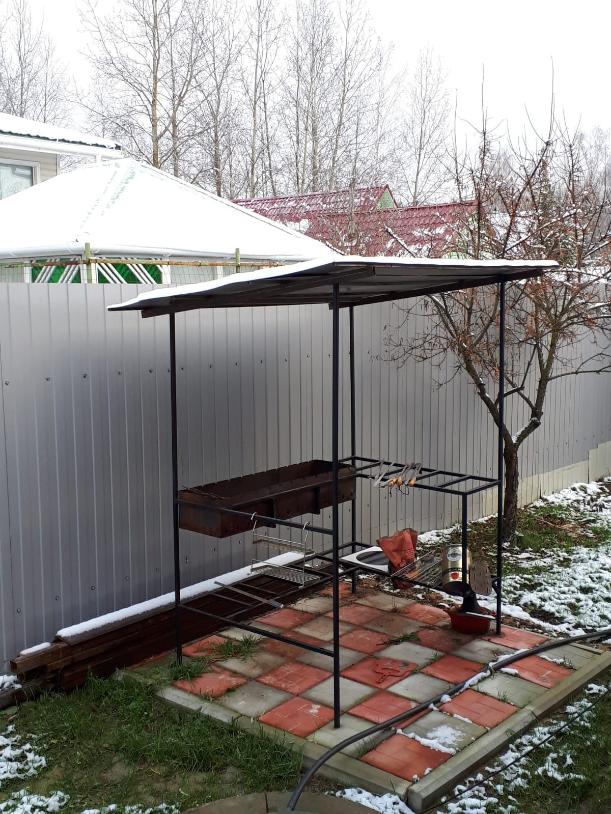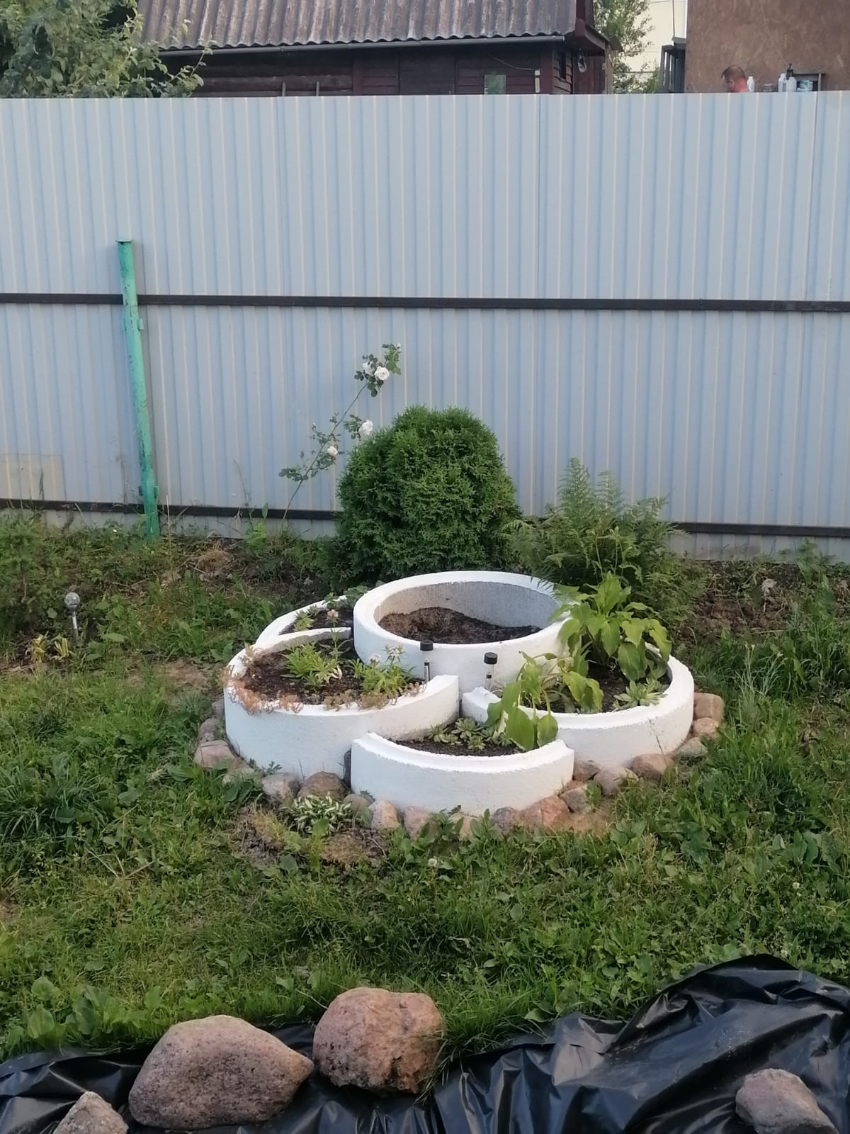 Участок правильной формы, огорожен со всех сторон забором из профнастила. На участке оборудована мангальная зона, растут плодовые деревья и кустарники, оборудован декоративный водоем, много цветов.