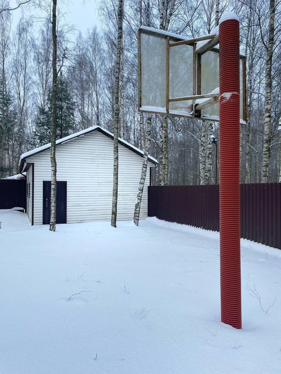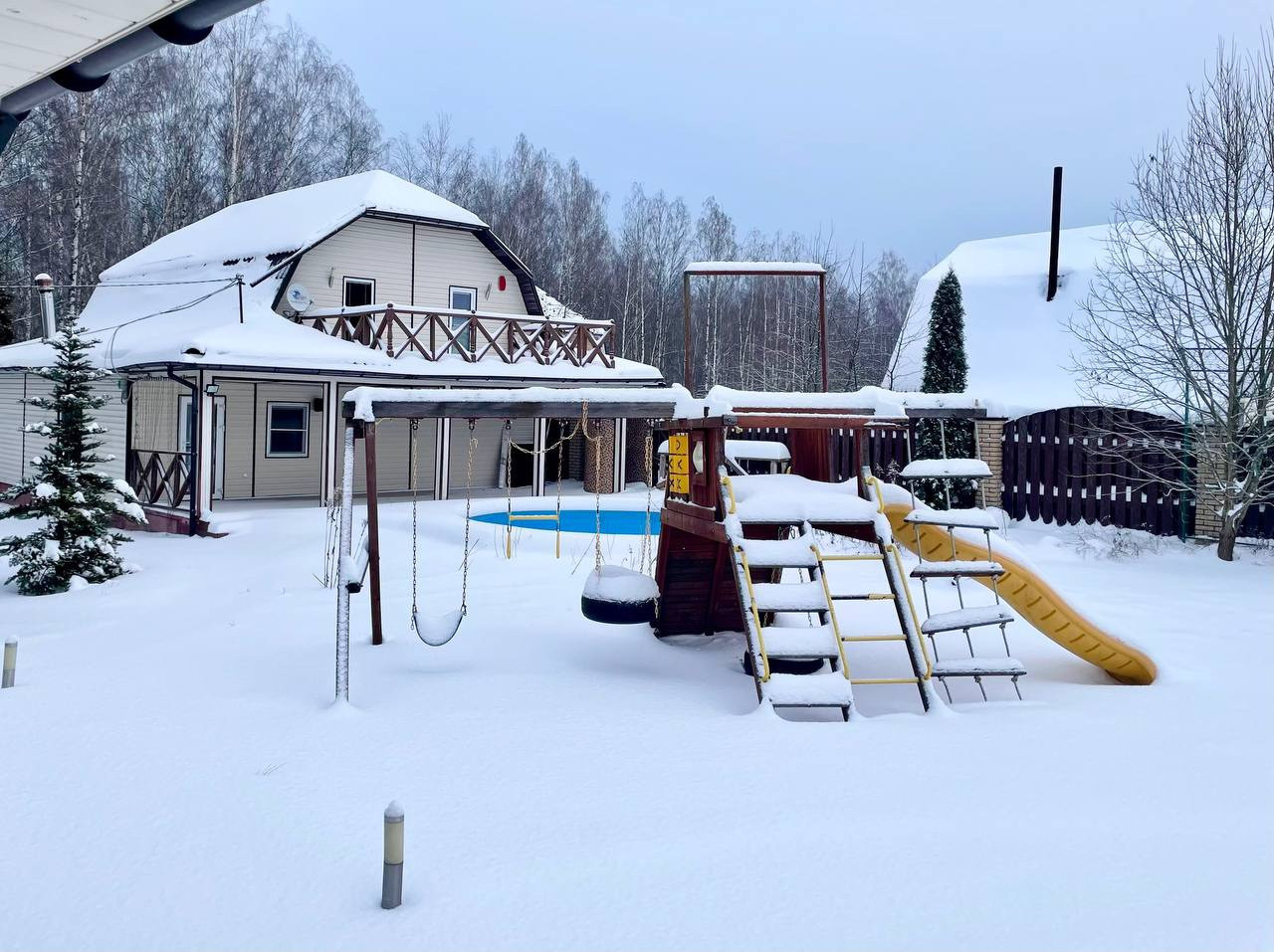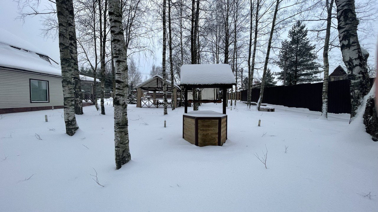 Дренаж, детская площадка, стационарный бассейн с летним душем, дорожки, выложенные плитками. На участке есть березовая роща с беседкой.