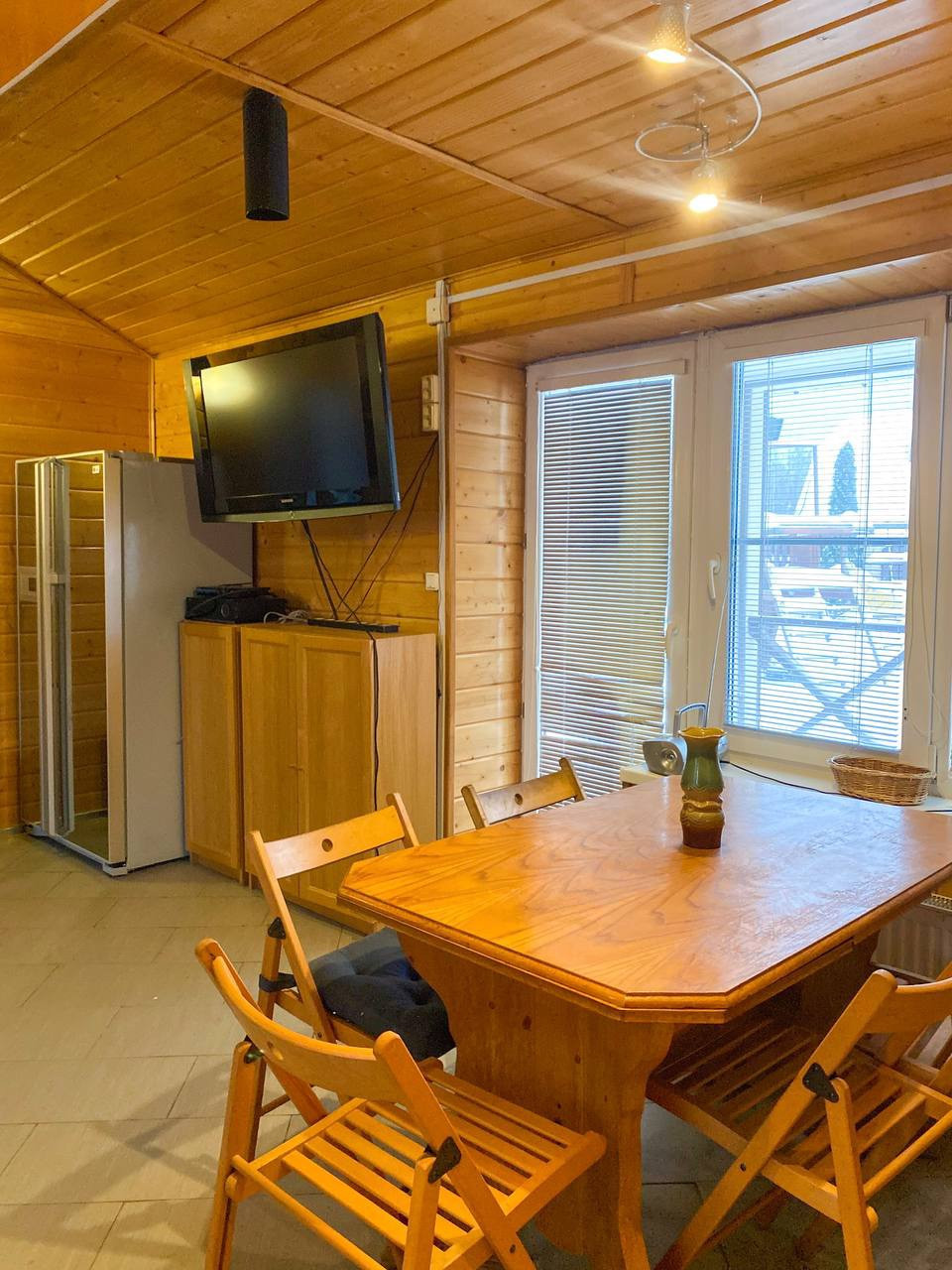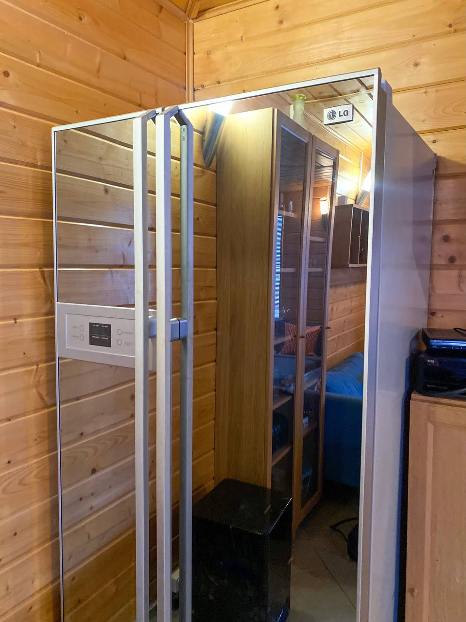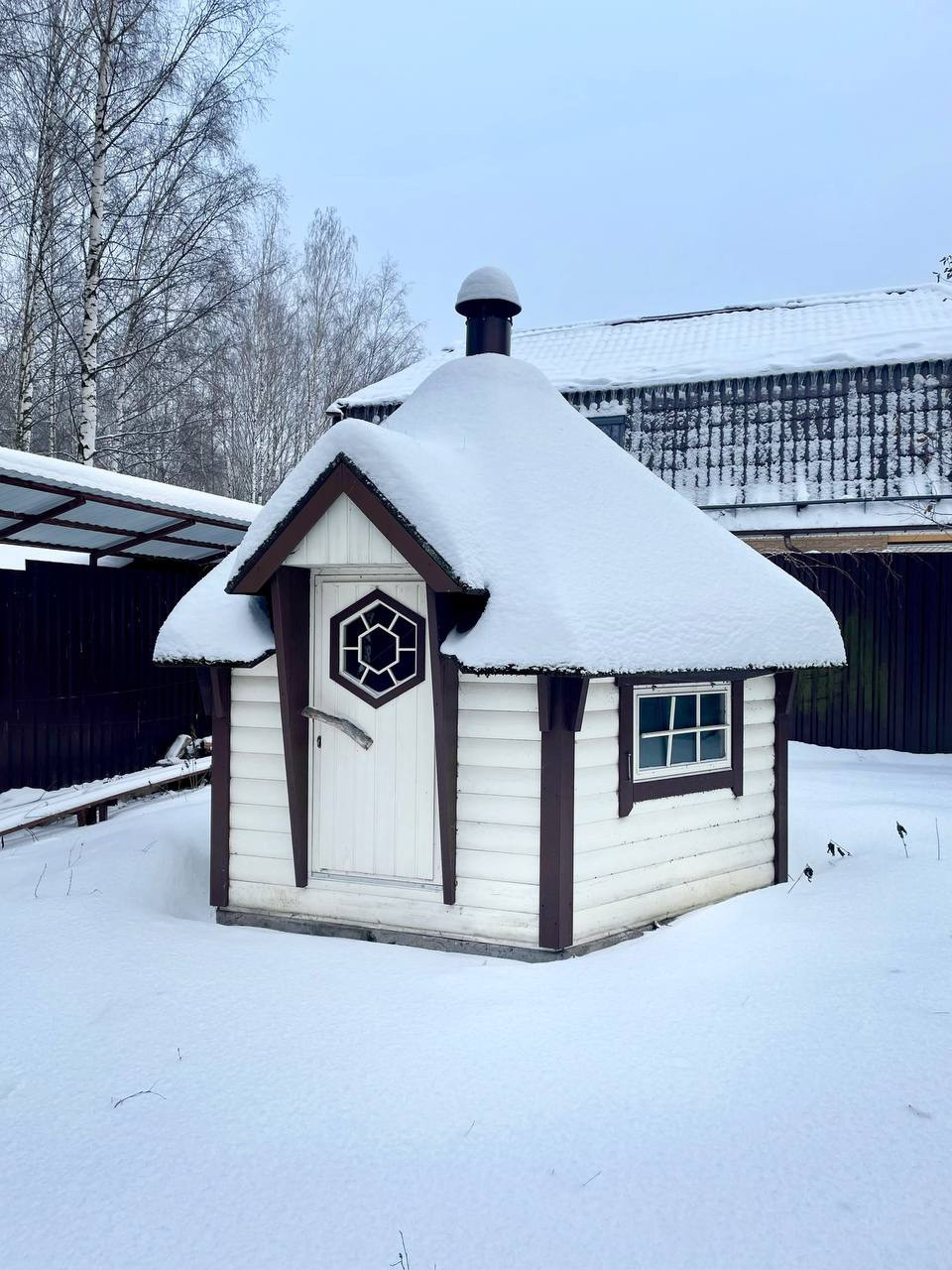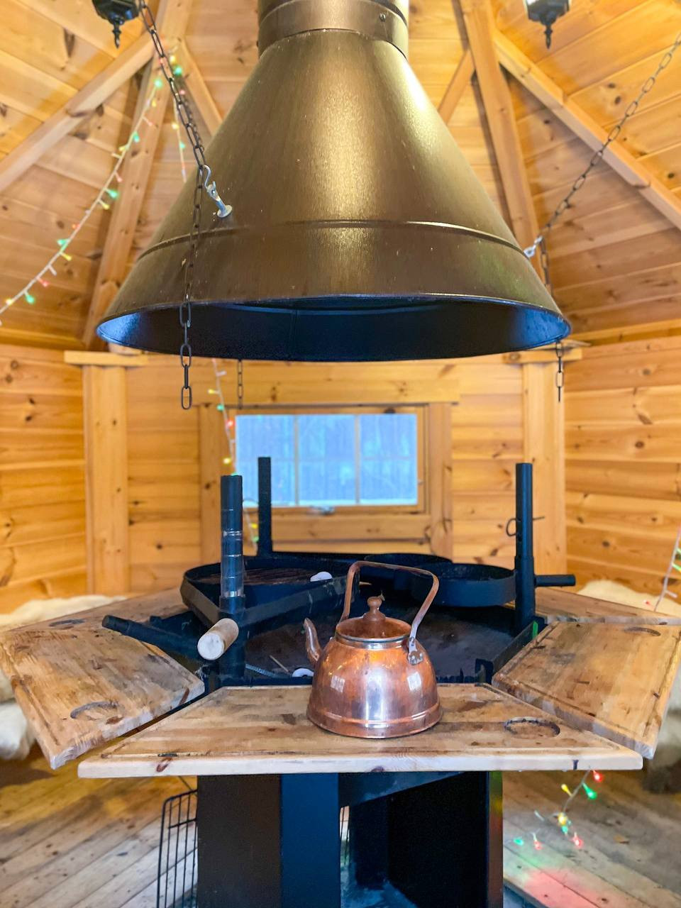 Установлен финский домик-очаг с дымоотводом в центре, внутри которого можно одновременно отдыхать компанией людей и готовить на открытом огне.