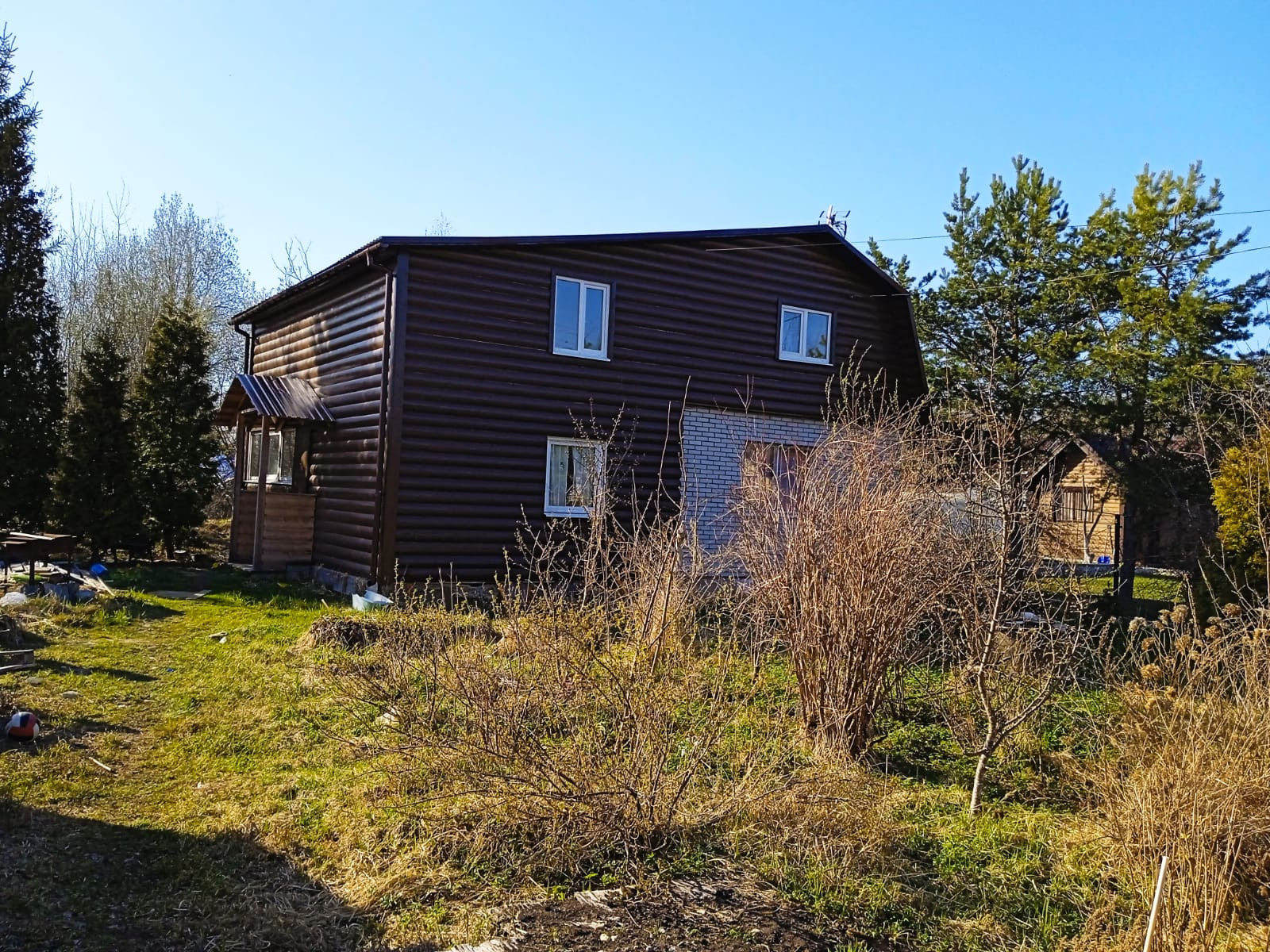 Часть дома из кирпича,обшитого доской блок-хаус ,часть из бруса, фундамент сваи + бетонные блоки. Кровля - финская металлочерепица. Дом зимний, для круглогодичного проживания, утеплен.Окна - стеклопакеты.Туалет - септик.