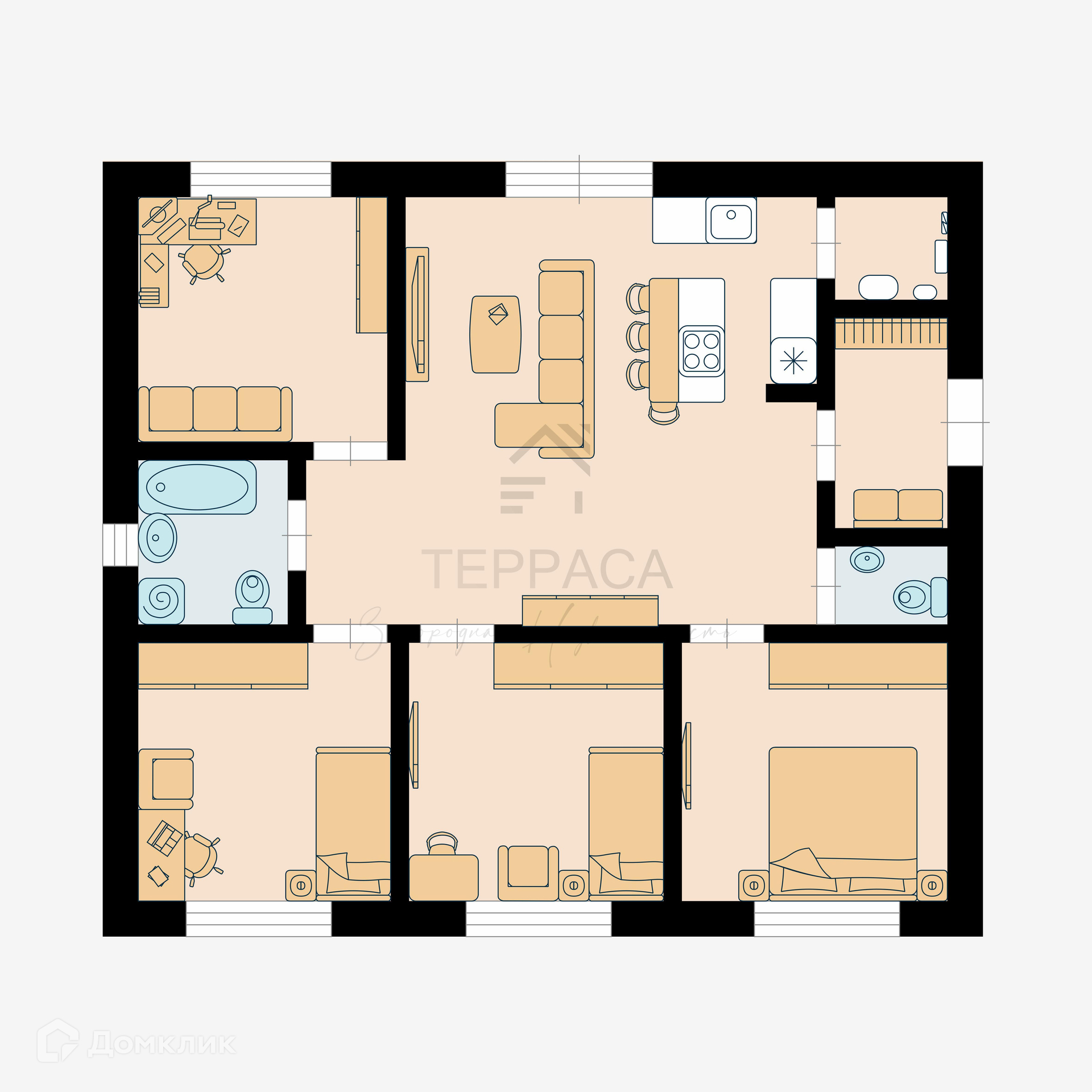 1 Этаж – просторная кухня гостиная с выходом на террасу, 4 изолированные комнаты, 2 с\у, ванна, прихожая.