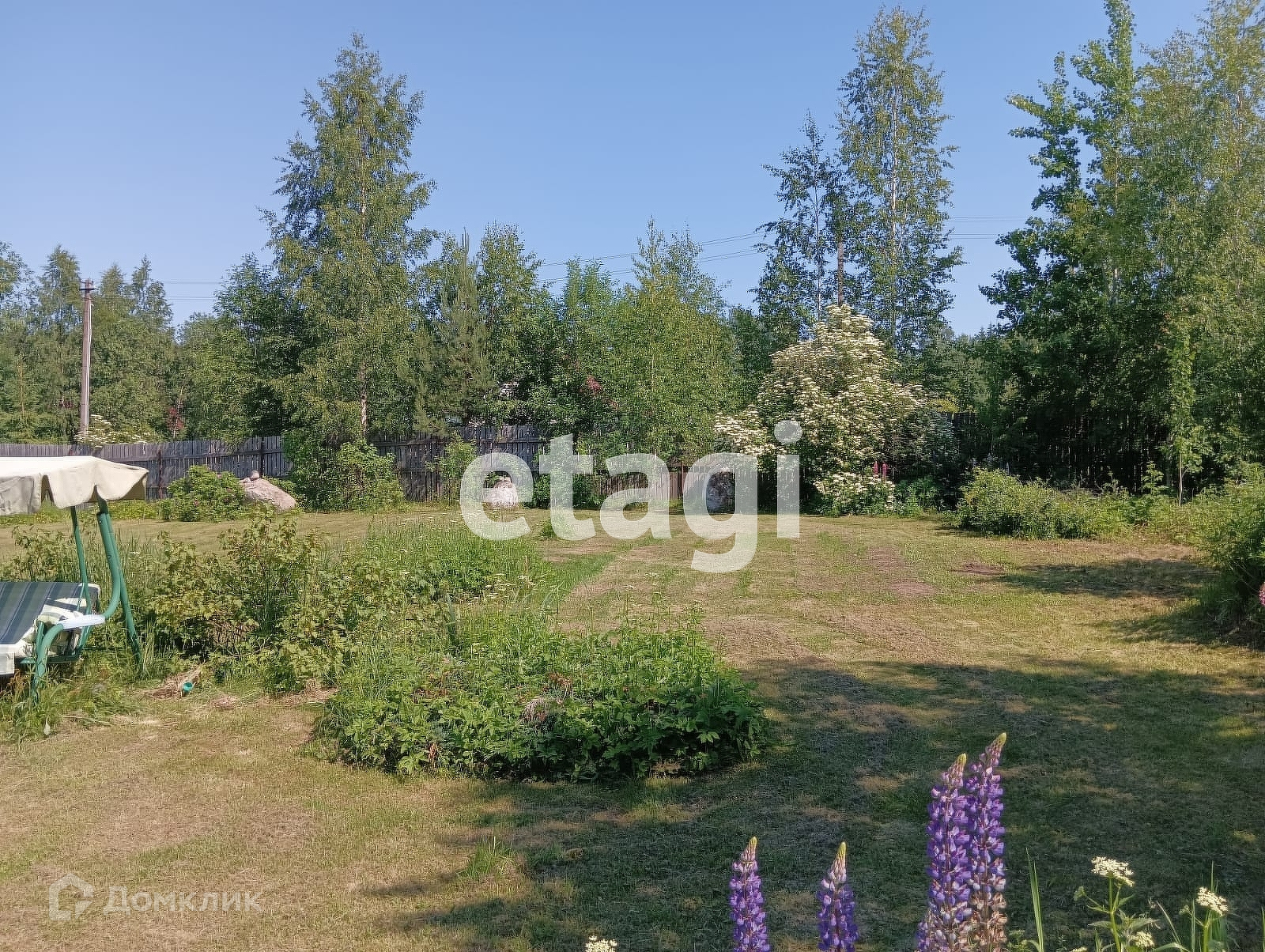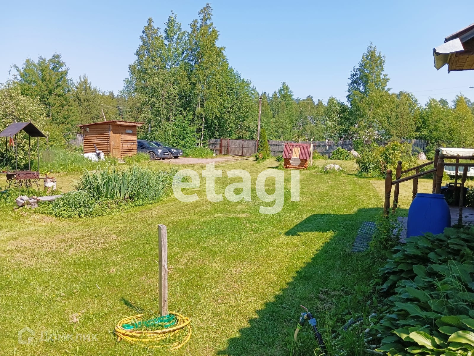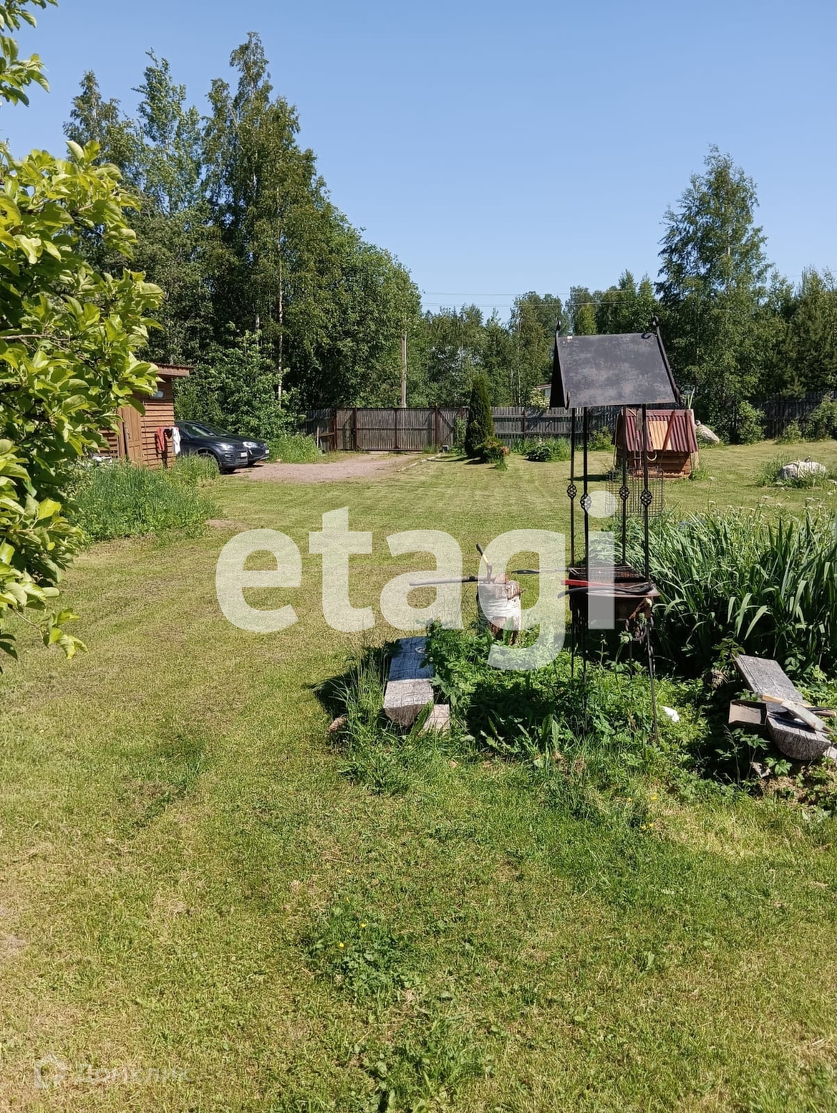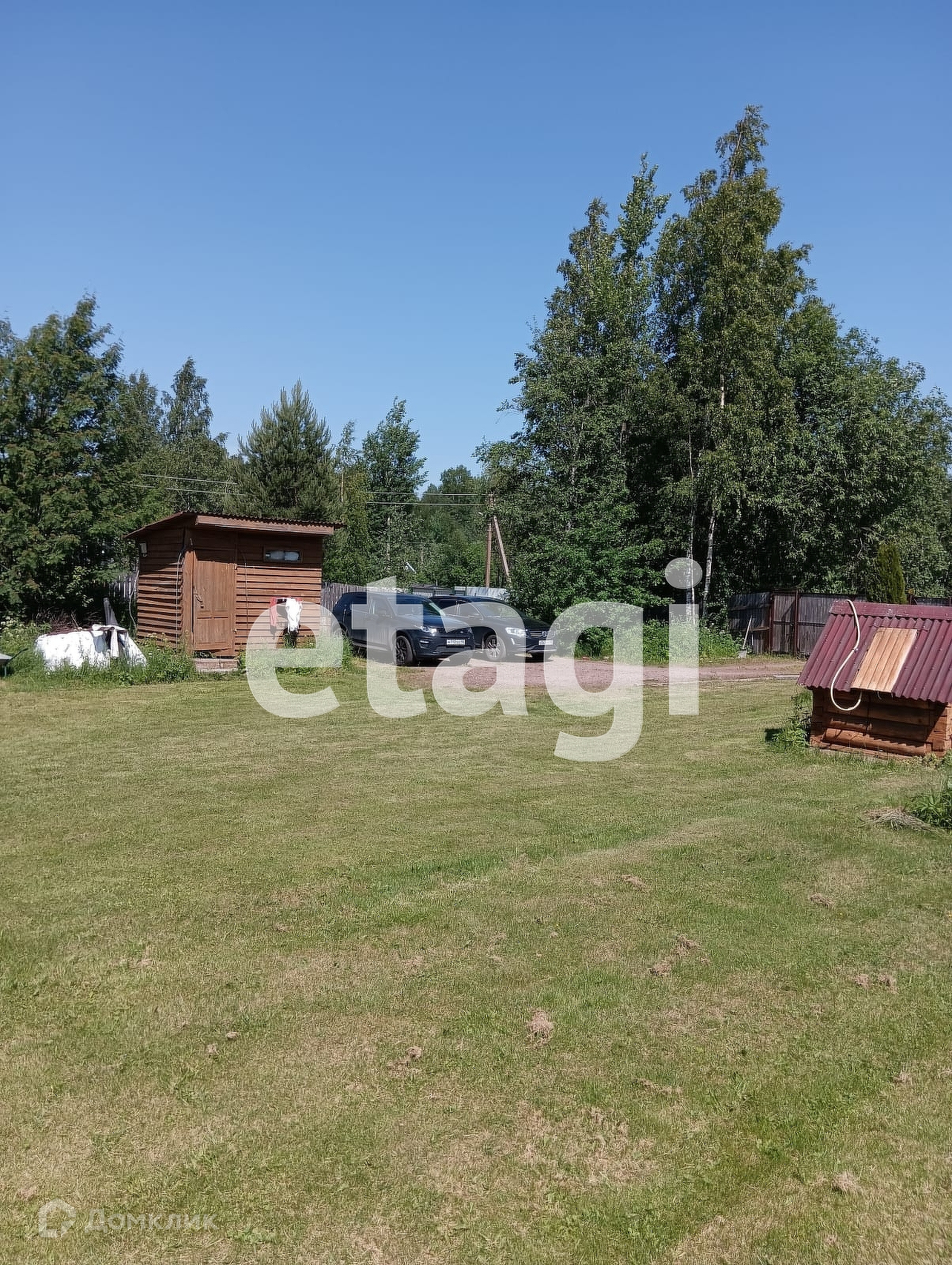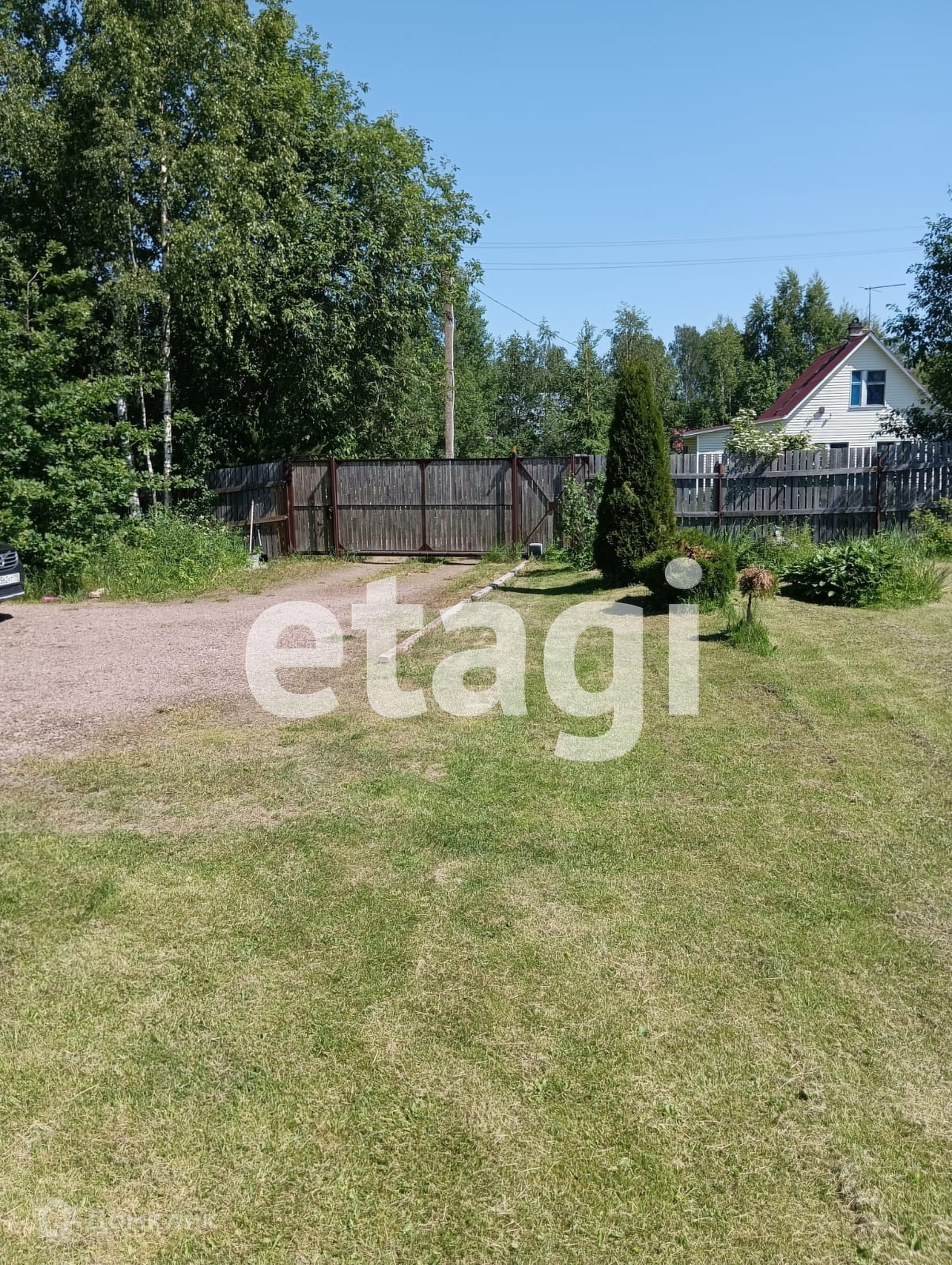 Участок разработан общей площадью 10 соток, есть возможность докупить еще 10 состок. Сделана классная лужайка, растут плодовые деревья. На одной части расположен небольшой сруб из северного леса. На второй возможно разместить полноценный дом, а сруб переоборудовать в баню или гостевой дом. Сделана стоянка для авто (отсыпана и утрамбована подушка) и установлены откатные ворота.