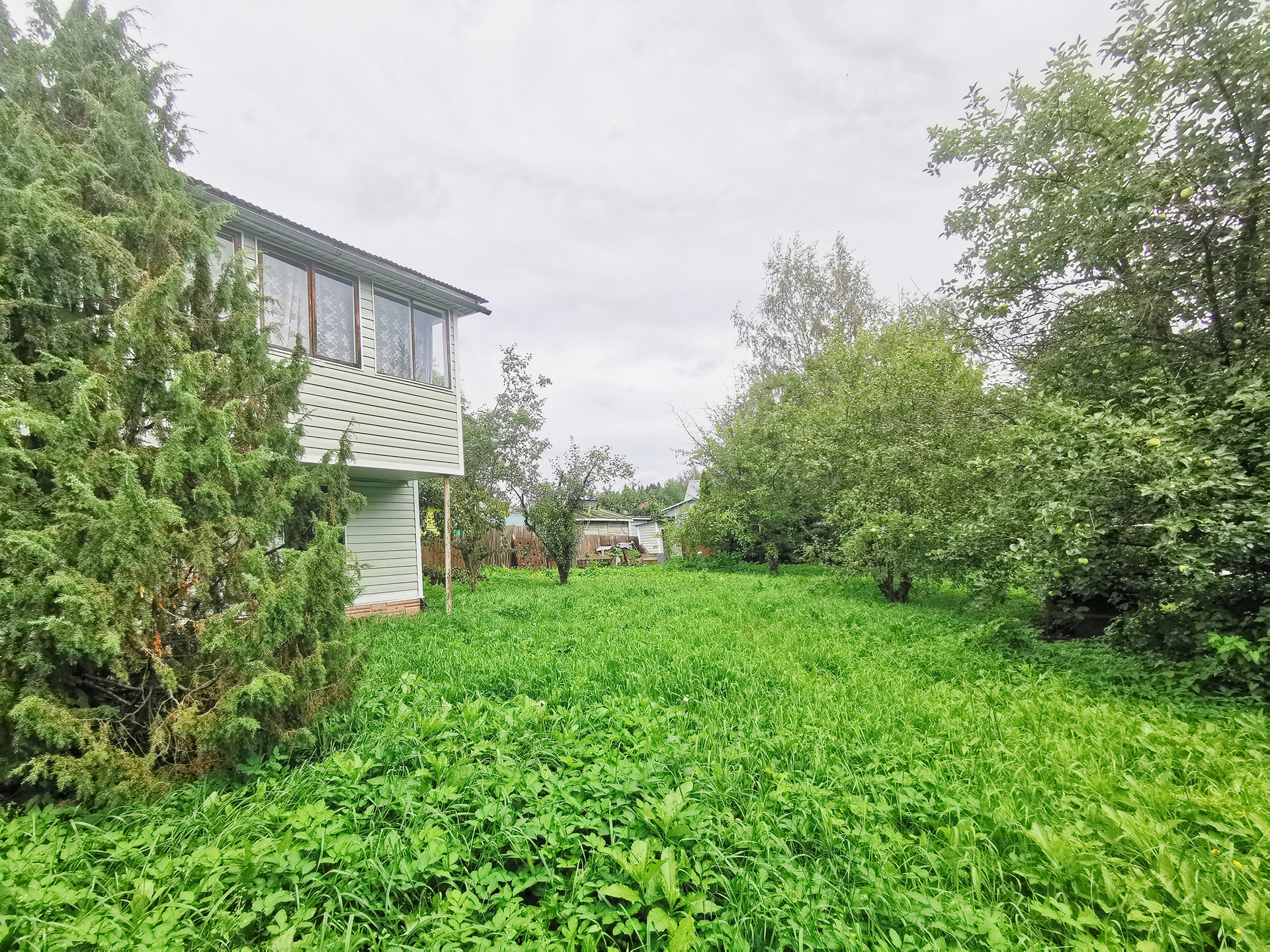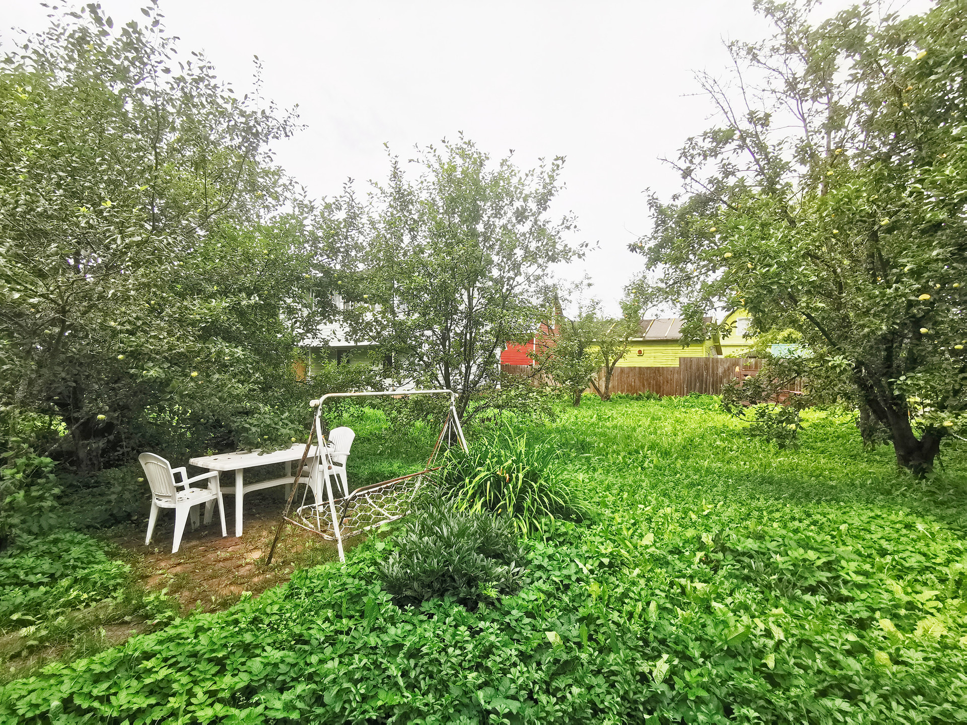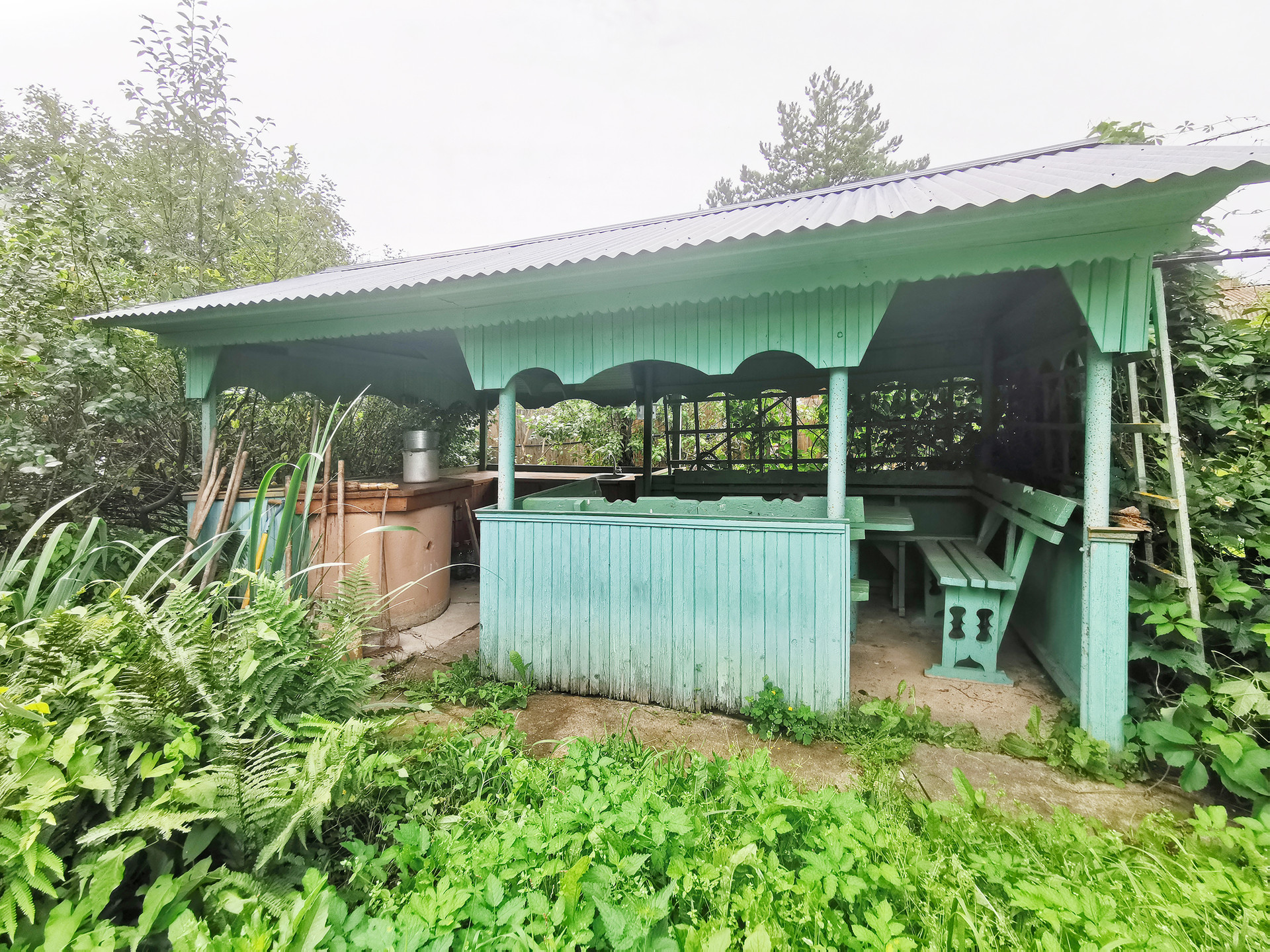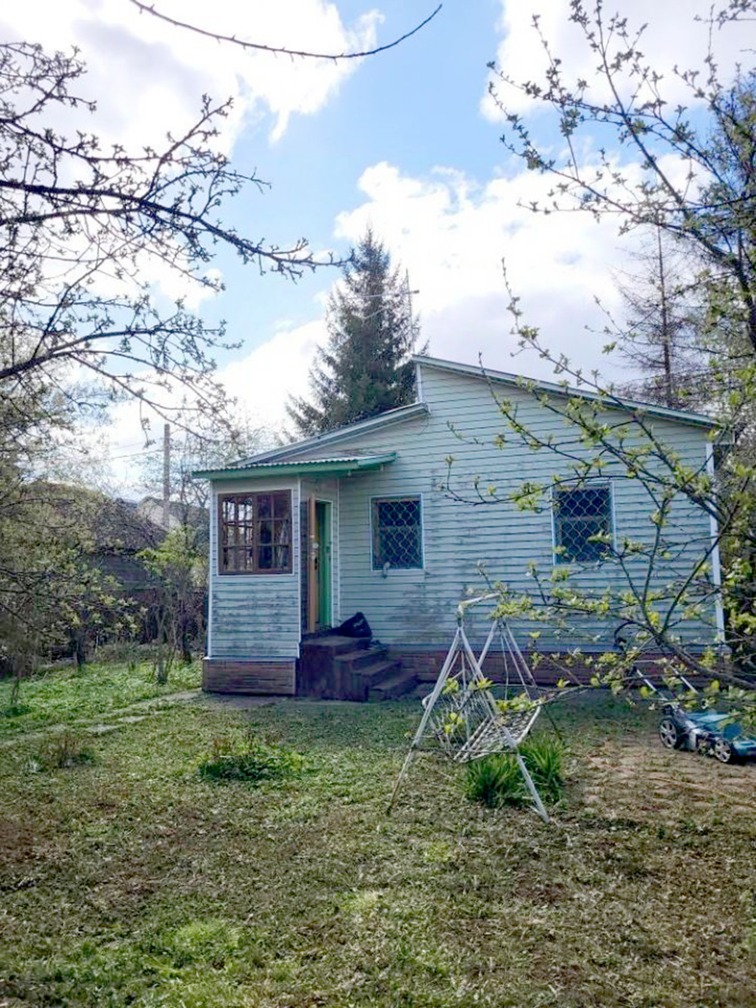 Участок 12 соток квадратной формы, ровный, огороженный. Водопровод на участке летний. Есть колодец, летняя беседка с раковиной и большим столом.  На участке растут яблони, есть парковка на две машины.