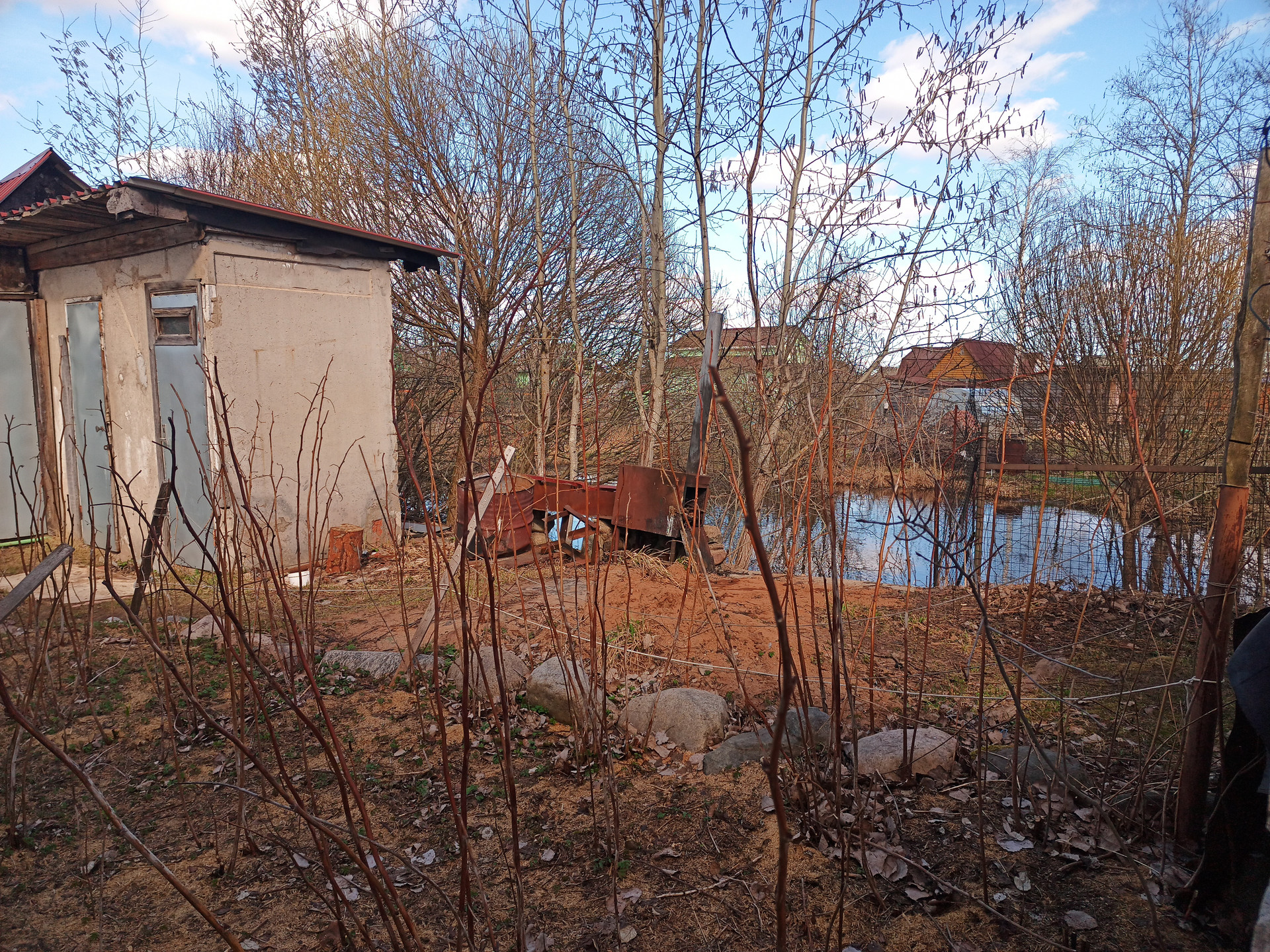 Участок 5 соток в собственности. Разработан, есть плодовые деревья, теплицы. Граничит с водоемом.