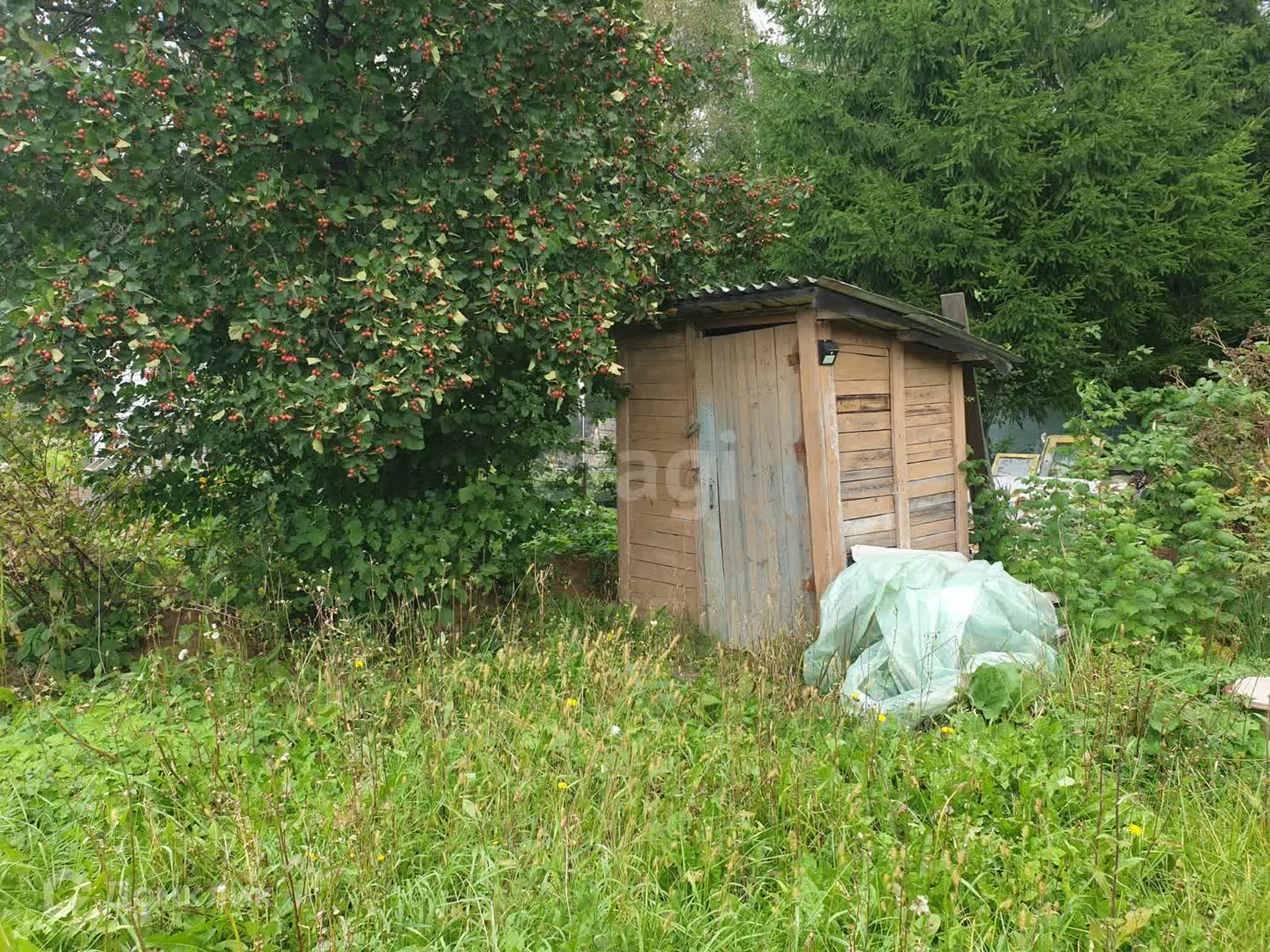 На 9 соток земли, расположены: парник 6 м., сарай, хозблок железный, очень вместительный, туалет и летний душ, плодоносящие деревья и кустарники.