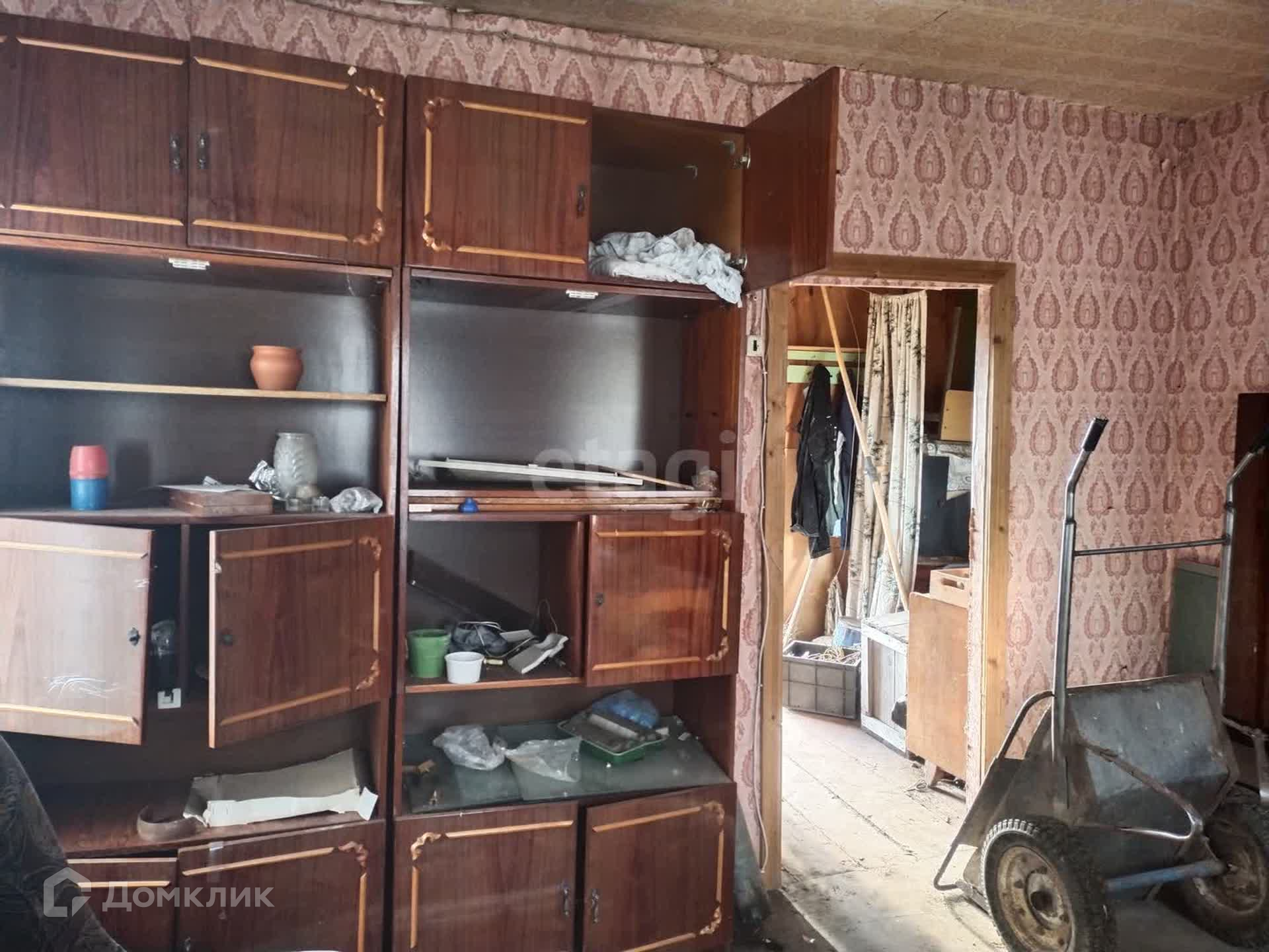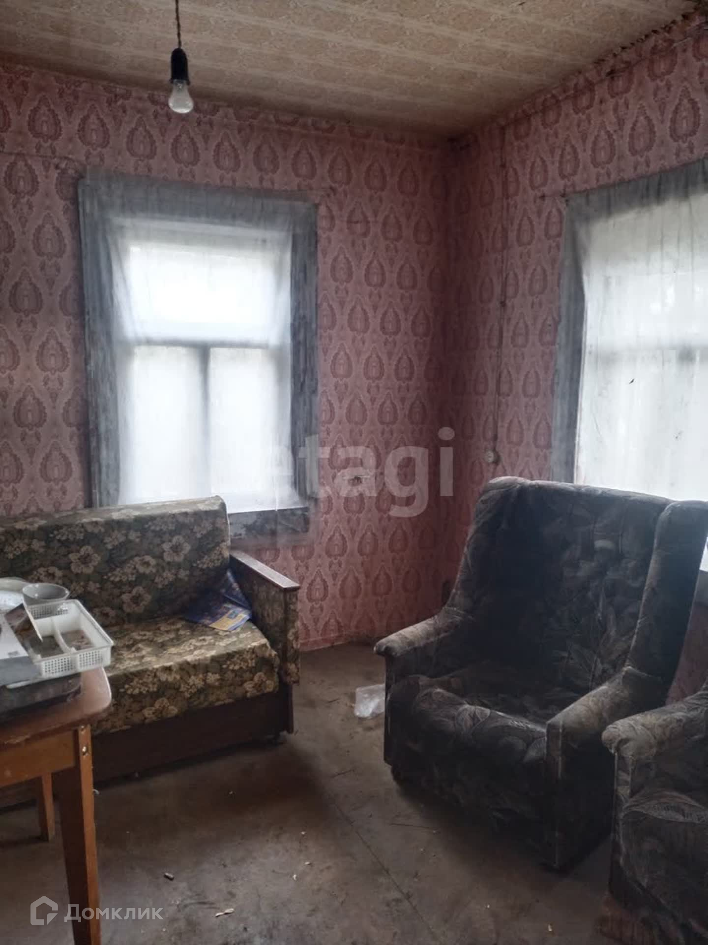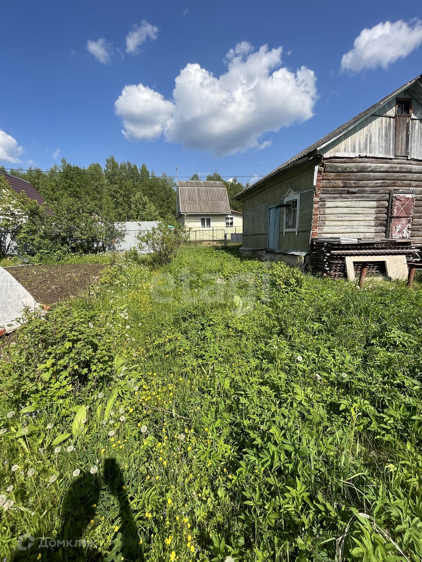 Дом из деревянного сруба, достаточно крепкий. Фундамент требует капитального ремонта. Окна целые, не разбиты. Внутри дома две комнаты и кухня. На даче давно не жили и она требует внимания.