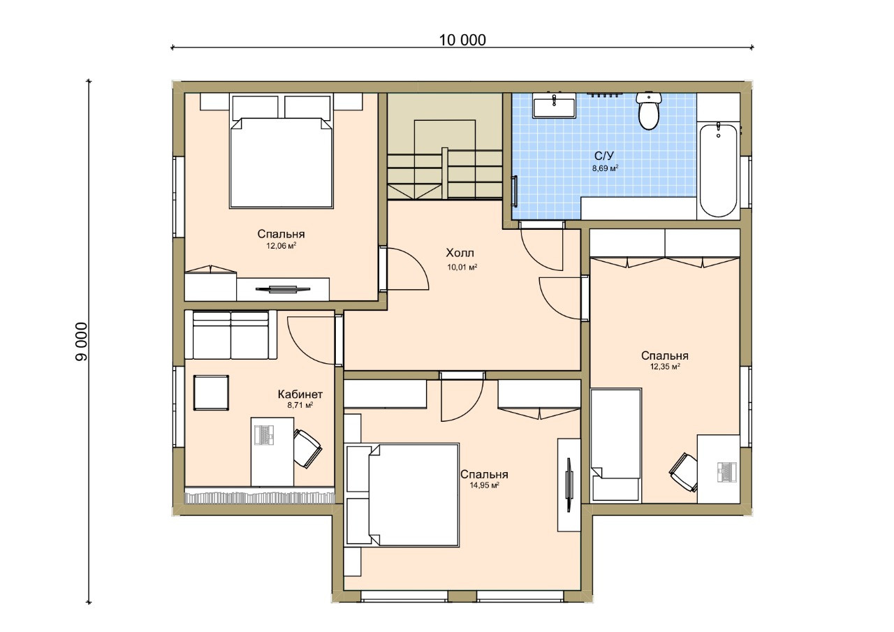 На втором этаже располагаются 3 спальни, кабинет, санузел.