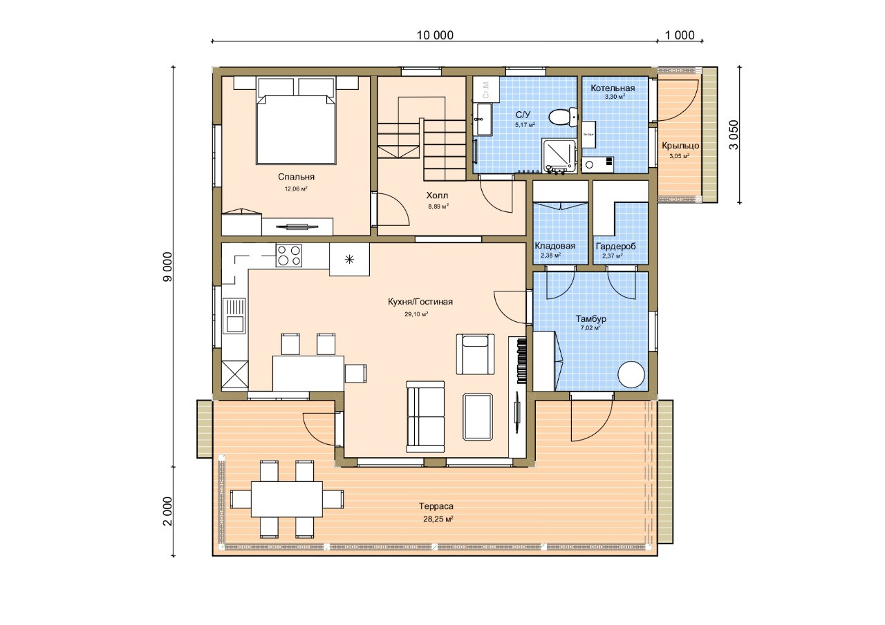 На первом этаже расположена большая кухня-гостиная с панорамными окнами и выходом на террасу, а так же отдельная спальня (или детская), санузел, котельная, кладовая и гардеробная комната.