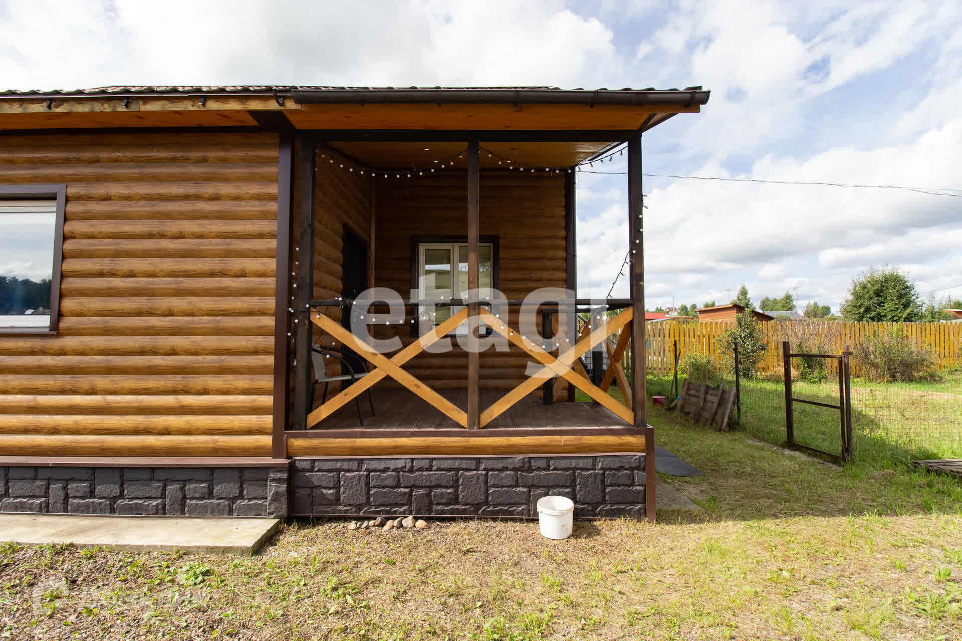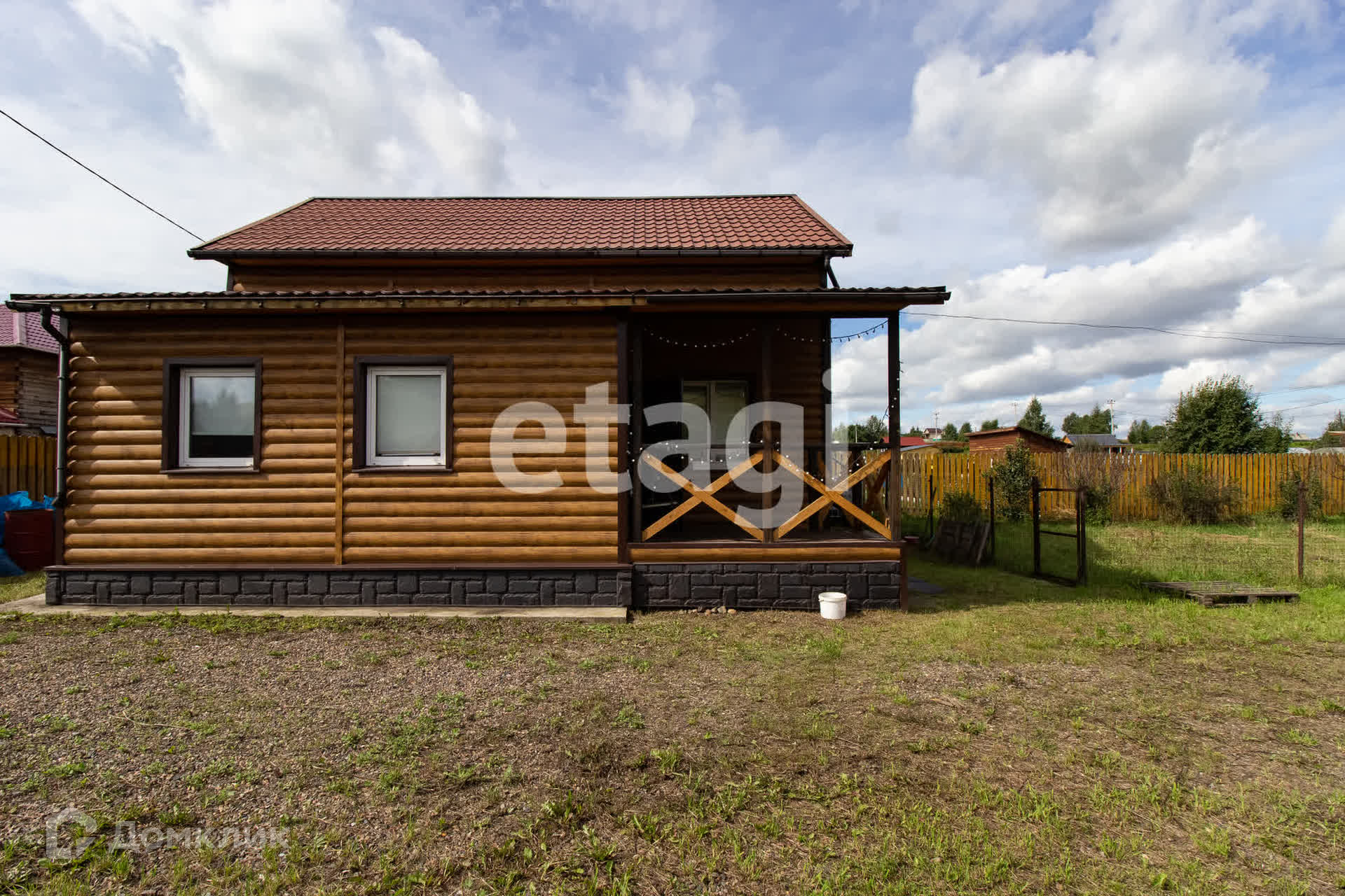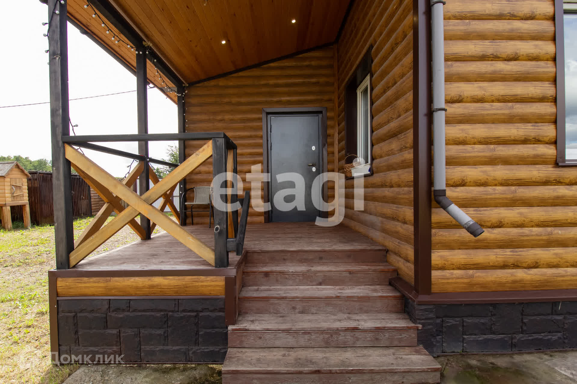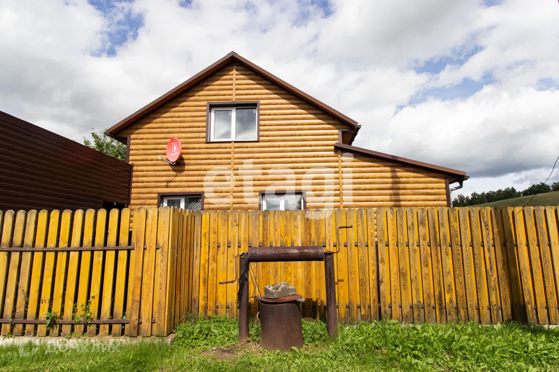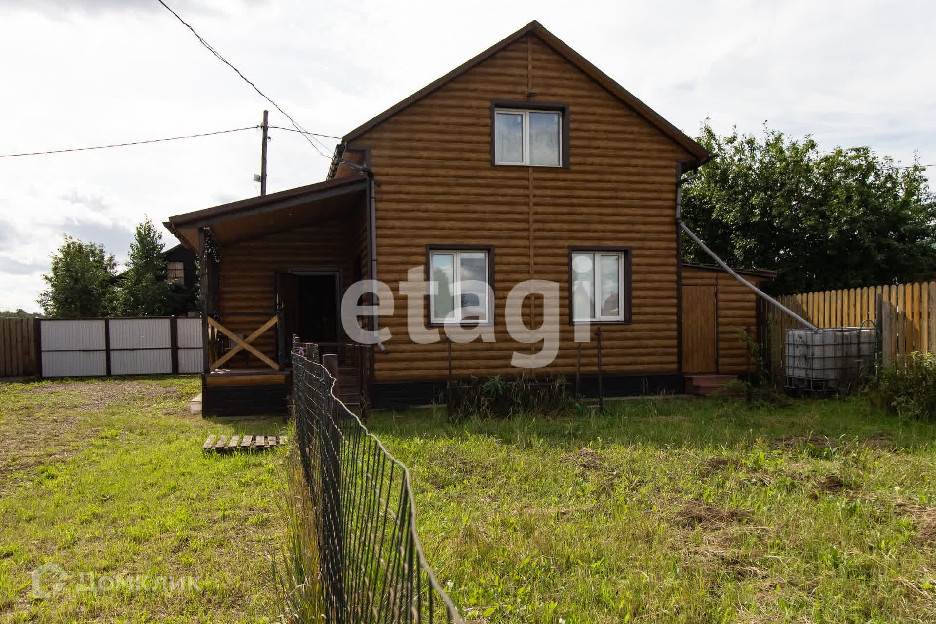 Двухэтажный загородный дом из бруса, утеплен и отделан металлическим сайдингом, подходит для круглогодичного проживания.