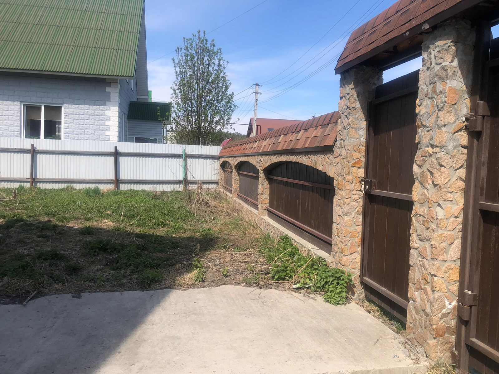 Участок ровный, правильной формы. Периметр закрыт красивым забором из натурального камня со вставками из дерева.