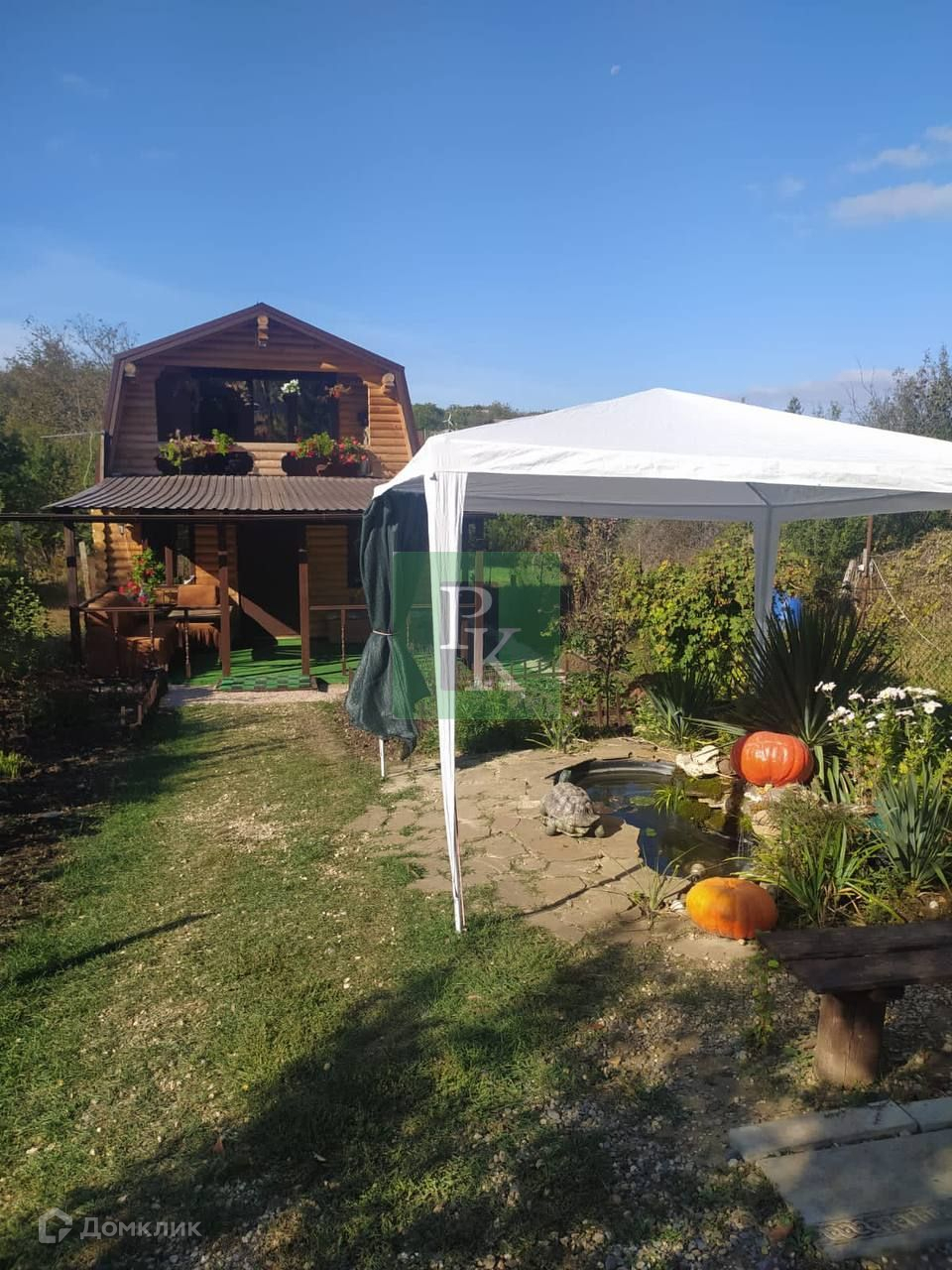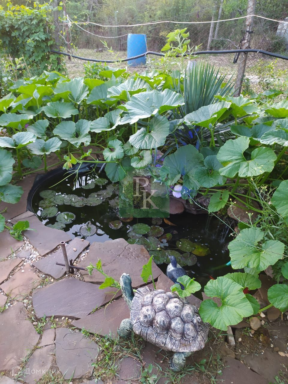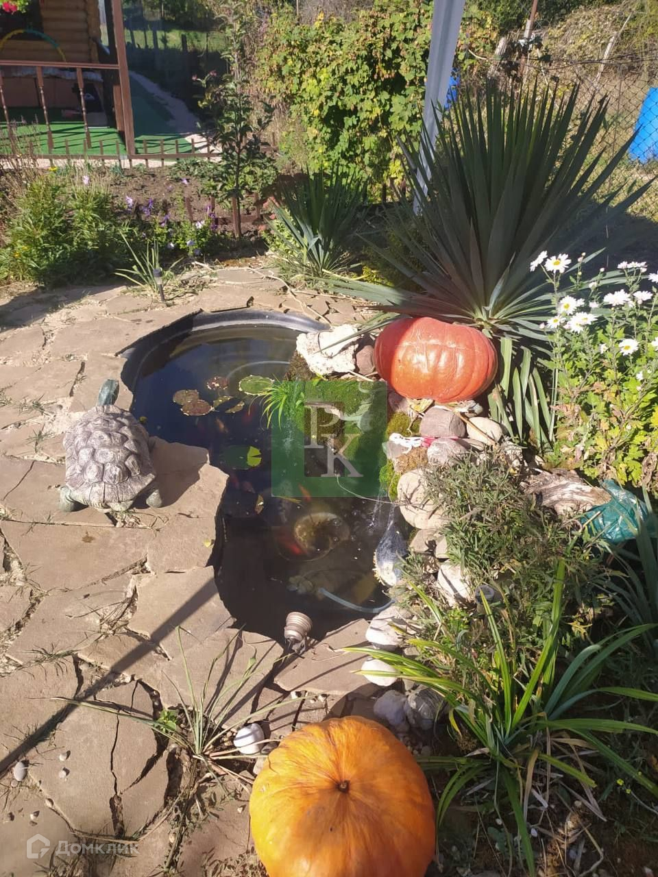 На участке свет, централизованная вода, есть две пластиковые ёмкости для питьевой воды на шесть кубов и на 600 л. Газ проведут через год. Парковка на три машины, на участке фруктовые деревья, посажены культурные растения, пруд с карпами, деревянные качели, курятник, тёплая будка для большой собаки, место для мангала.