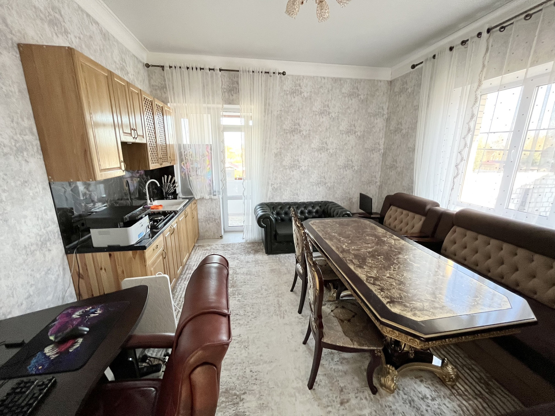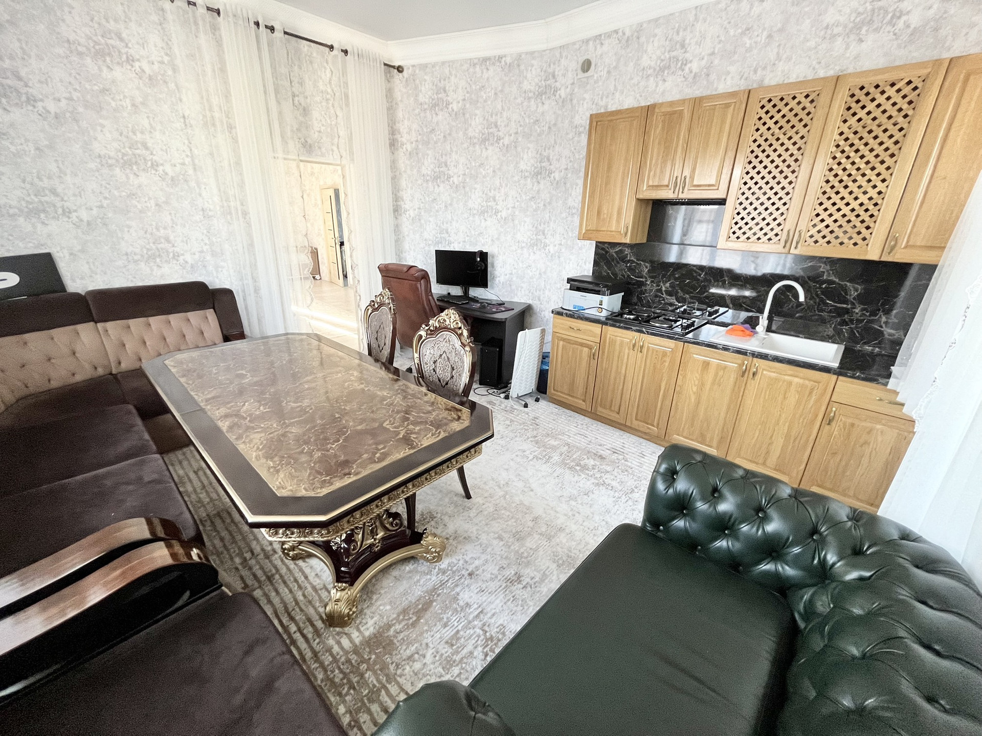 1 этаж: состоит из просторной кухни 27,8кв.м., где поместится вся семья и дорогие гости. Из кухни мы попадаем в еще более просторную гостиную 31,75кв.м.( можно зайти с улицы с другого входа). Из гостиной уже можно попасть в две милые, уютные спальные комнаты.