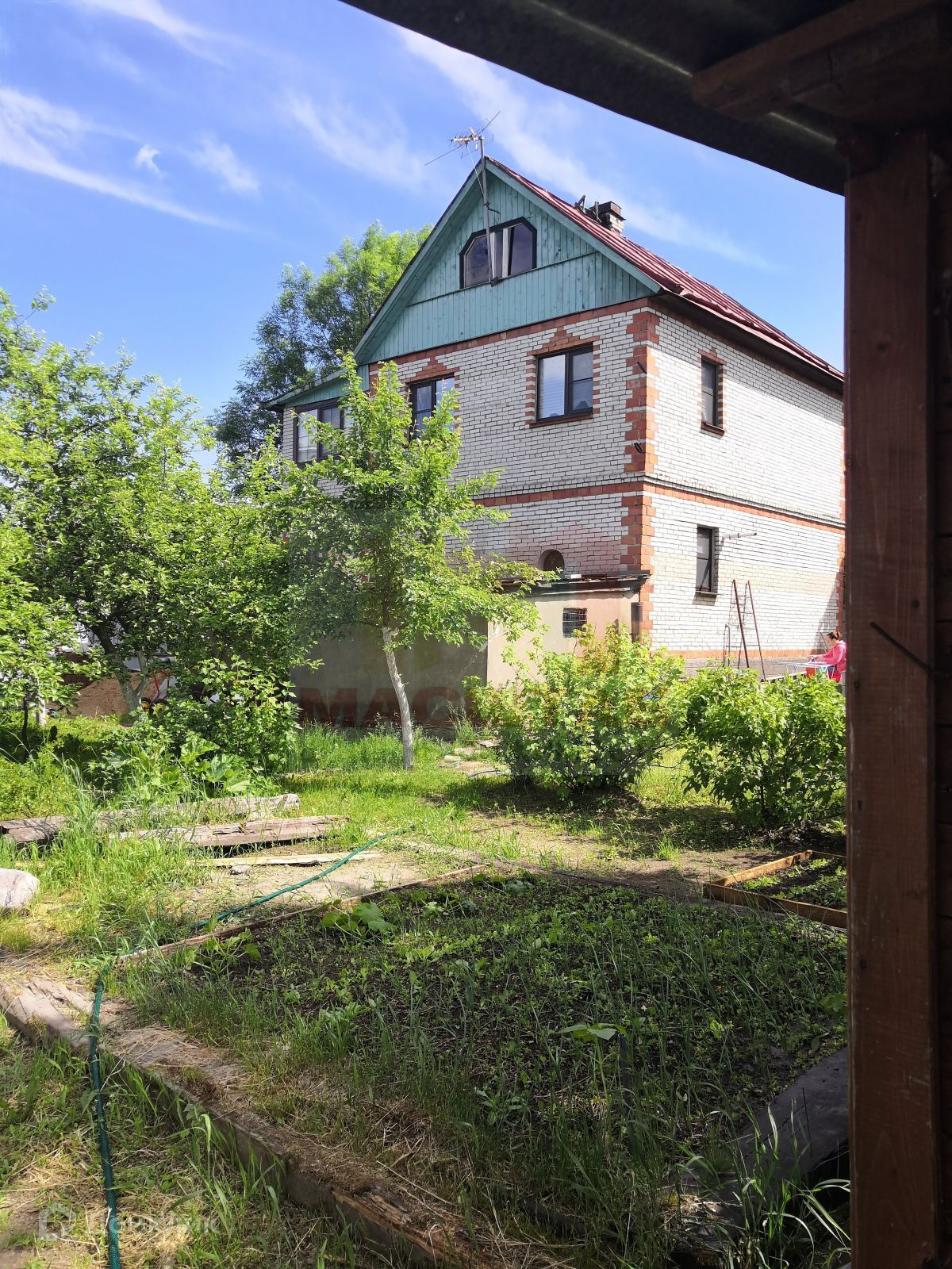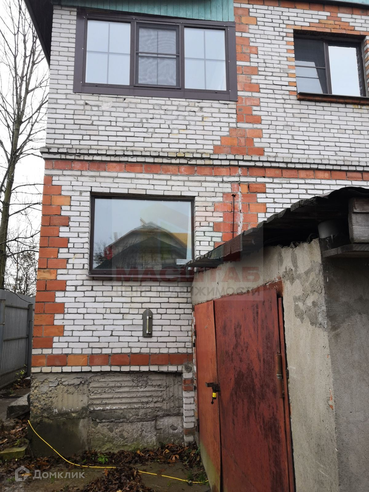 Дом стоит на ленточном фундаменте, стены из кирпича, крыша металлическая. На первом этаже расположены прихожая, холл, кухня, спальня, санузел; на втором этаже: две спальни, санузел и кабинет.