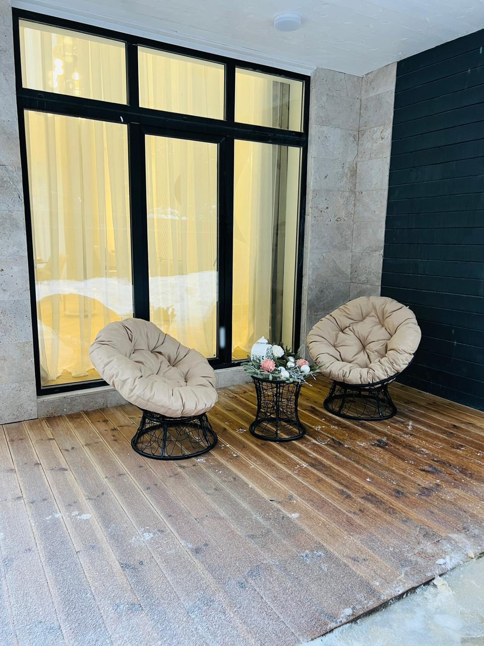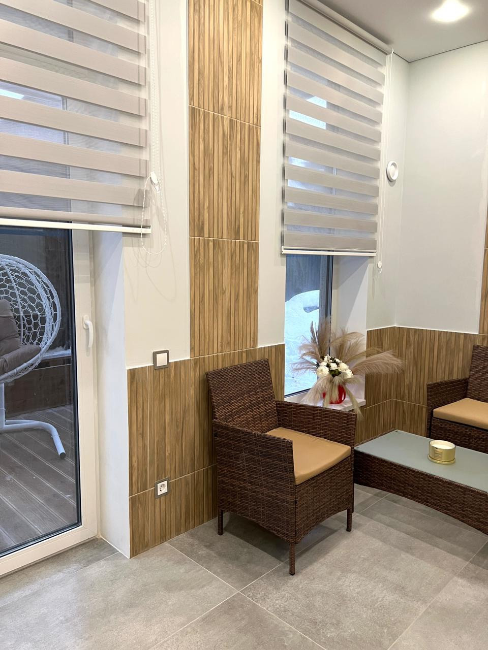 Дом из газобетон ЛСР. Фундамент монолитная плита, 2-х камерные панорамные энергосберегающие стеклопакеты Veka. Крыша металлочерепица Grand Line, установлены снегозадержатели. Фасад дома выполнен из натурального камня со вставками планкен ( лиственница) окрашенной краской Tikkurila. На террасе уложена террасная доска лиственница. Перекрытие монолитная плита. В доме сделана вся разводка электроэнергии, водоснабжения, отопление - везде тёплый пол с датчиками регулирования каждого помещения.