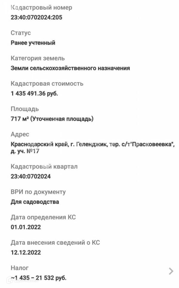Земельный участок 7.2 сот. СНТ, КАД.НОМ.- 23:40:0702024:205Ровный, чистый.Имеются видовые характеристики!Документы Юридически проверенны, и готовы к сделке!!!Полная стоимость в договоре купли продажи!!!В собственности более пяти лет!!!Любой расчёт!!!По просмотру и дополнительным вопросам обращайтесь по указанному телефону!