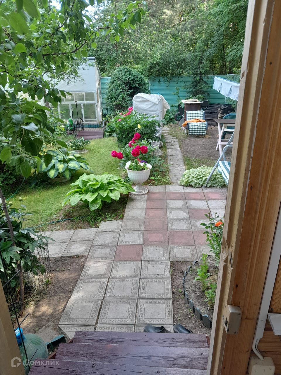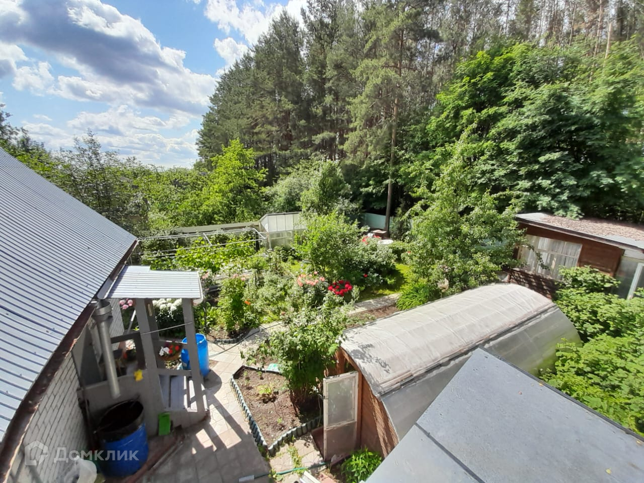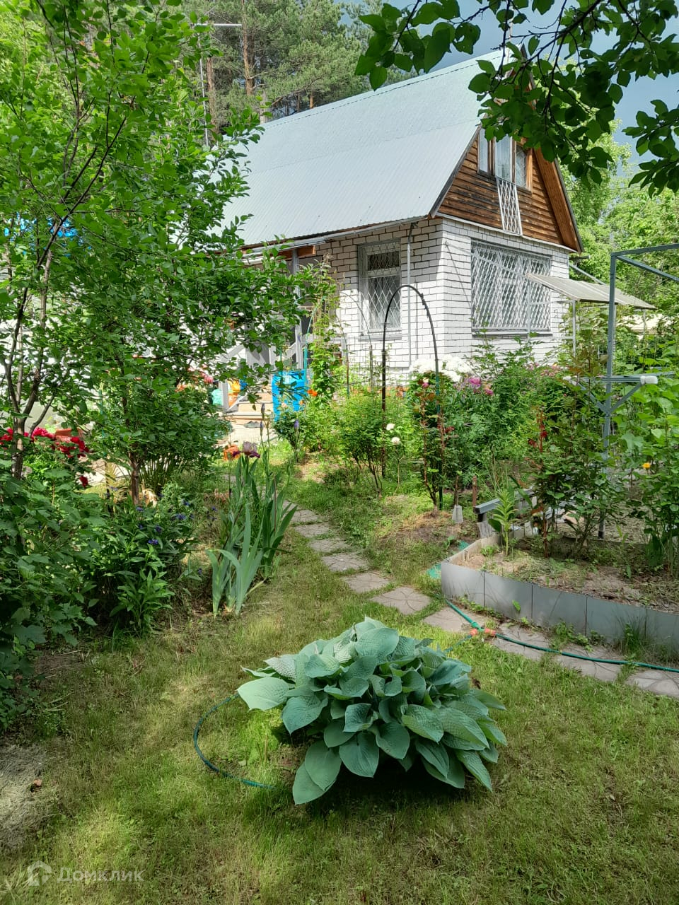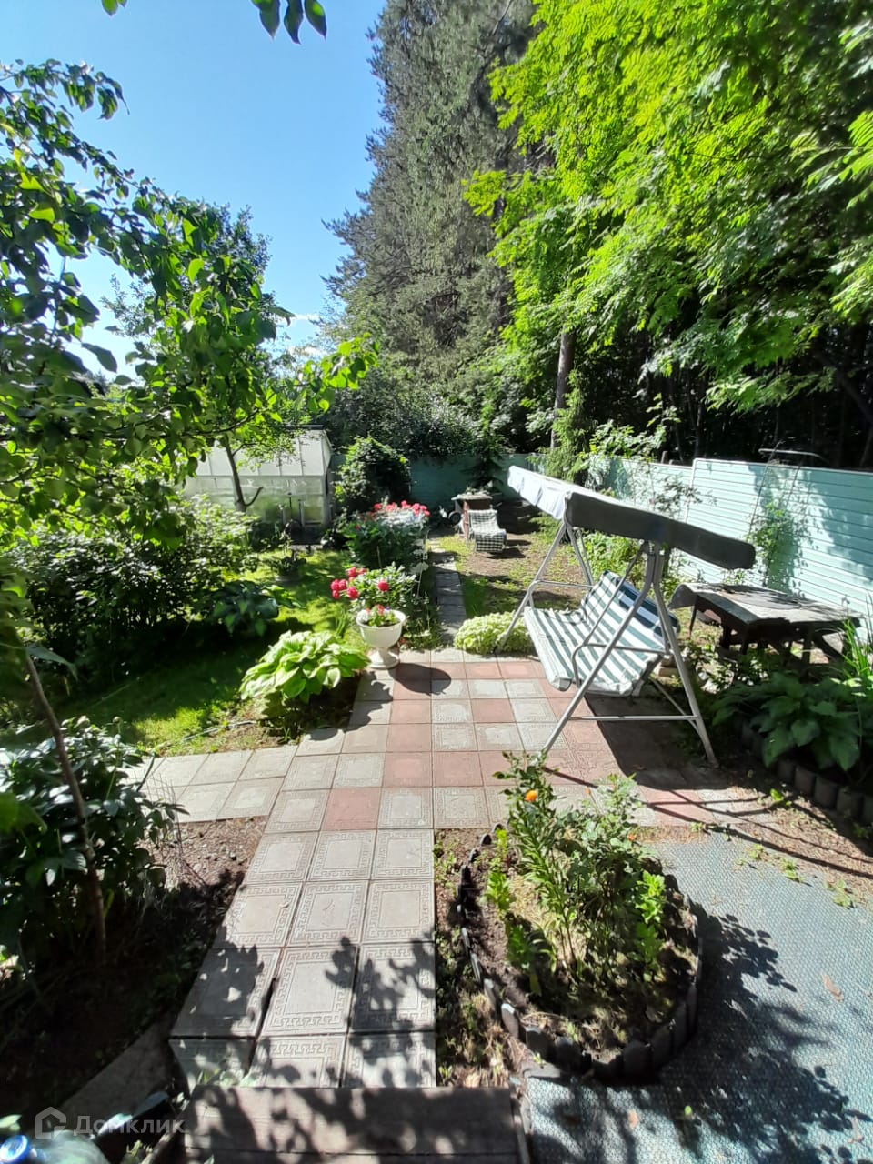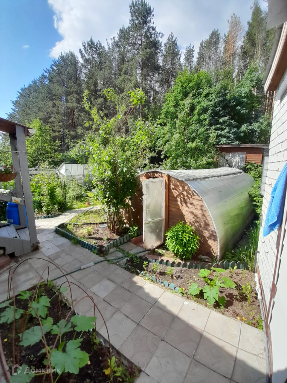 Участок обнесён высоким забором из профнастила с воротами и калитками в лес и на центральную аллею. Все дорожки в саду вымощены плиткой, что обеспечивает комфорт проживания в любую погоду.