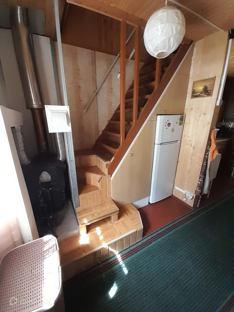На 1-м этаже: 2 комнаты, кухня-столовая с горячей водой, компактная конвекционная дровяная печь.