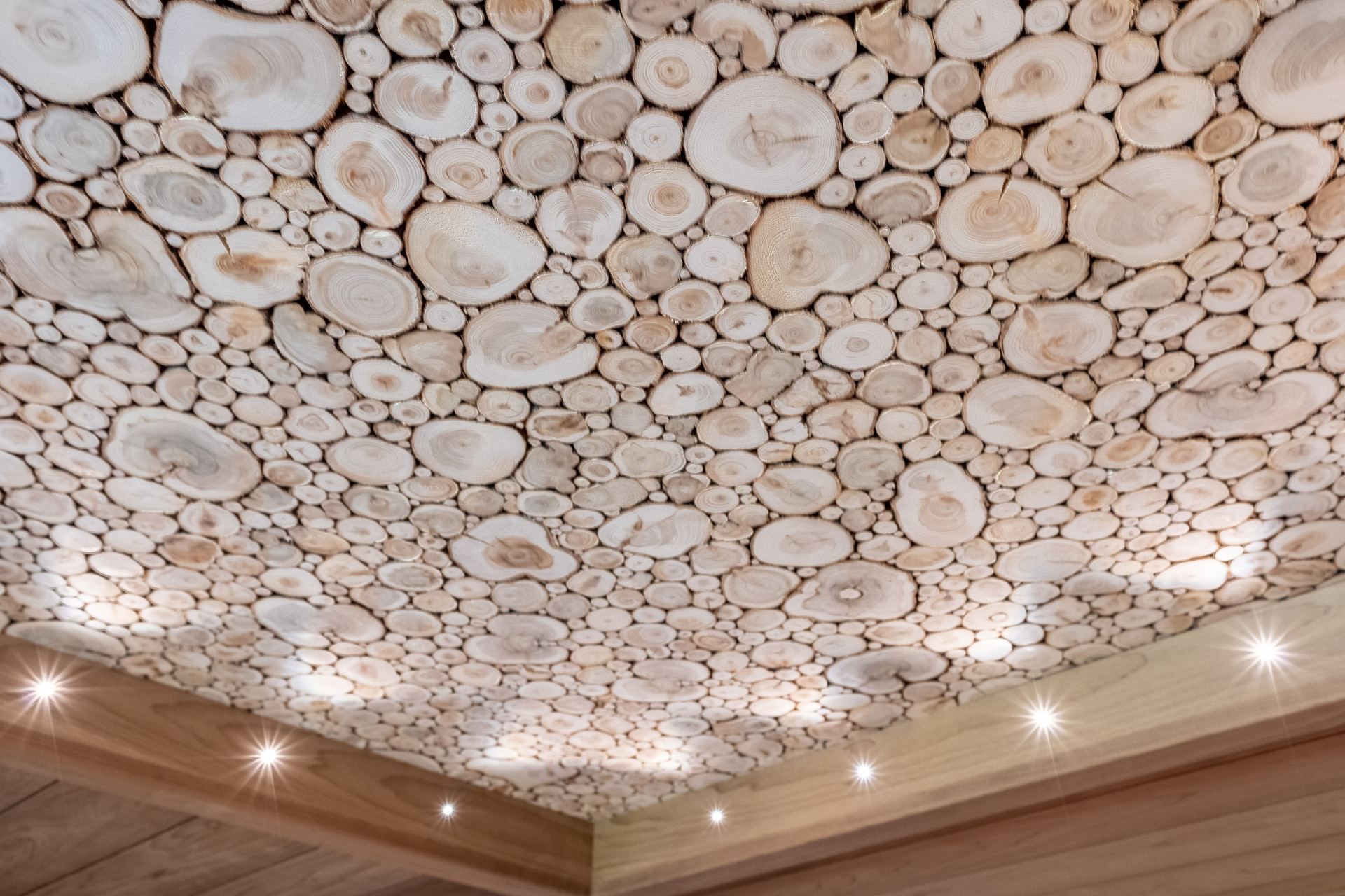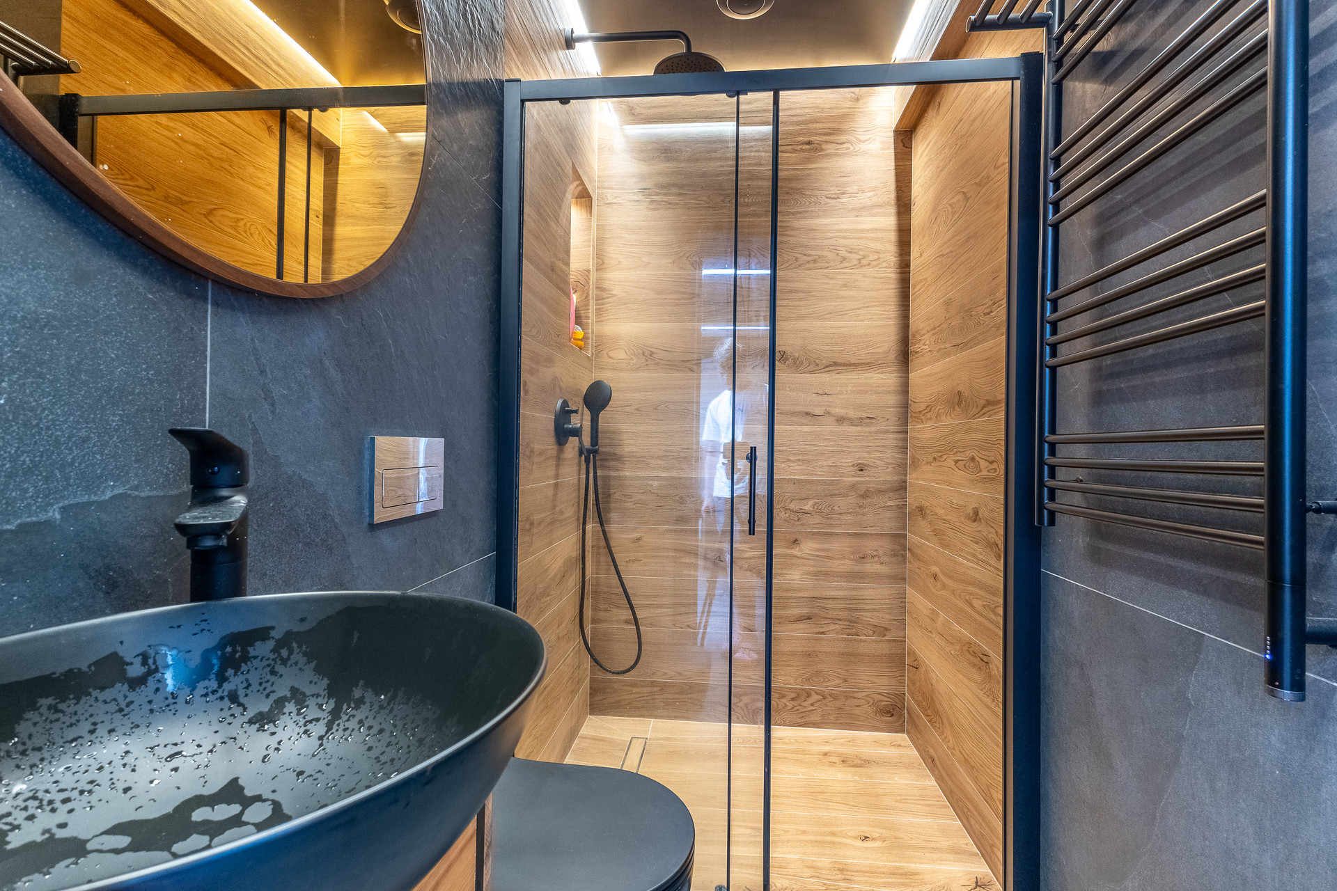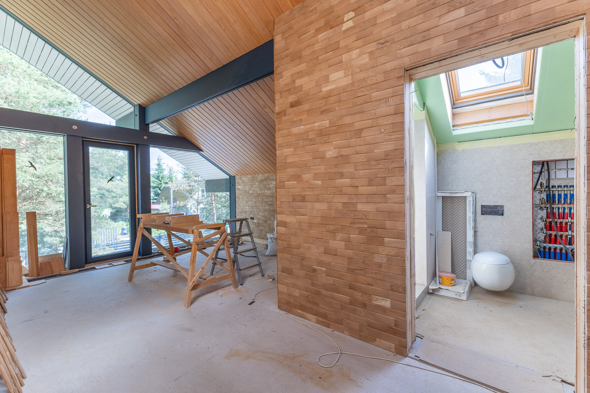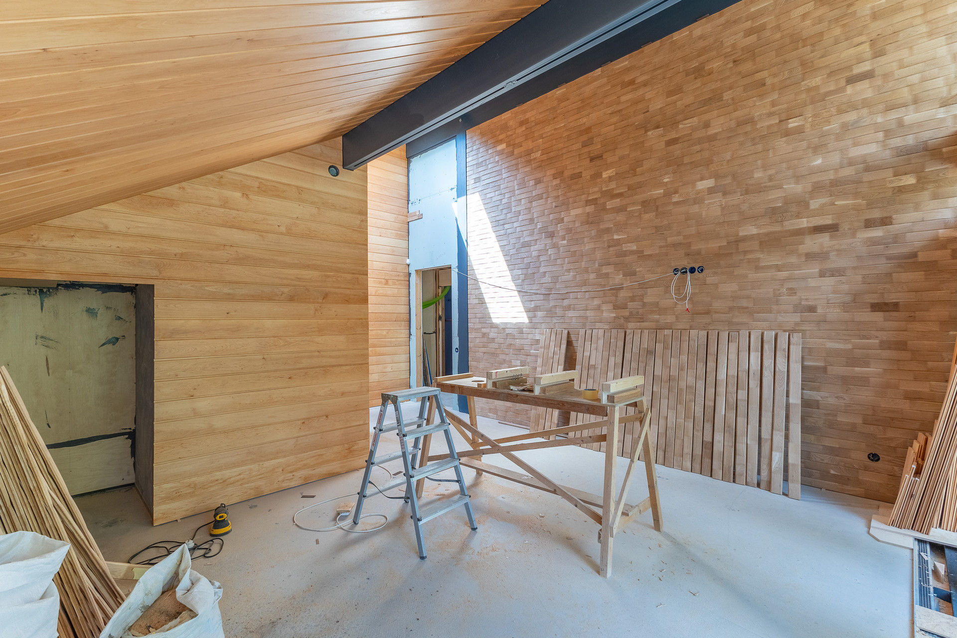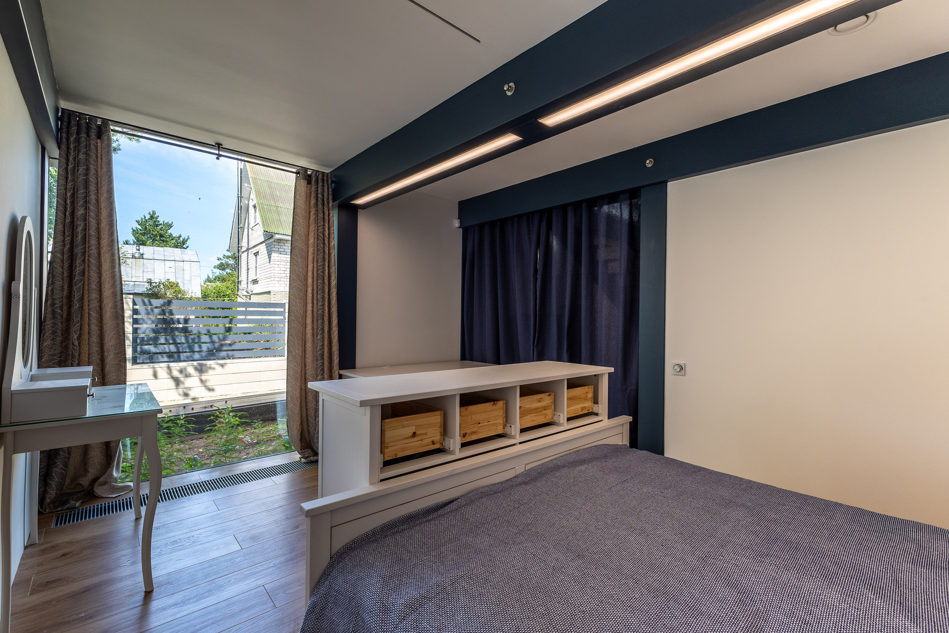 - Стены смарт-спальни на втором этаже обшиты мозаикой из натурального дуба