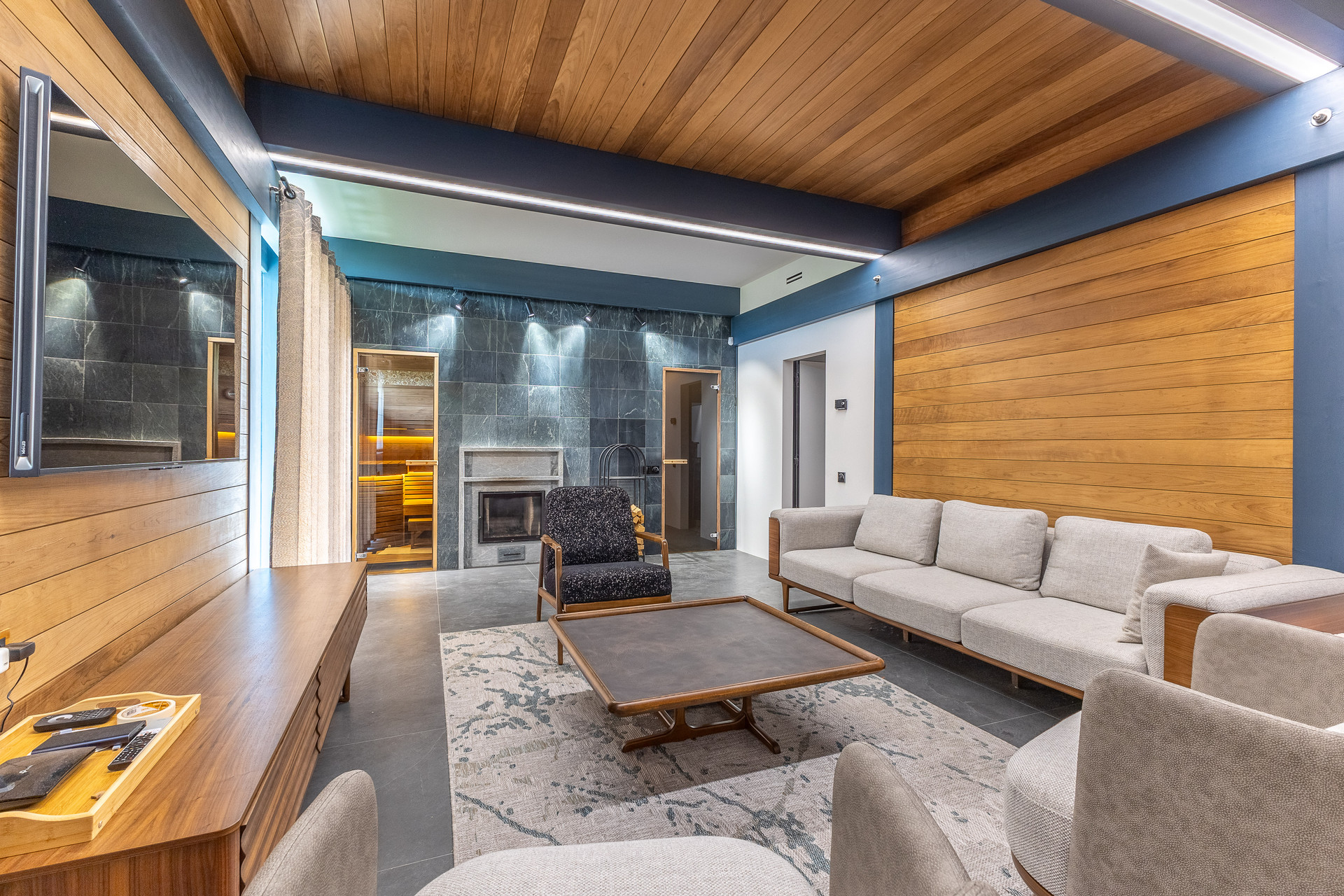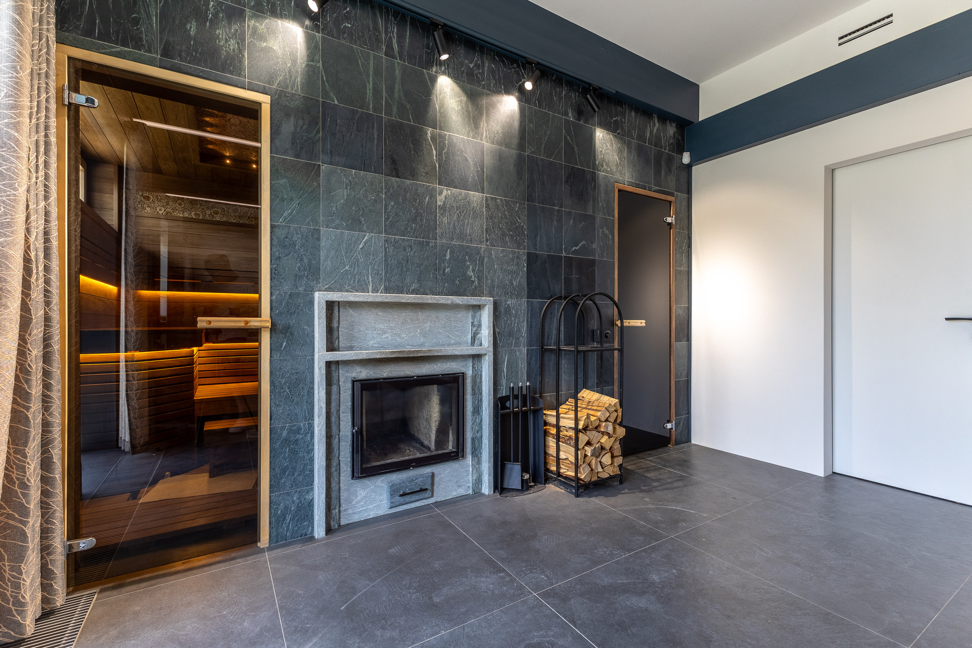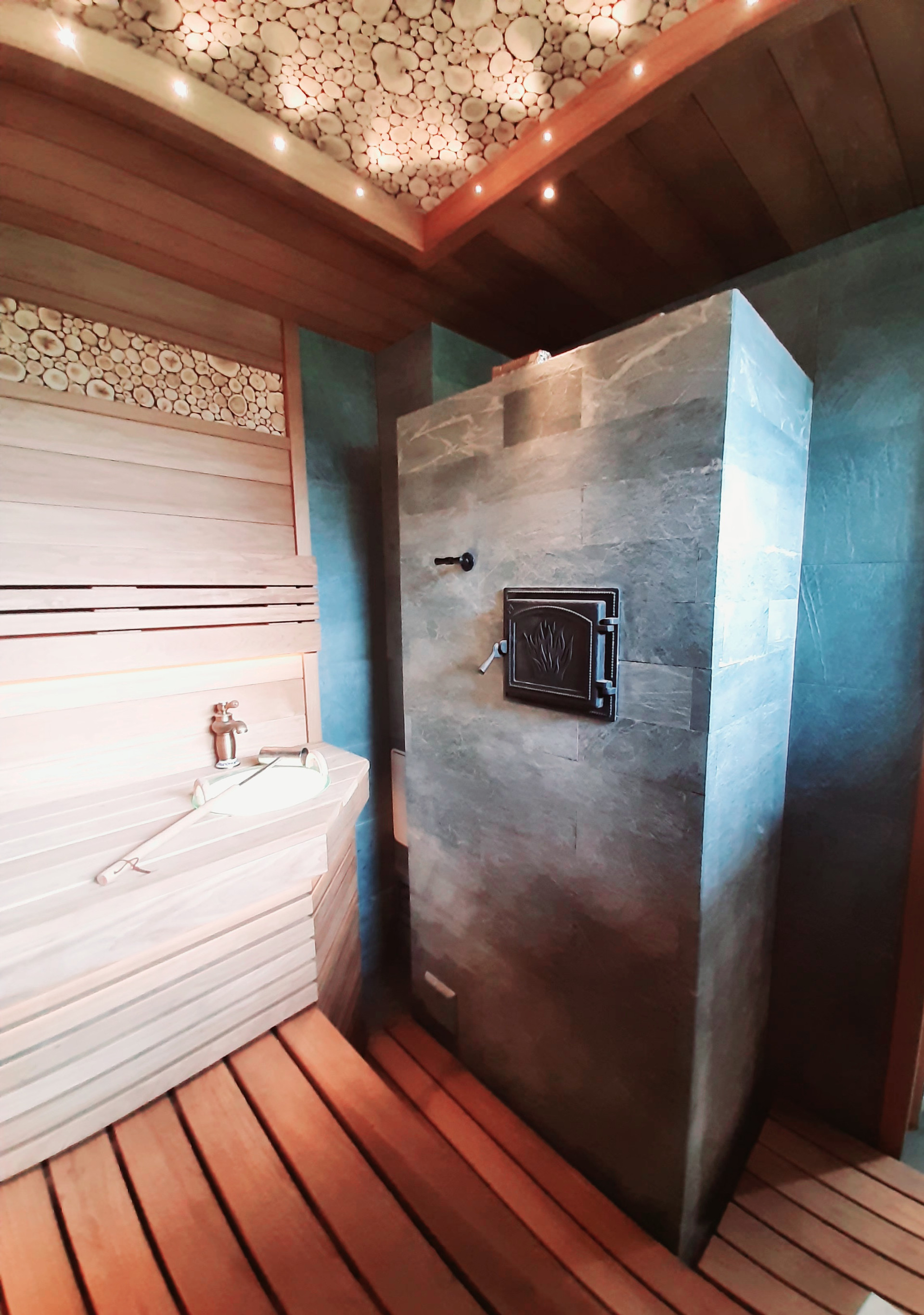 - В гостиной уютно смежно находятся камин и сауна с печью из натурального камня талькохларид.