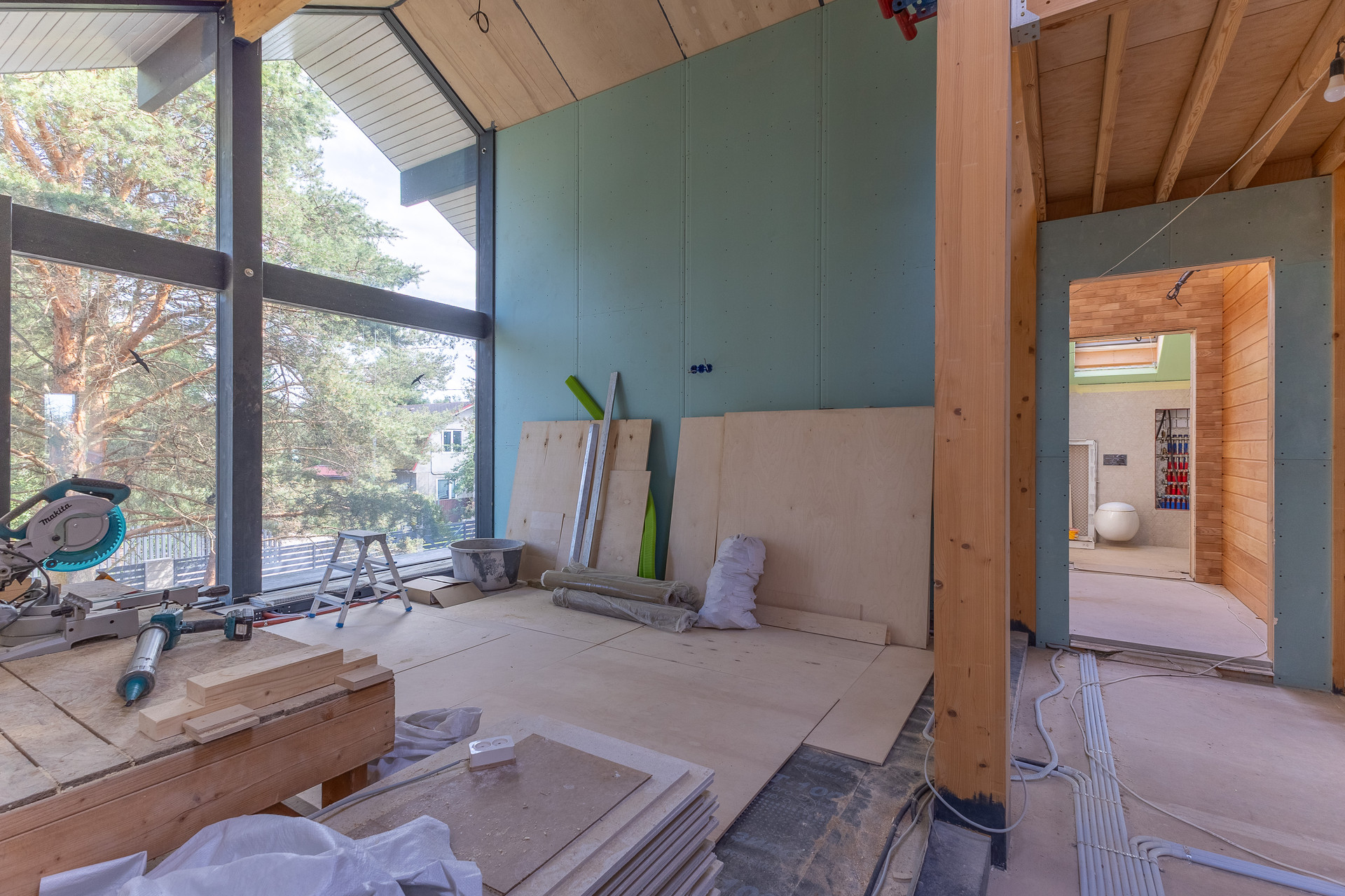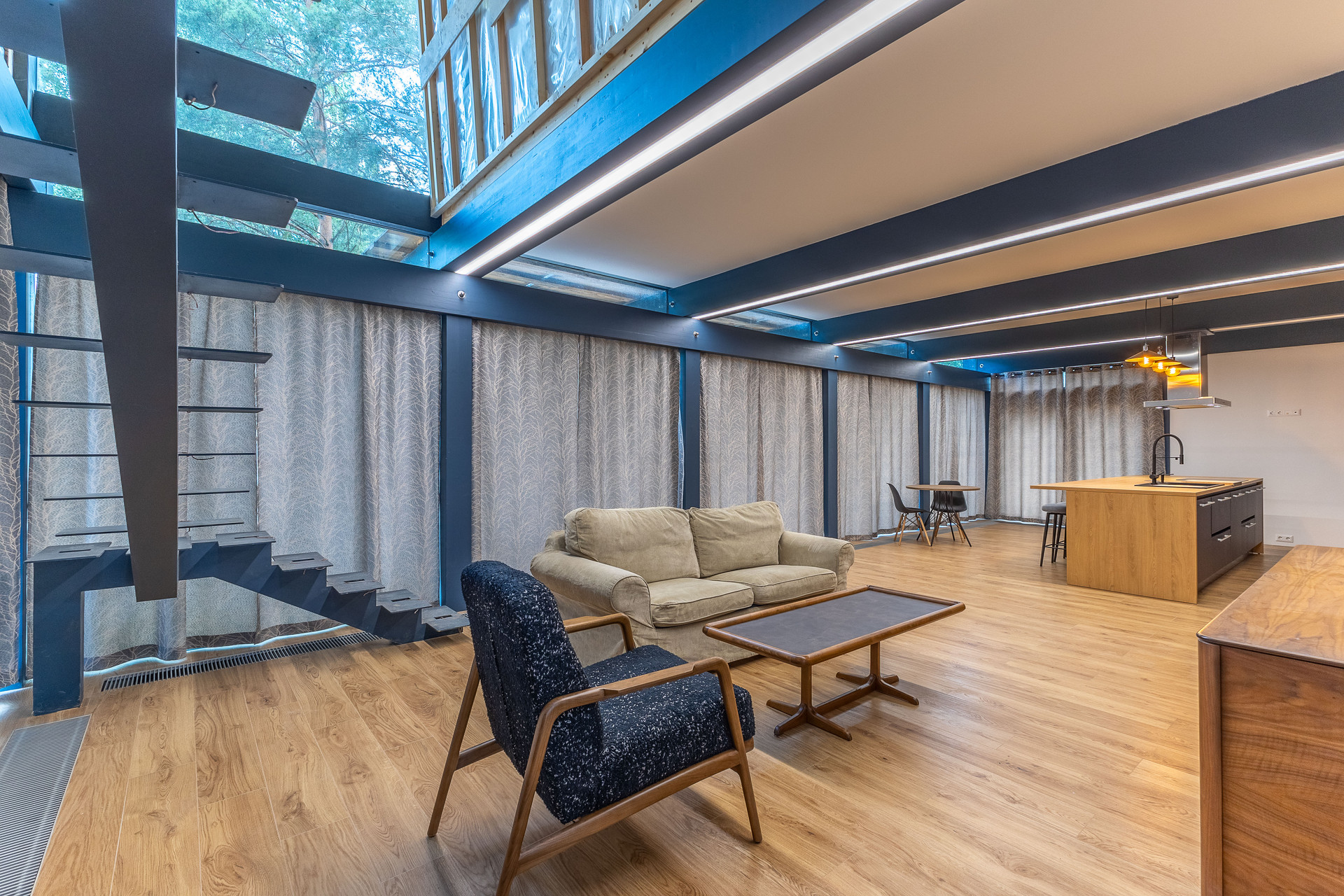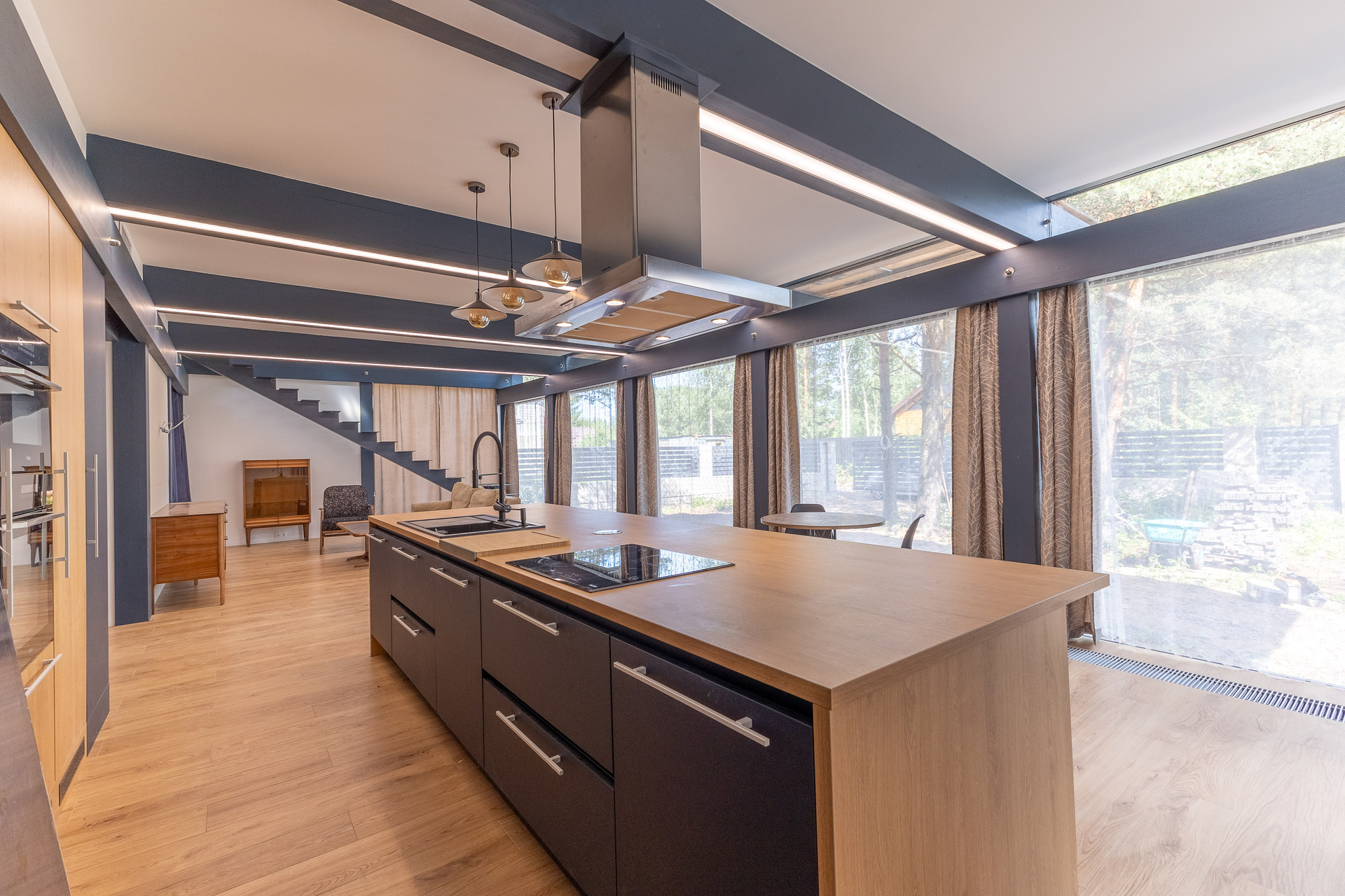 - На первом этаже расположена просторная кухня-гостиная площадью 56 м².