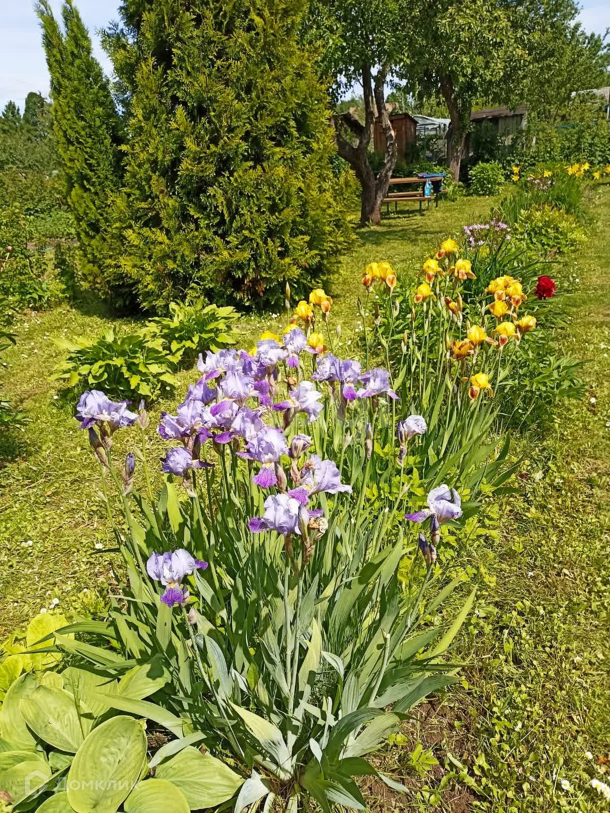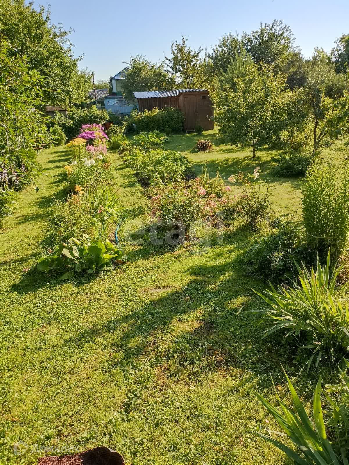 Участок прямоугольный, постоянно выкашивается, используется больше для отдыха. Есть несколько грядок с посаженными цветами. Так же на участке есть плодоносящие деревья и кустарники.