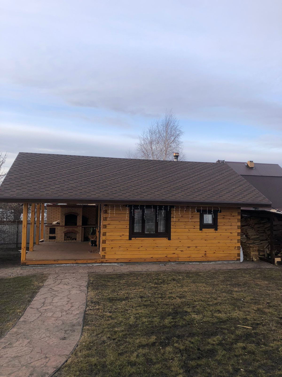 Стены дома – бревно, перекрытие-монолитная плита, крыша – мягкая черепица.