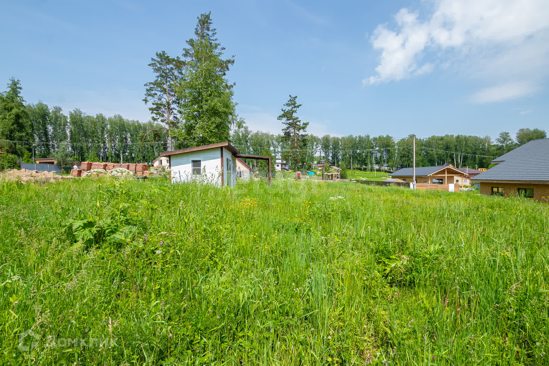 На участке есть постройка - каркасный дом 18 кв.м, с верандой 12 кв.м. Дом с большим панорамным окном с видом на участок, оборудован мебелью, есть бойлер. В дом заведено электричество, подключен к воде, установлены фильтры.