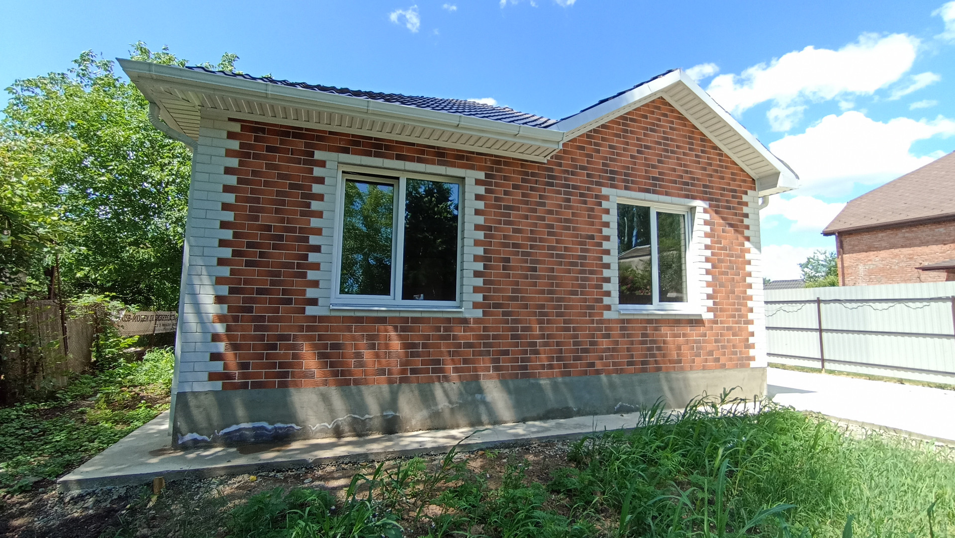 Возведен на ленточном фундаменте, материал стен — газоблок, утеплитель, облицован керамическим кирпичом, кровля — металлочерепица, потолки утеплены, металлопластиковые окна.