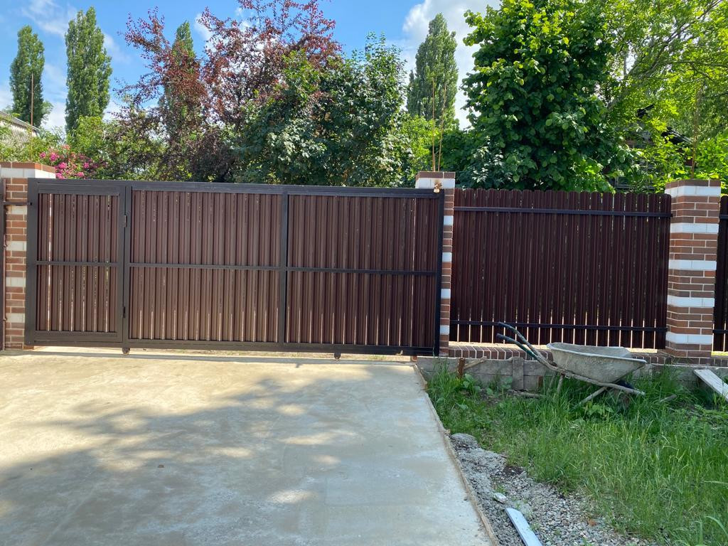 Двор забетонированный, забор из металлопрофиля с откатными воротами;