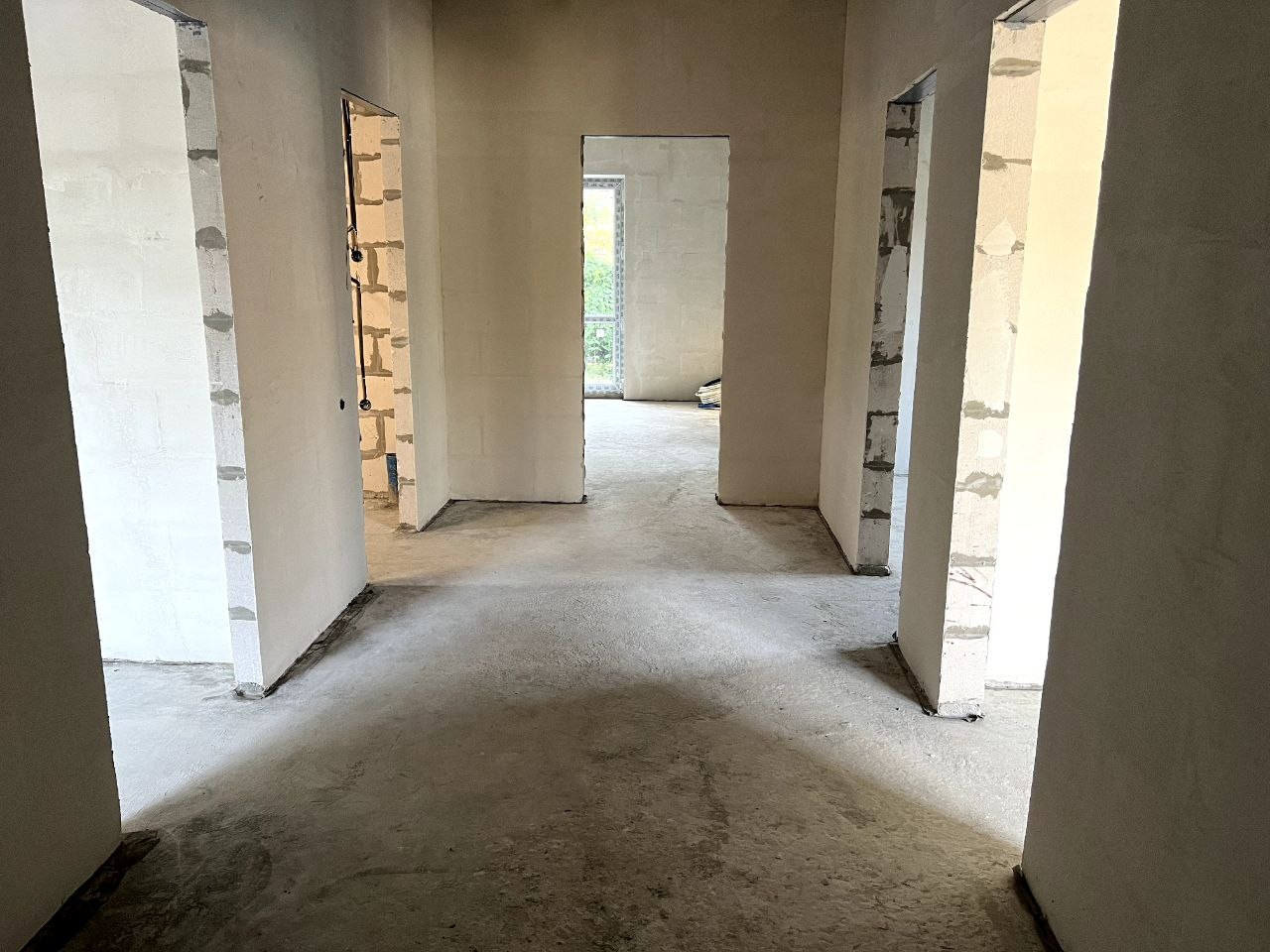 4 комнаты (в 2х из них-панорамные окна в пол), светлая кухня - гостиная 23 кв.м. (с которой также имеется выход во двор), широкий коридор и санузел. Потолок высотой 3 м.,  качественно утеплен. Подключены вода, канализация, септик, разводка розеток (счётчик день-ночь).