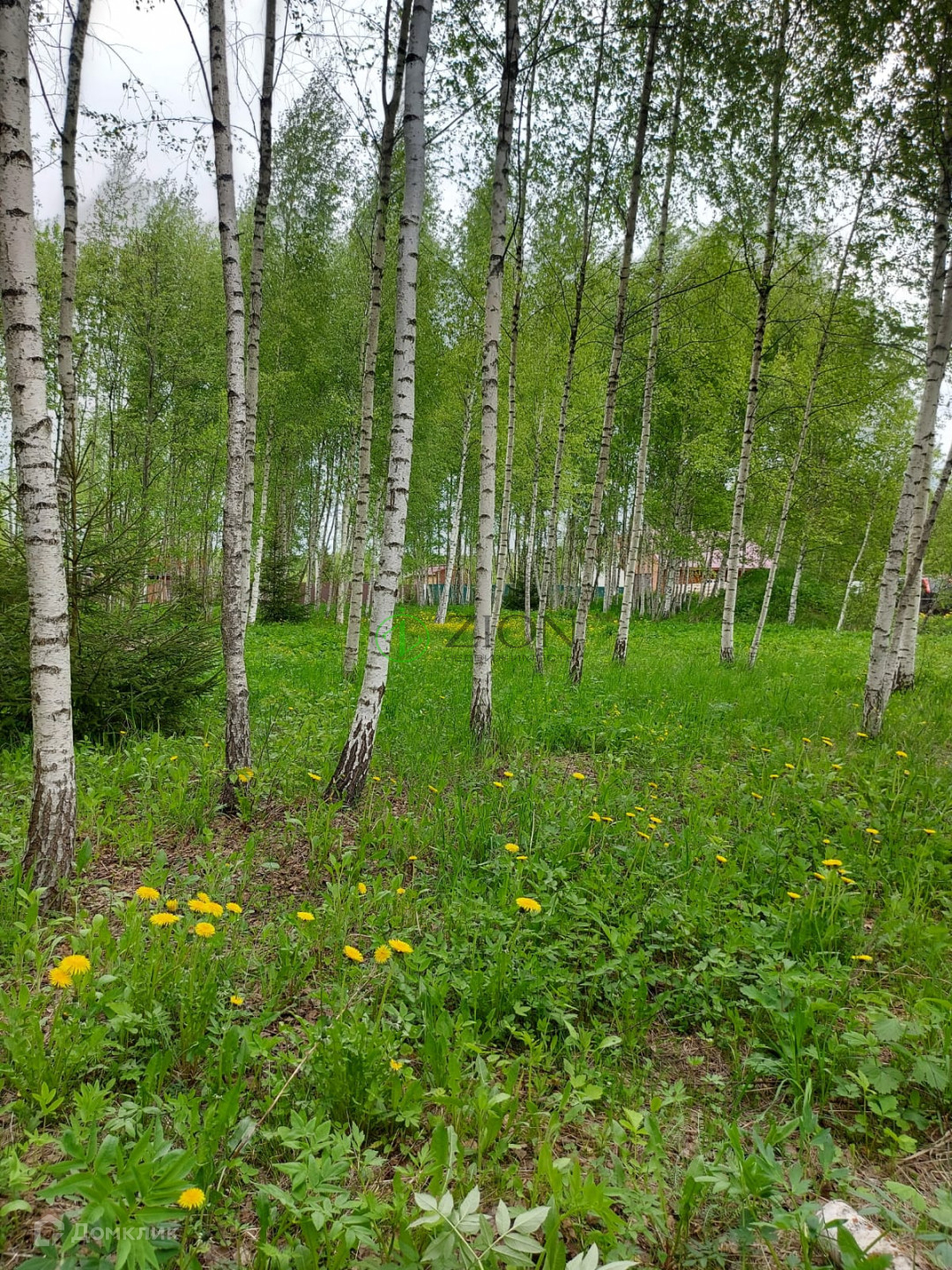 На участке дренаж, столбы для забора, лесные деревья, березы и ёлки.