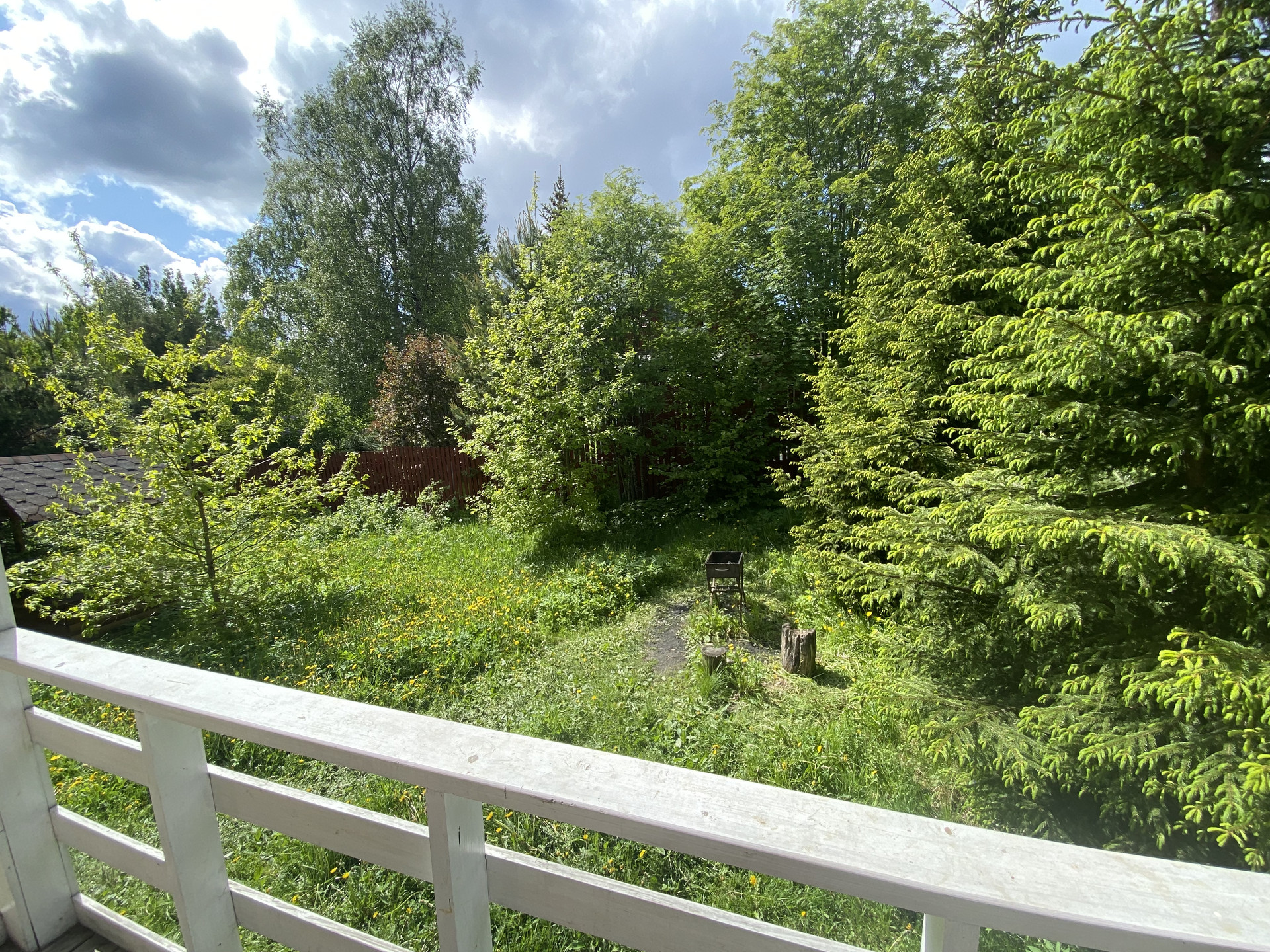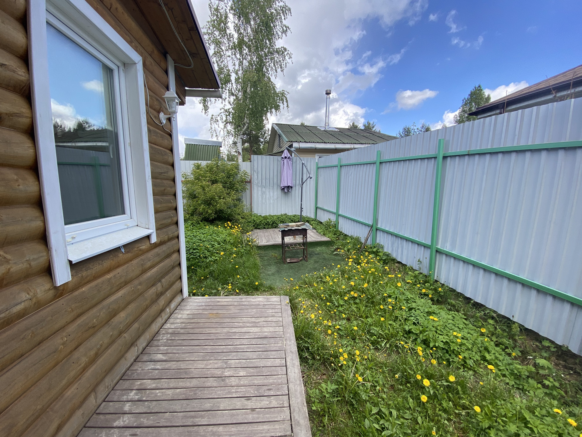 На участке большая песочница, качели. Многолетние цветы и кустарники, яблони.