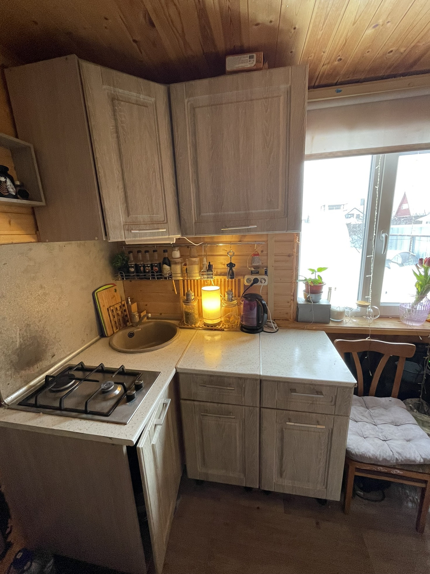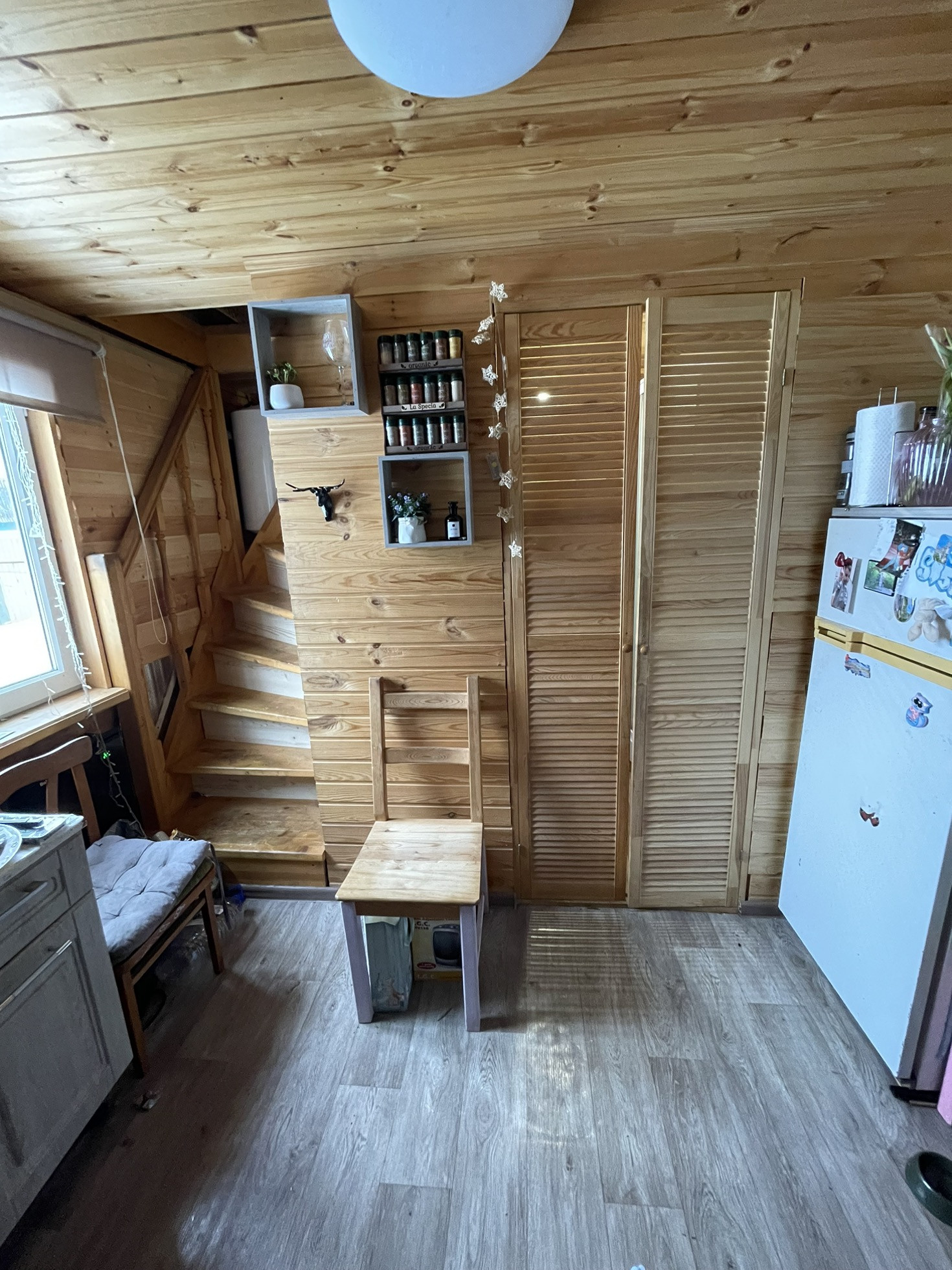 На первом этаже маленькая спальня ,кухня-прихожая,санузел-душевая,раковина ,туалет.