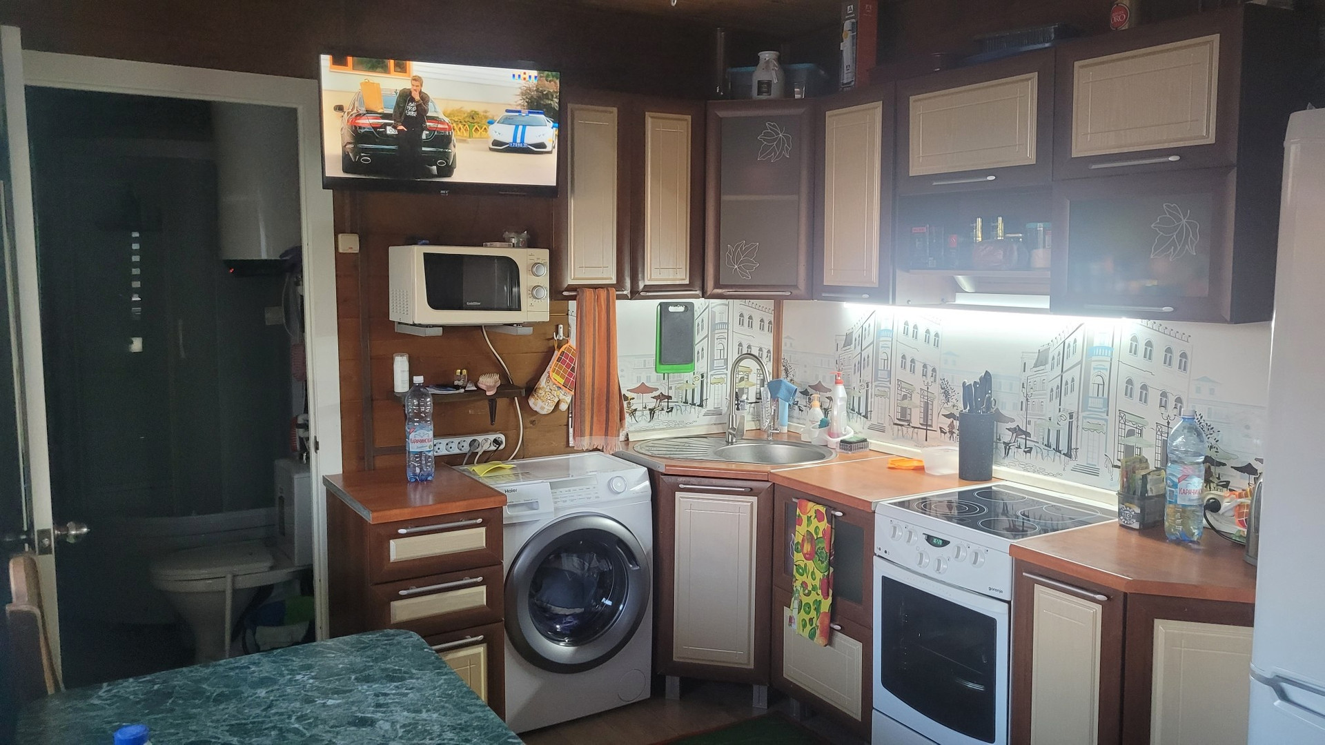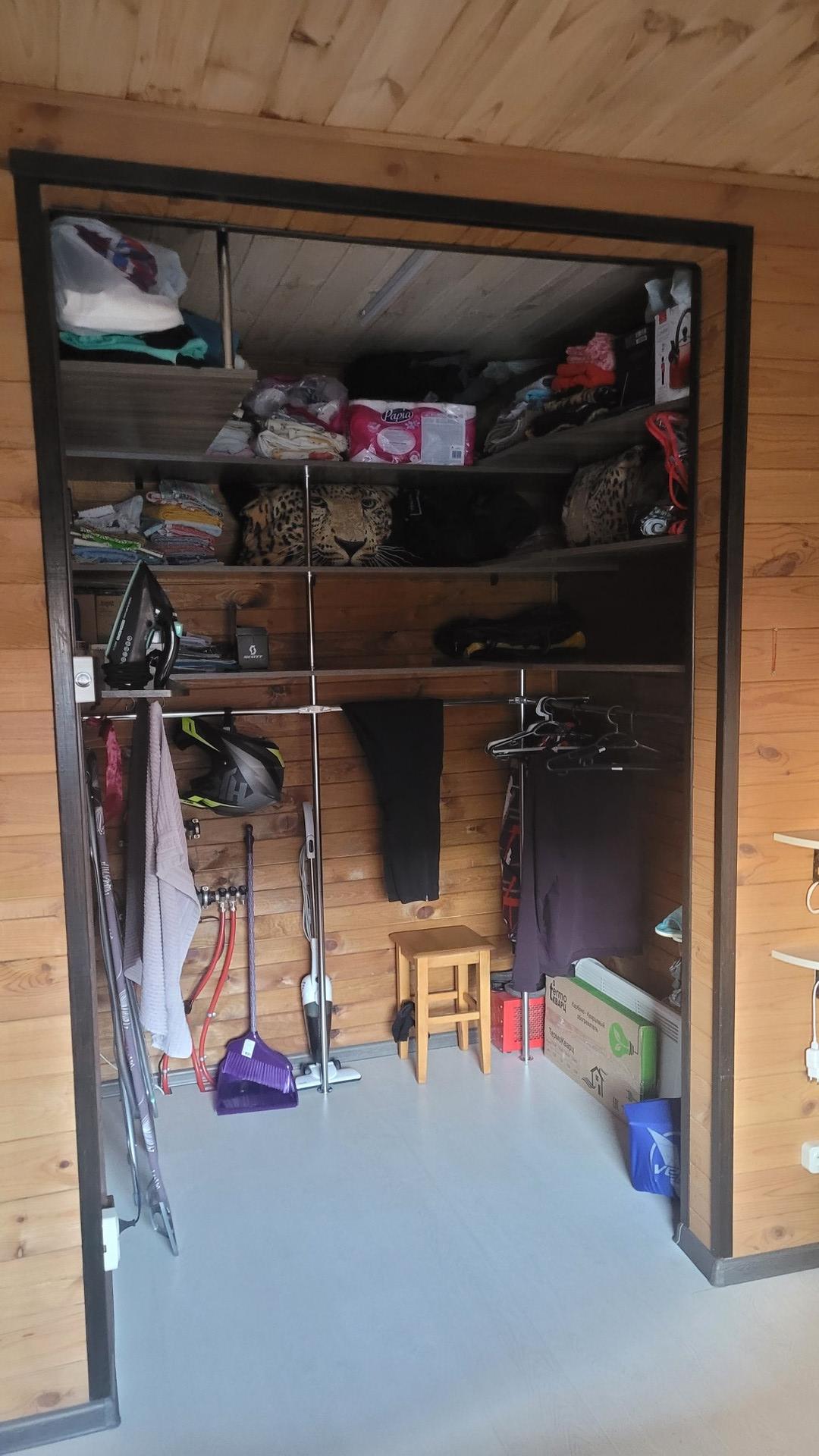 В доме душевая кабина, унитаз, вместительная гардеробная, кухонный гарнитур и