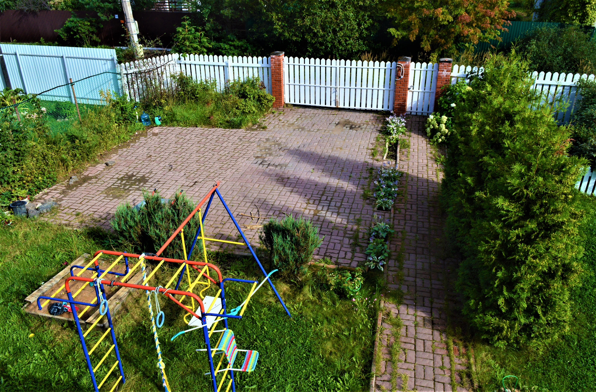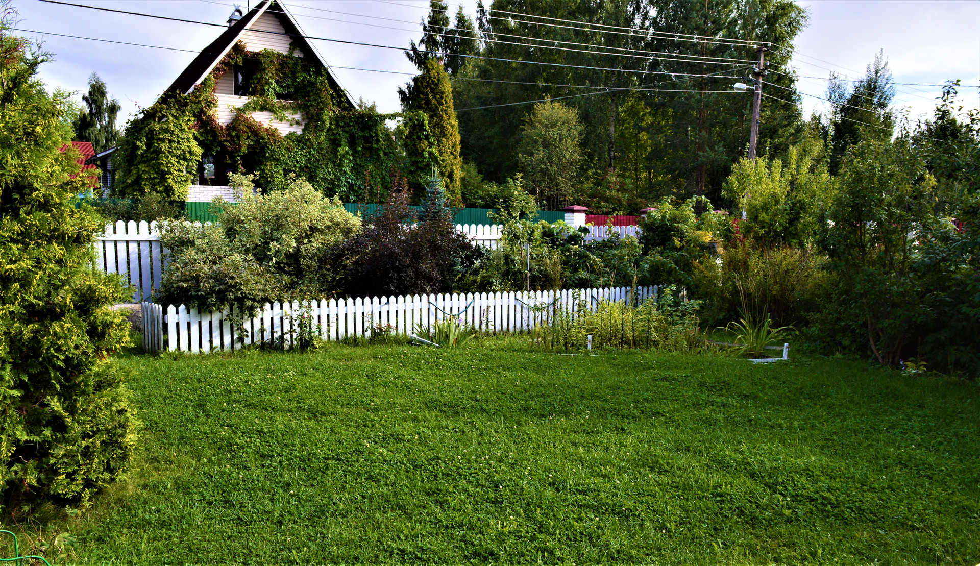 Участок 6.5 соток. Огорожен, ровный, сухой. На участке посажены декоративные деревья, растут плодоносящие садовые деревья (яблони, сливы), устроены клумбы с цветами, газон. Построен небольшой сарай для хранения садового инвентаря и рабочего инструмента.